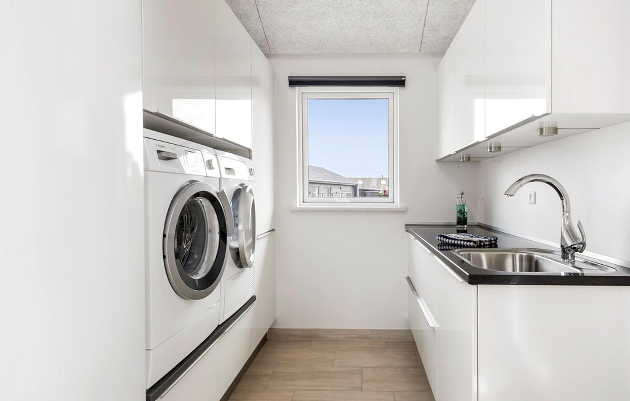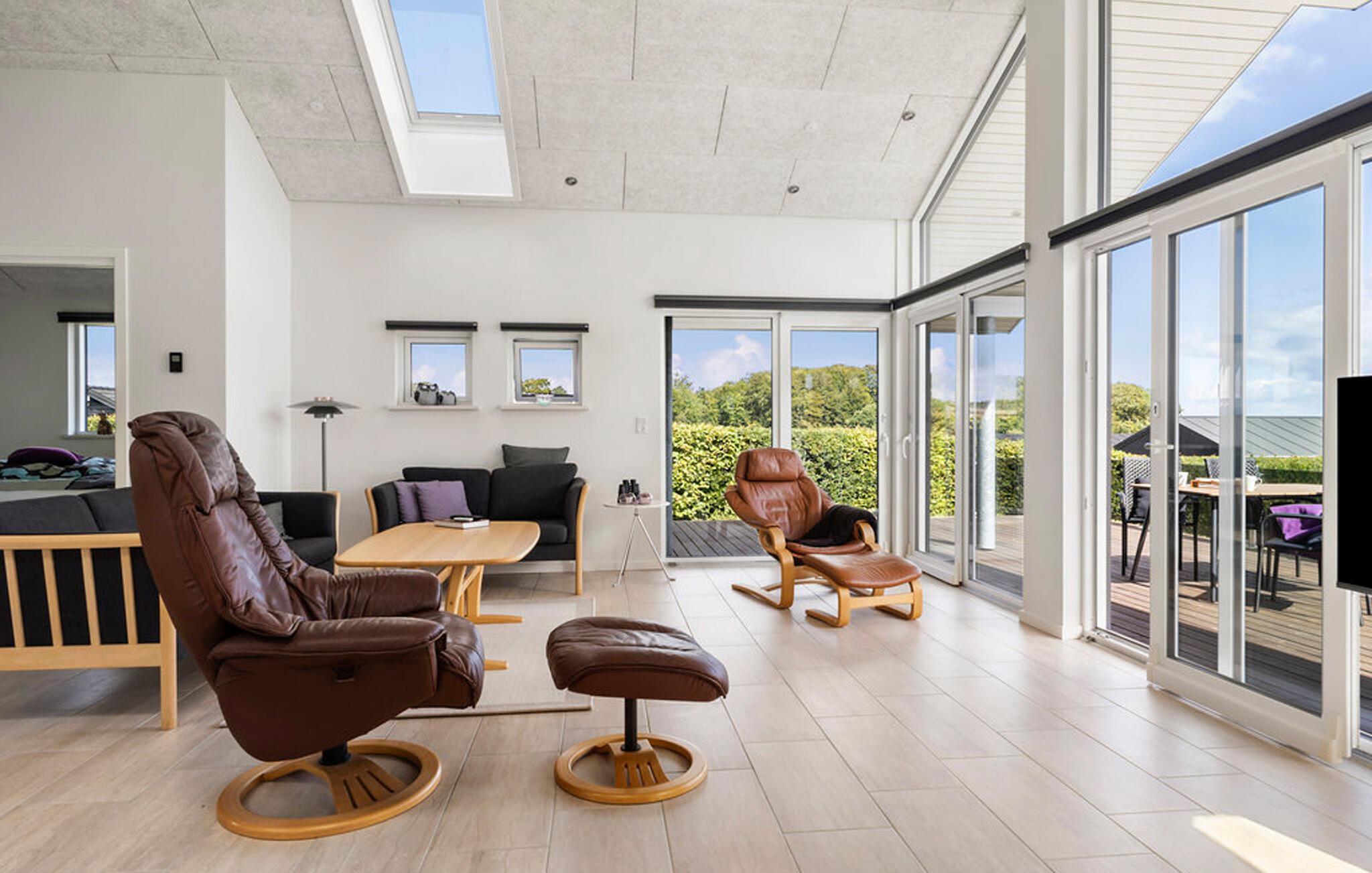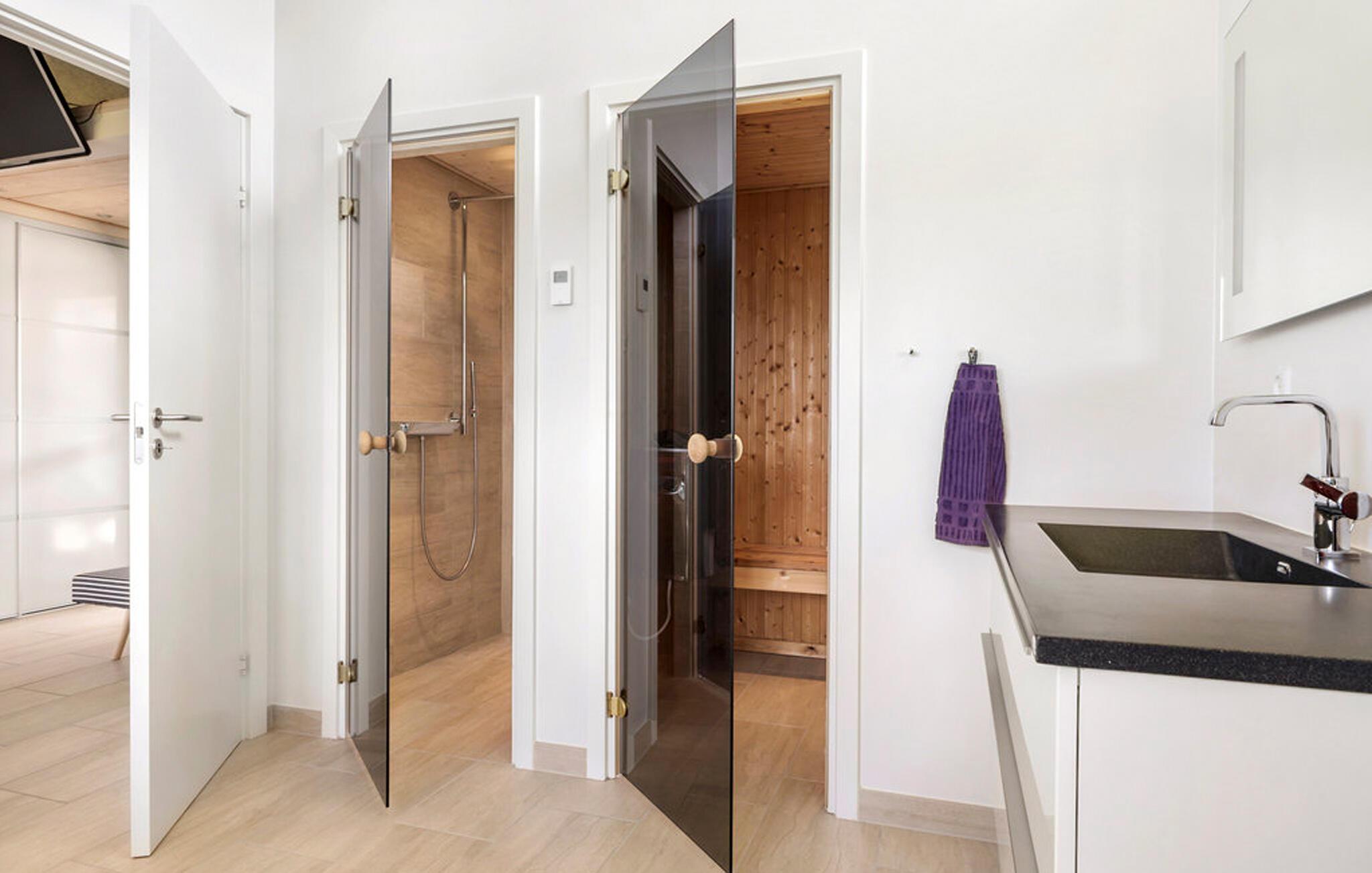 Dieses moderne Haus besticht nicht nur durch seine großen Fensterfronten, sondern auch durch seine entspannte Eleganz. Der lichtdurchflutete Wohnraum lädt zu gemütlichen Stunden auf dem Sofa ein, zu einem vergnügten Spielenachmittag oder zum gemeinsamen Kochen frischer Mahlzeiten. Wenn Sie mögen, entspannen Sie zudem Körper und Geist in der Sauna.