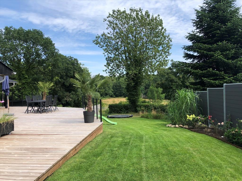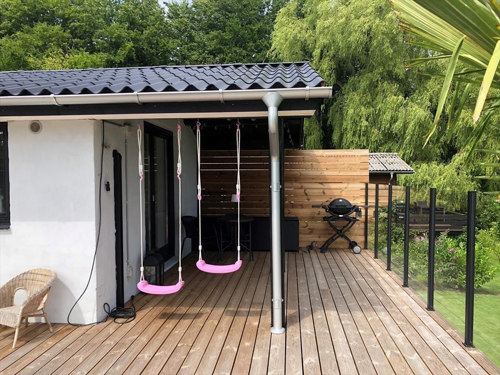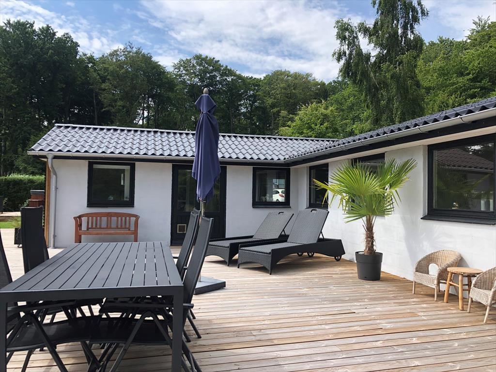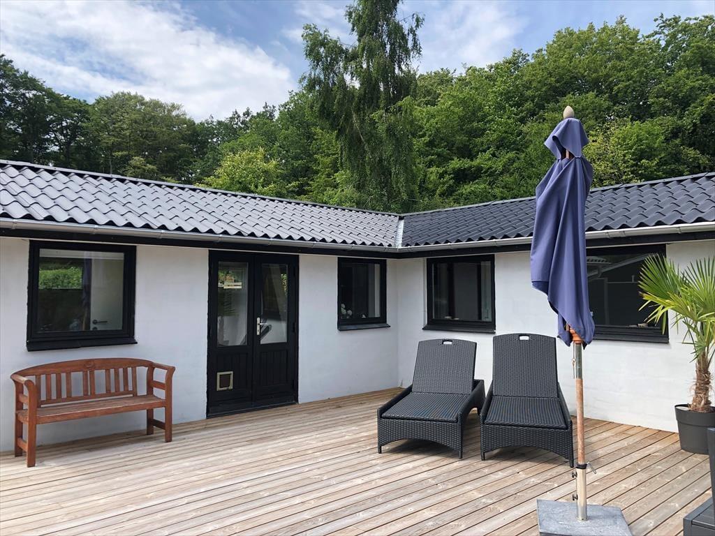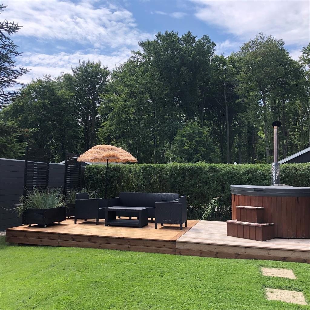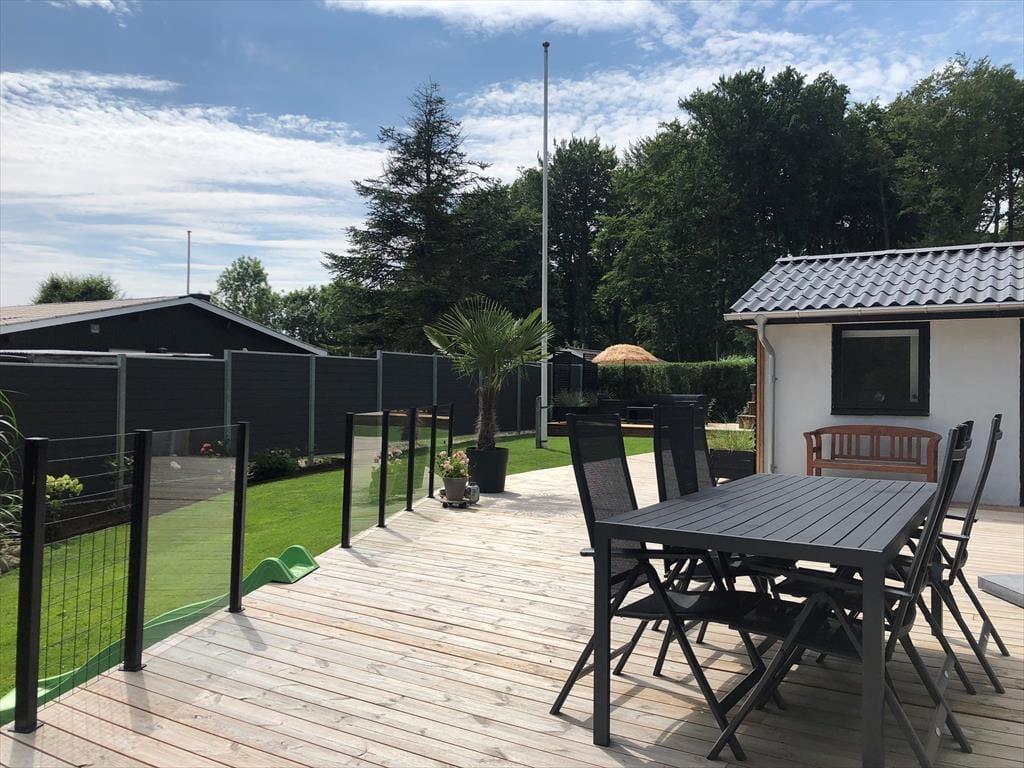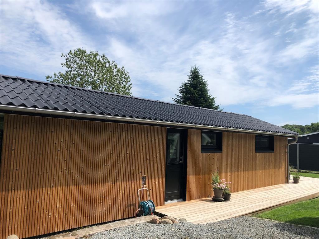 Træd ud på den store terrasse, og mærk straks den fredfyldte stemning, der kendetegner området omkring Kelstrup Strand. Her kan du starte dagen med morgenkaffen, mens disen letter over engen, og du kan slutte den med et glas vin i vildmarksbadet under åben himmel. Terrassen indbyder til både solbadning, fælles middage og stille stunder, hvor du bare kan nyde naturens lyde. Den omgivende have er enkel og grøn, og fra huset er der kun en kort gåtur til både strand og skov, hvor du kan tage en frisk dukkert, lufte hunden eller blot gå en tur i det bløde sand. Her leves livet i takt med naturens rytme – præcis som et ferieophold ved den jyske østkyst skal være.