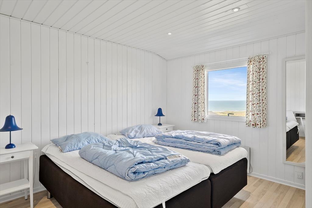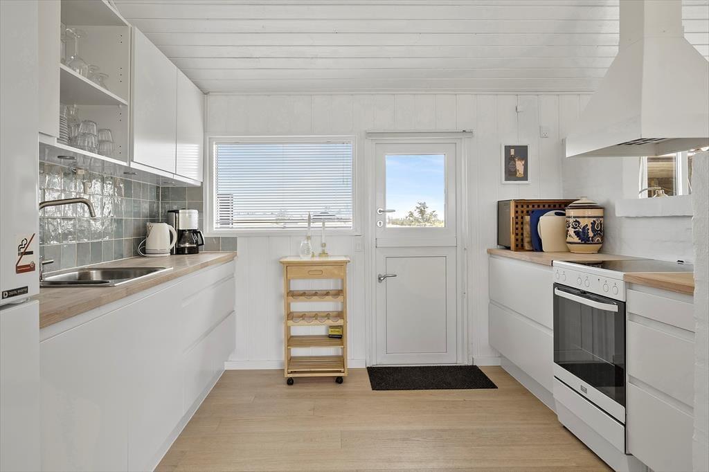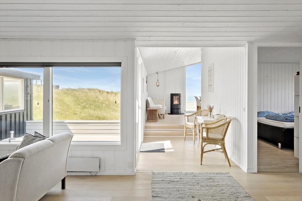 Der Blick auf die Nordsee beeindruckt besonders vom Esszimmer, da das Wohnzimmer am westlichsten Teil des Hauses liegt und mit einer großen Fensterfront ausgestattet ist, die freien Blick auf die tosenden Wellen des Meeres und das Dünengras bietet. Das Esszimmer ist zudem ein paar Stufen höher als der restliche Wohnbereich, der aus einer offenen Küche und einem Wohnzimmer besteht. Überall ist die Atmosphäre hell, da Wände und Decken frisch gestrichen wurden und auch neue Böden im Jahr 2020 verlegt wurden. Im Wohnbereich gibt es außerdem einen Kaminofen und eine Wärmepumpe, und auf dem Smart-TV ist Chromecast verfügbar. Ein Doppel-Schlafsofa ist ebenfalls hier, und es dient als gute Ergänzung zu den vier Schlafplätzen in den Schlafzimmern. Schließlich bietet der Grundriss ein geräumiges Badezimmer mit Dusche, Fußbodenheizung und Waschmaschine.