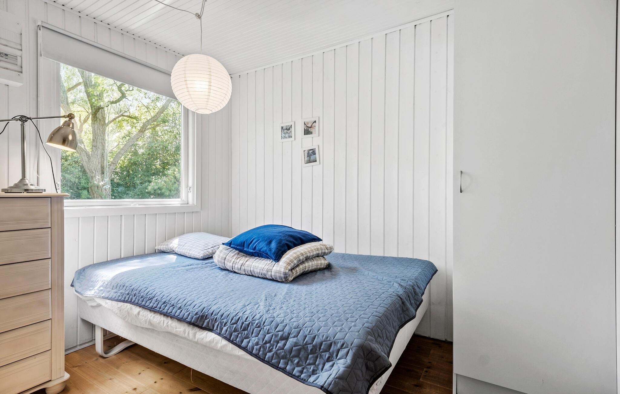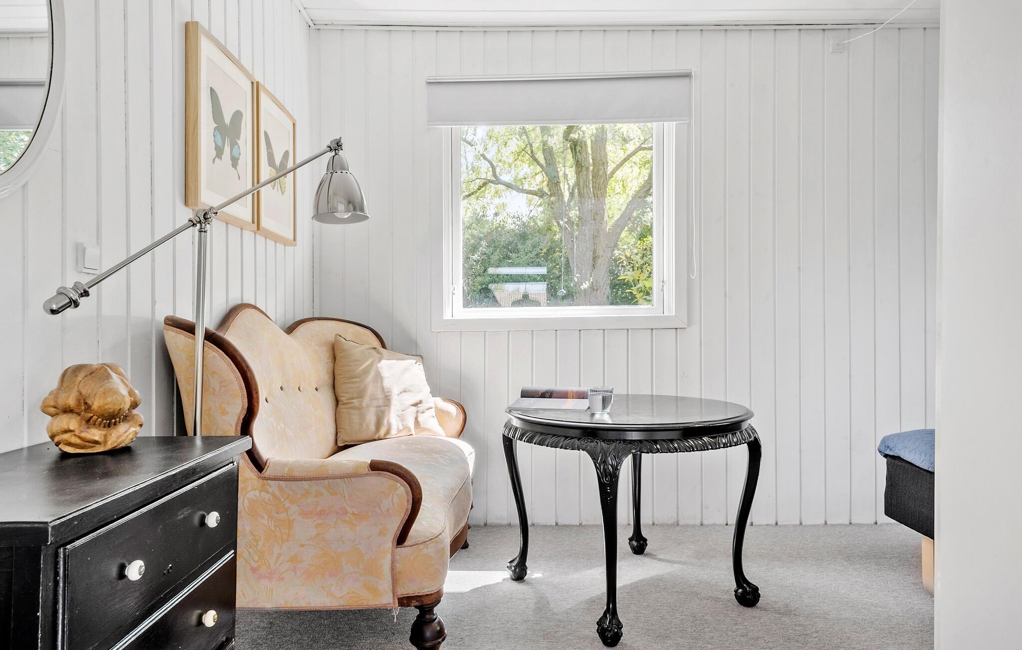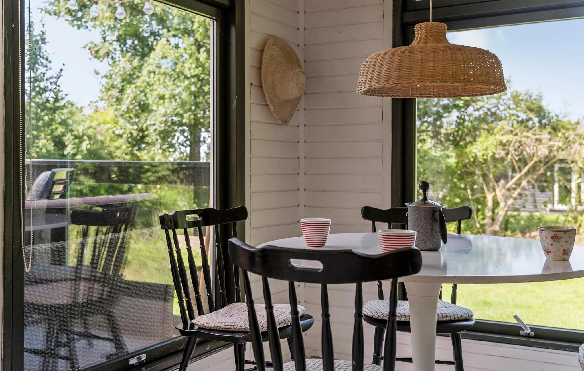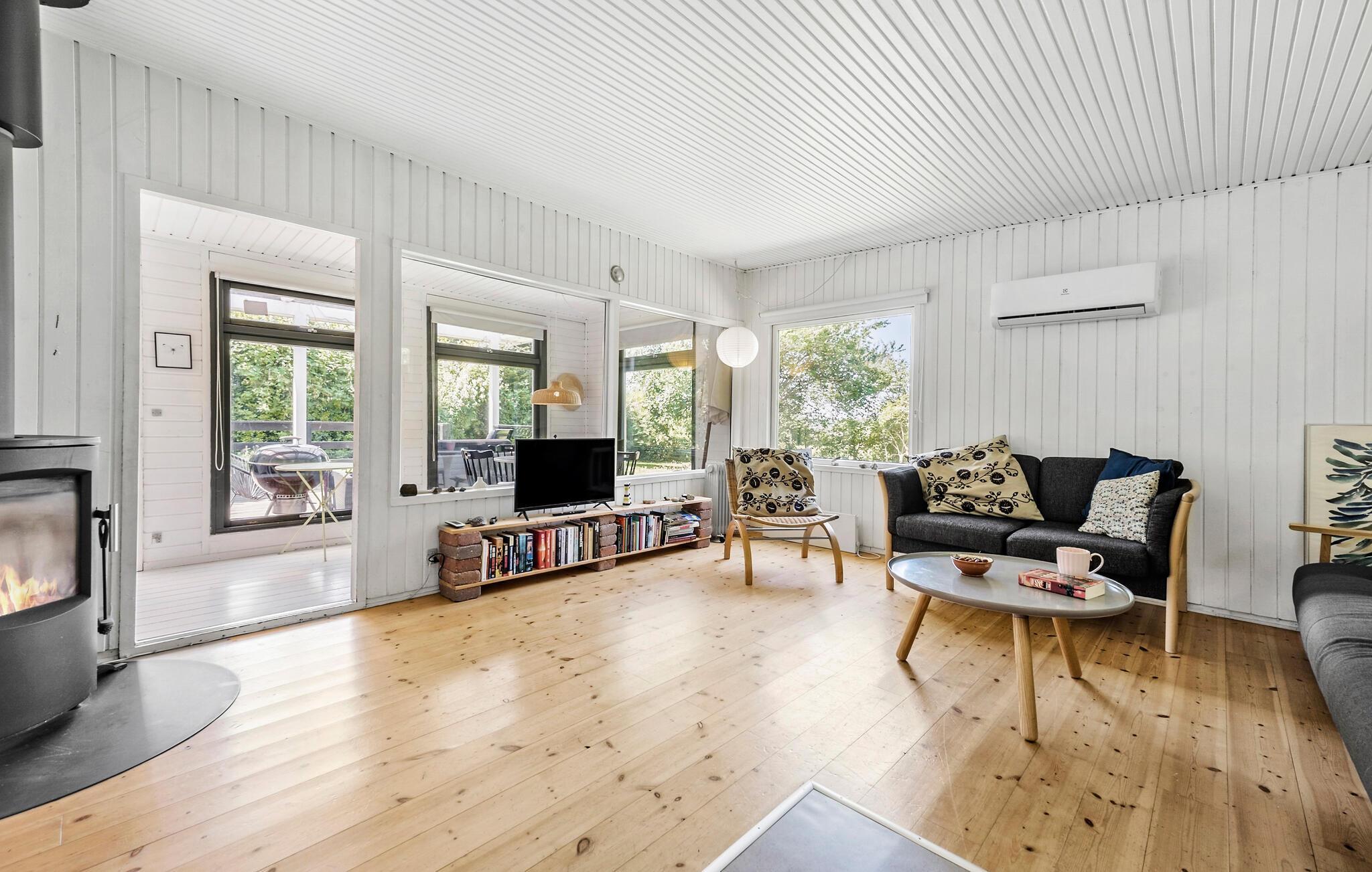 Ihr Ferienhaus liegt eingebettet in eine grüne Oase nahe dem Lammefjord. Die geschützte Lage und das wohnliche Ambiente bieten gute Voraussetzungen für Ruhe und Erholung. Genießen Sie im hellen Wohnbereich das Spiel des Feuers im Kaminofen oder blättern Sie durch ein Buch aus dem Regal. Die großen Fenster sorgen für ein luftiges Raumgefühl und einen schönen Blick ins Grüne. Bereiten Sie in der offenen Küche mit hellen Fronten und Holzarbeitsplatte Ihre Mahlzeiten zu. Der angrenzende Wintergarten lädt zum Frühstücken oder zum Kartenspielen ein, auch bei wechselhaftem Wetter.
