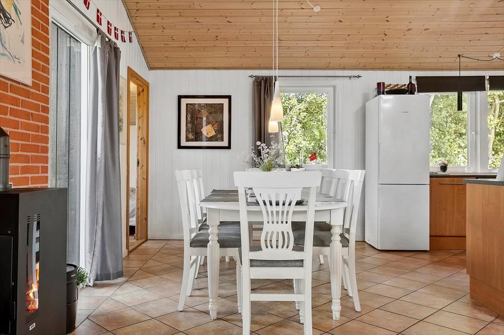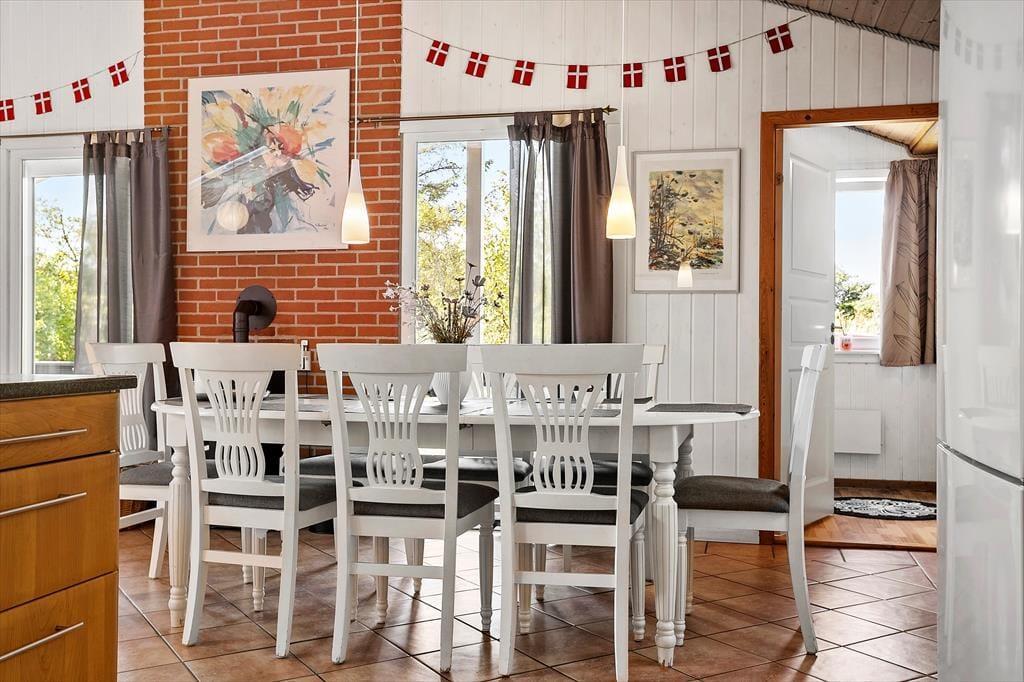 Dieses charmante Ferienhaus in der Hannesvej 24 bietet den perfekten Rahmen für einen Urlaub, bei dem Entspannung und Gemütlichkeit im Vordergrund stehen. Das Haus ist liebevoll eingerichtet, mit warmen Farben und durchdachten Details, die Ruhe und Nähe fördern. Draußen erwartet Sie ein wunderschöner Garten und mehrere Terrassen, sowohl offene als auch überdachte, auf denen Sie die Sonne genießen, ein gutes Buch lesen oder mit der Familie eine Mahlzeit unter freiem Himmel einnehmen können. Für Familien mit Kindern gibt es zusätzlich Freude, da nur 50 Meter vom Haus entfernt ein schöner Spielplatz liegt. Die Lage ist ideal – nur 250 Meter vom Strand entfernt – sodass Sie das Rauschen der Wellen hören und den Sand zwischen den Zehen spüren können, während Sie sich auf der Terrasse niederlassen.