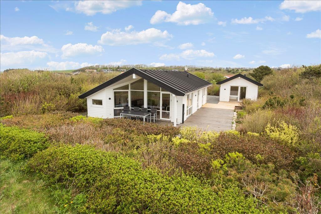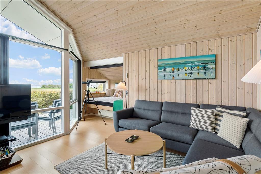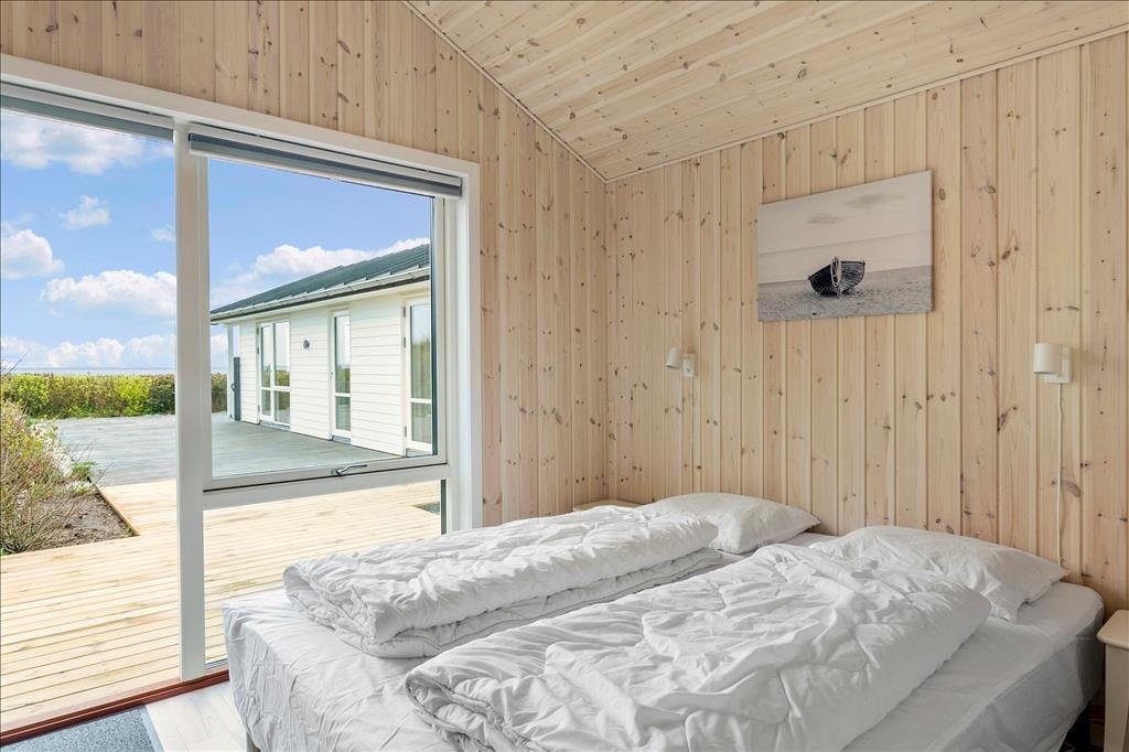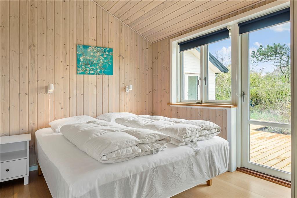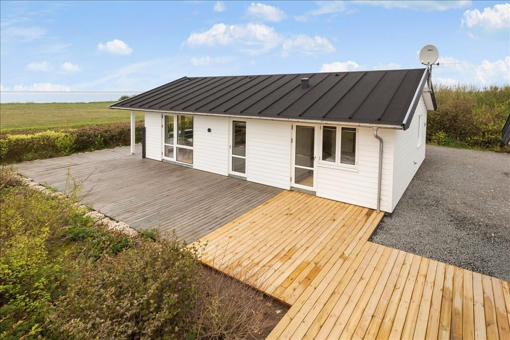 Das Ferienhaus ist mit einem schönen Schlafzimmer mit Doppeltbett und zwei Schränken eingerichtet. Darüber hinaus ist ein kleines Schlafzimmer mit einem Schlafsofa und zwei Schränken vorhanden. In Verbindung mit dem Wohnzimmer befindet sich eine Schlafnische mit zwei weiteren Schlafmöglichkeiten. Im Frühjahr 2021 wurde darüber hinaus ein sehr schöner Anbau errichtet wo Sie ein Zimmer mit einem Doppeltbett und ein eigenes Badezimmer haben. Das Ferienhaus wird insgesamt jedoch nur für sechs Personen vermietet. Gutes Badezimmer mit Fußbodenheizung und Waschmaschine. Moderne Küche ebenfalls mit Fußbodenheizung und u. a. mit Geschirrspüler, die offen in das Wohnzimmer integriert ist. Komfortabel eingerichtetes Wohnzimmer mit Zugang zu einer großen Terrasse, die im Süden und Westen das Haus umgibt. Große Panoramafenster auf der Südseite mit tollem Lichteinfall, und das ist der wunderbarste Ausblick über den Limfjord und ganz nach Thyborøn und Agger an der dänischen Nordseeküste. Außerdem können Sie vom Ferienhaus die Nordsee sehen und die großen vorbeifahrenden Schiffe beobachten.