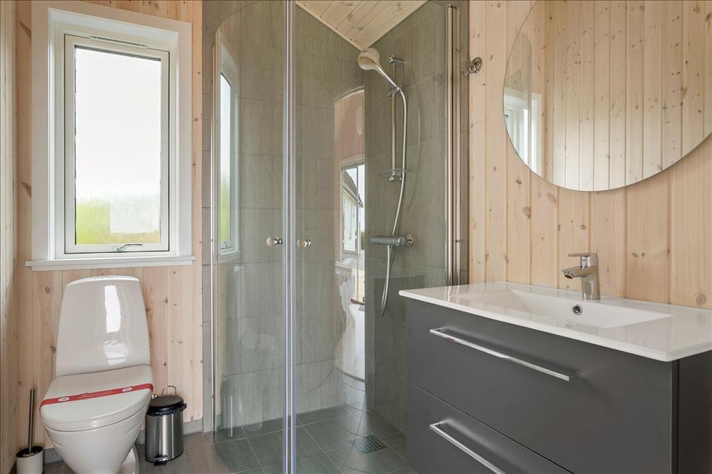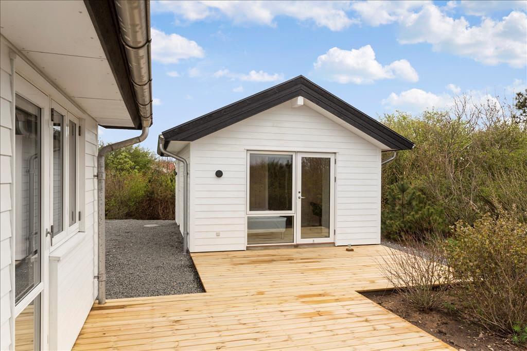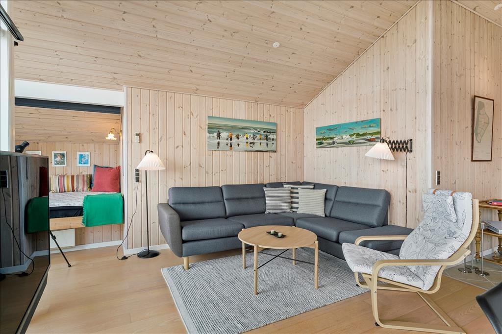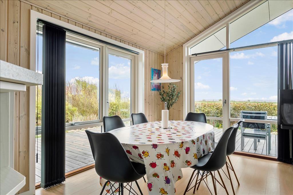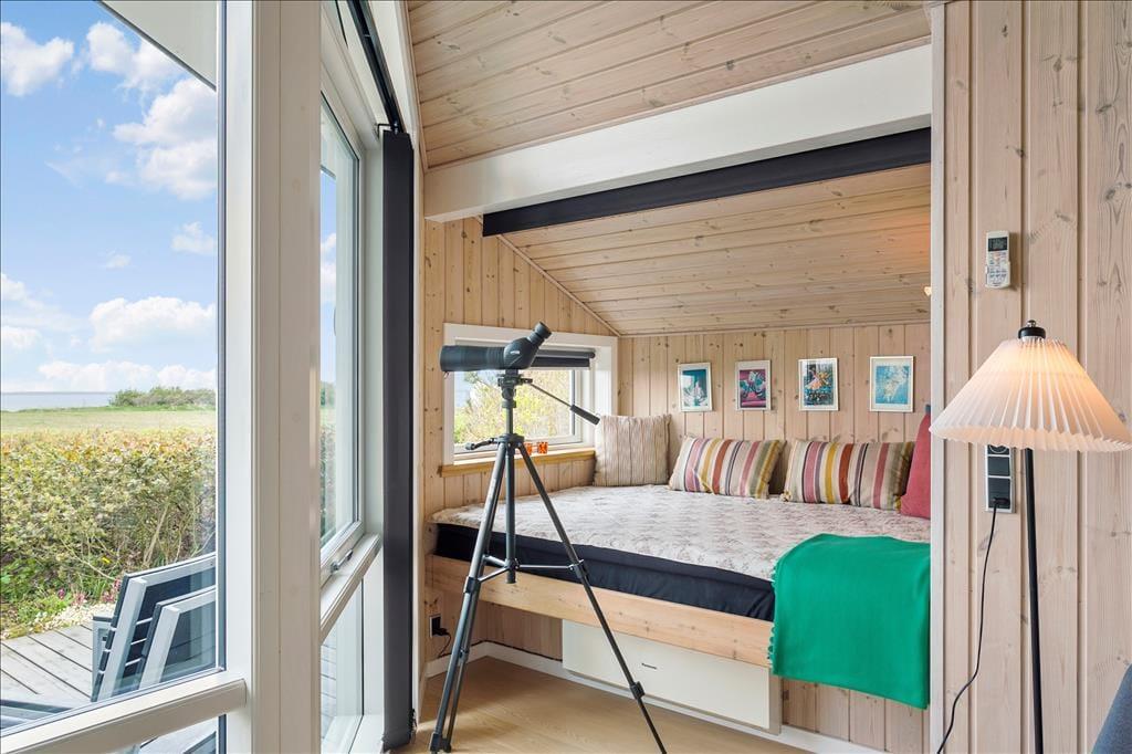 Das Ferienhaus ist mit einem schönen Schlafzimmer mit Doppeltbett und zwei Schränken eingerichtet. Darüber hinaus ist ein kleines Schlafzimmer mit einem Schlafsofa und zwei Schränken vorhanden. In Verbindung mit dem Wohnzimmer befindet sich eine Schlafnische mit zwei weiteren Schlafmöglichkeiten. Im Frühjahr 2021 wurde darüber hinaus ein sehr schöner Anbau errichtet wo Sie ein Zimmer mit einem Doppeltbett und ein eigenes Badezimmer haben. Das Ferienhaus wird insgesamt jedoch nur für sechs Personen vermietet. Gutes Badezimmer mit Fußbodenheizung und Waschmaschine. Moderne Küche ebenfalls mit Fußbodenheizung und u. a. mit Geschirrspüler, die offen in das Wohnzimmer integriert ist. Komfortabel eingerichtetes Wohnzimmer mit Zugang zu einer großen Terrasse, die im Süden und Westen das Haus umgibt. Große Panoramafenster auf der Südseite mit tollem Lichteinfall, und das ist der wunderbarste Ausblick über den Limfjord und ganz nach Thyborøn und Agger an der dänischen Nordseeküste. Außerdem können Sie vom Ferienhaus die Nordsee sehen und die großen vorbeifahrenden Schiffe beobachten.