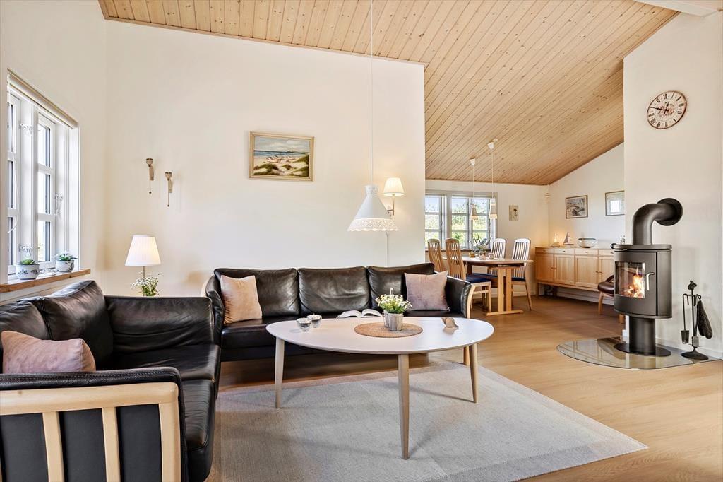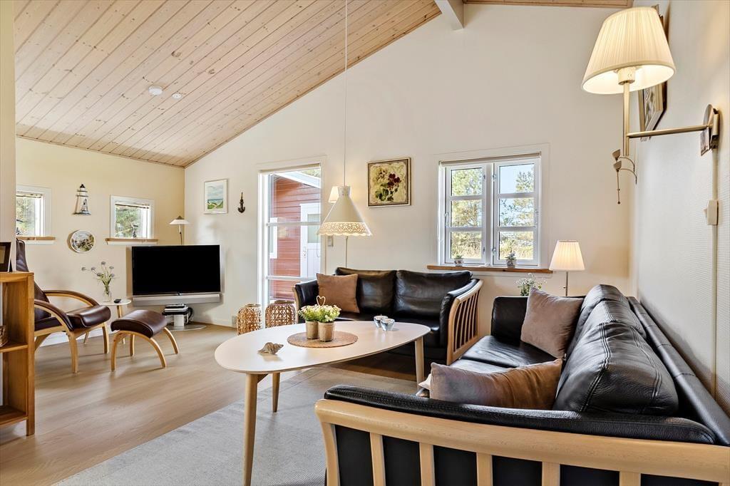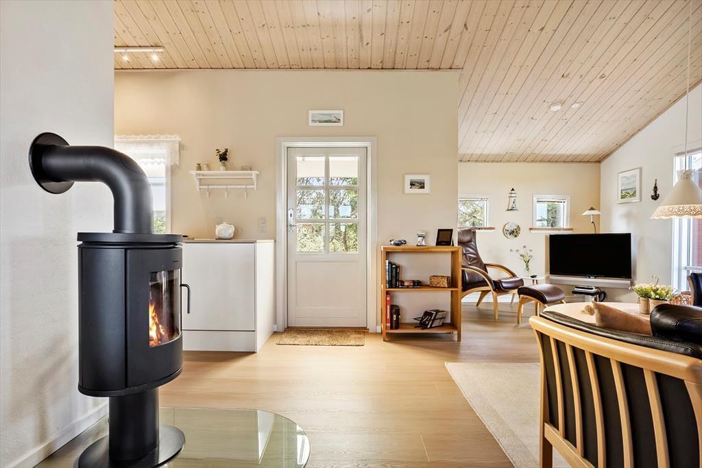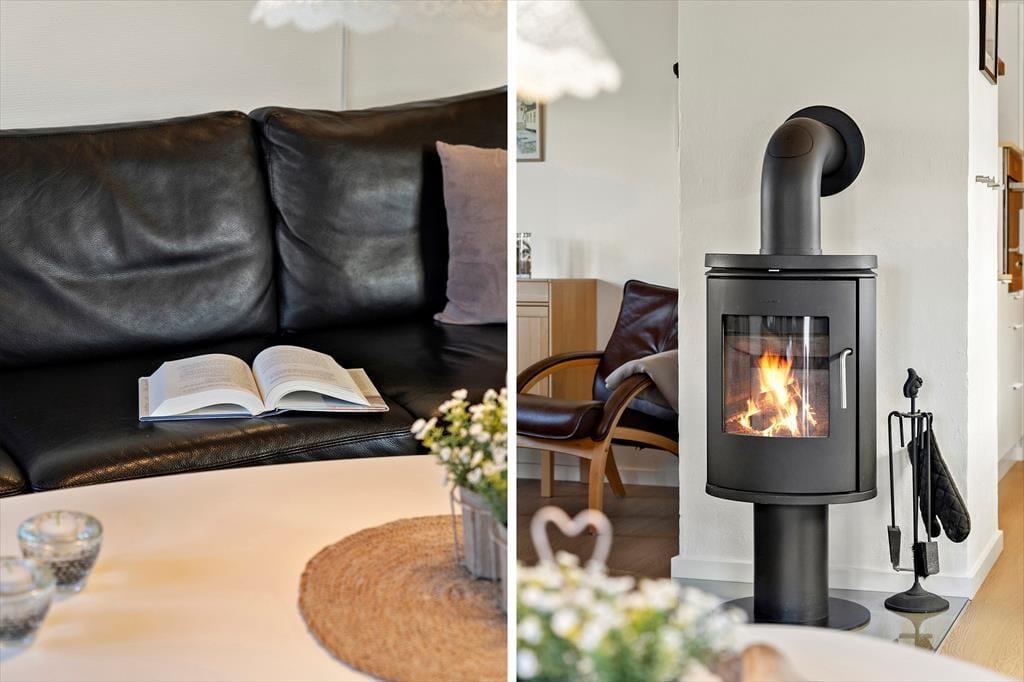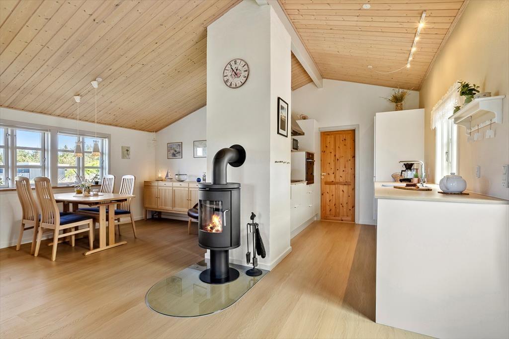 Innen wirst du von einem hellen und luftigen Ferienhaus empfangen, dessen Räume mit Fokus auf Gemütlichkeit und Funktionalität gestaltet sind. Das geräumige Wohnzimmer verfügt über große Fensterpartien, die die Natur näher bringen und eine fantastische Verbindung zwischen Innen- und Außenleben schaffen. Der Kaminofen in der Ecke sorgt für Wärme und Stimmung an Abenden, an denen du und deine Lieben gute Gespräche oder einen Film genießen könnt. Die offene Küche ist praktisch und modern, sodass es einfach ist, eine leckere Mahlzeit zuzubereiten, während Familie und Freunde sich im Wohnzimmer entspannen. Die Schlafzimmer laden zu Entspannung und Ruhe ein, und mit einem schönen Badezimmer habt ihr alles, was ihr für einen komfortablen Urlaub braucht.