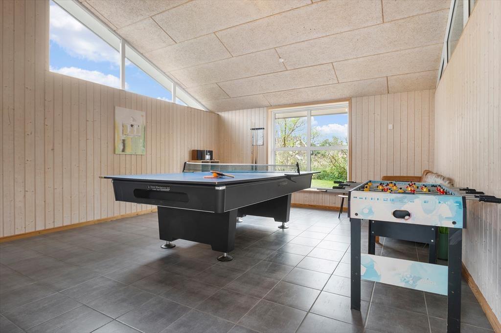 Dieses geräumige Ferienhaus ist perfekt für entspannte und gesellige Momente mit Ihren Lieben. Die Einrichtung ist hell und freundlich, und der offene Wohnbereich mit integrierter Küche bietet viel Platz für gemeinsame Zeit. Der Kamin sorgt für Wärme und Gemütlichkeit an kühleren Tagen. Ein Highlight des Hauses ist die einladende Poolabteilung, in der Groß und Klein das ganze Jahr über planschen und spielen können. Darüber hinaus erwartet Sie ein Aktivitätsraum mit Tischtennis und weiteren Spielen, die für unterhaltsame Familienwettbewerbe sorgen. Mehrere Schlafzimmer bieten ruhigen Schlaf für alle, und mit zwei Badezimmern eignet sich das Haus ideal für mehrere Generationen.