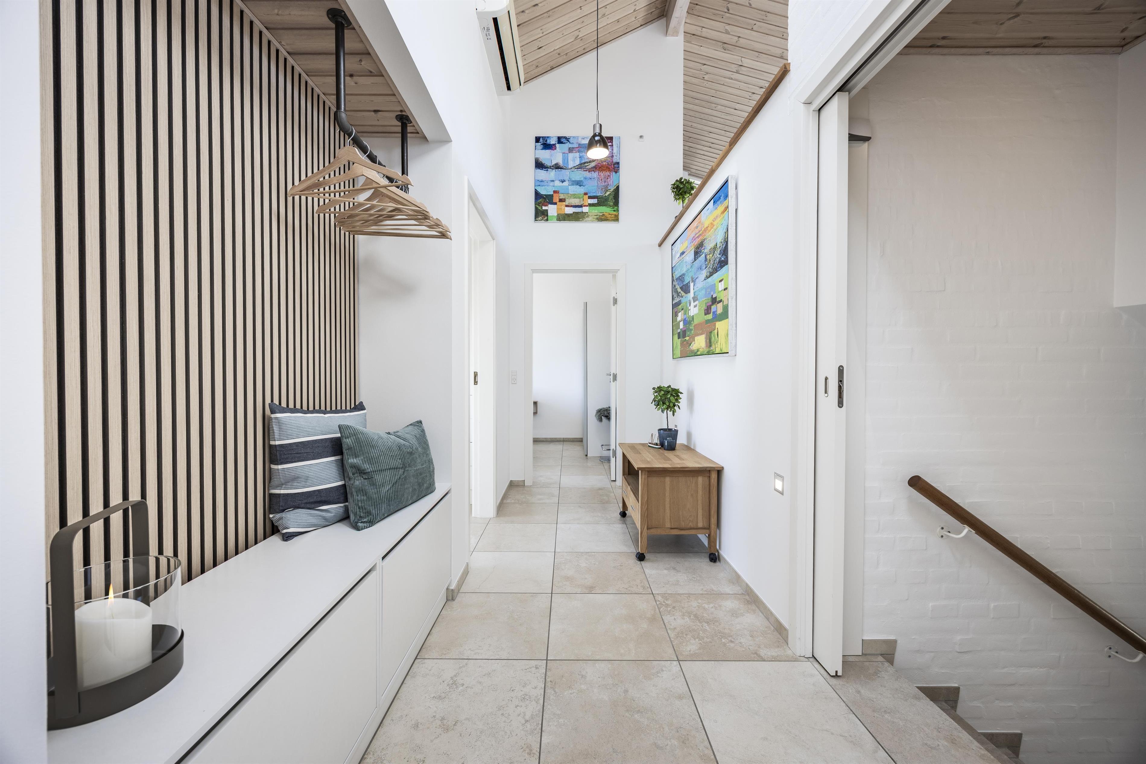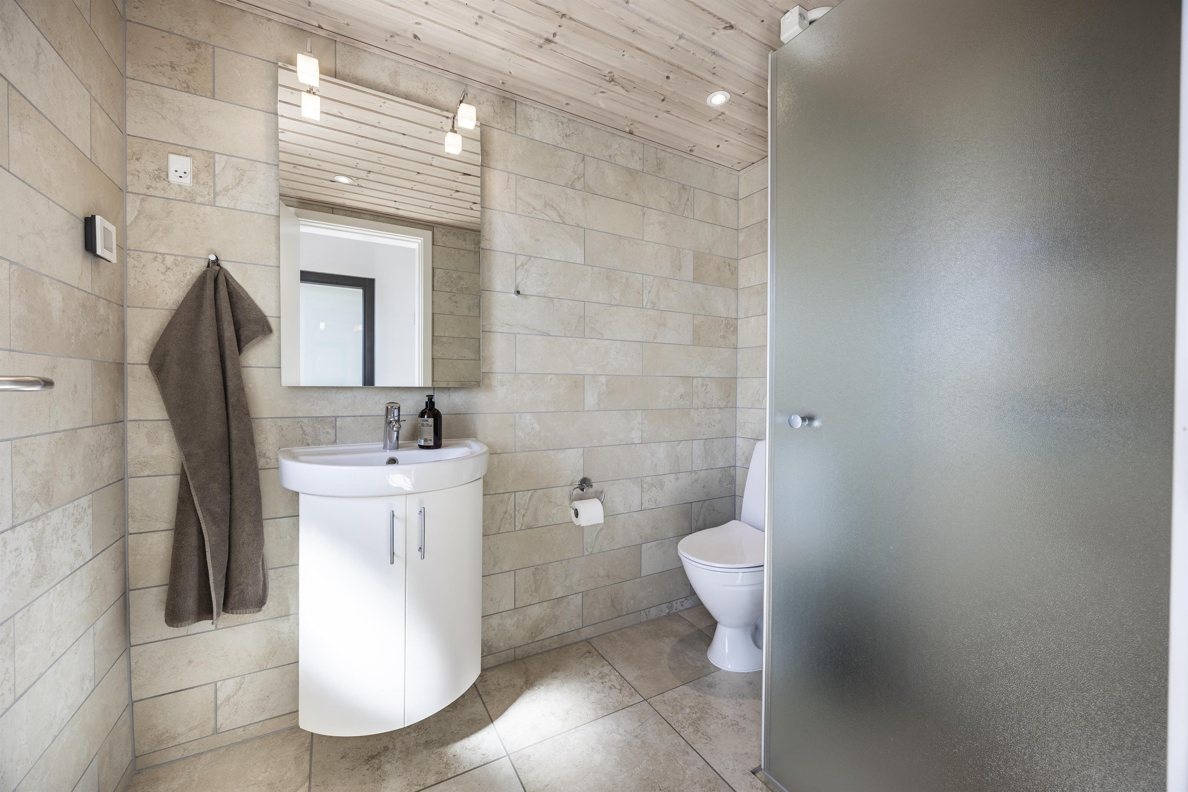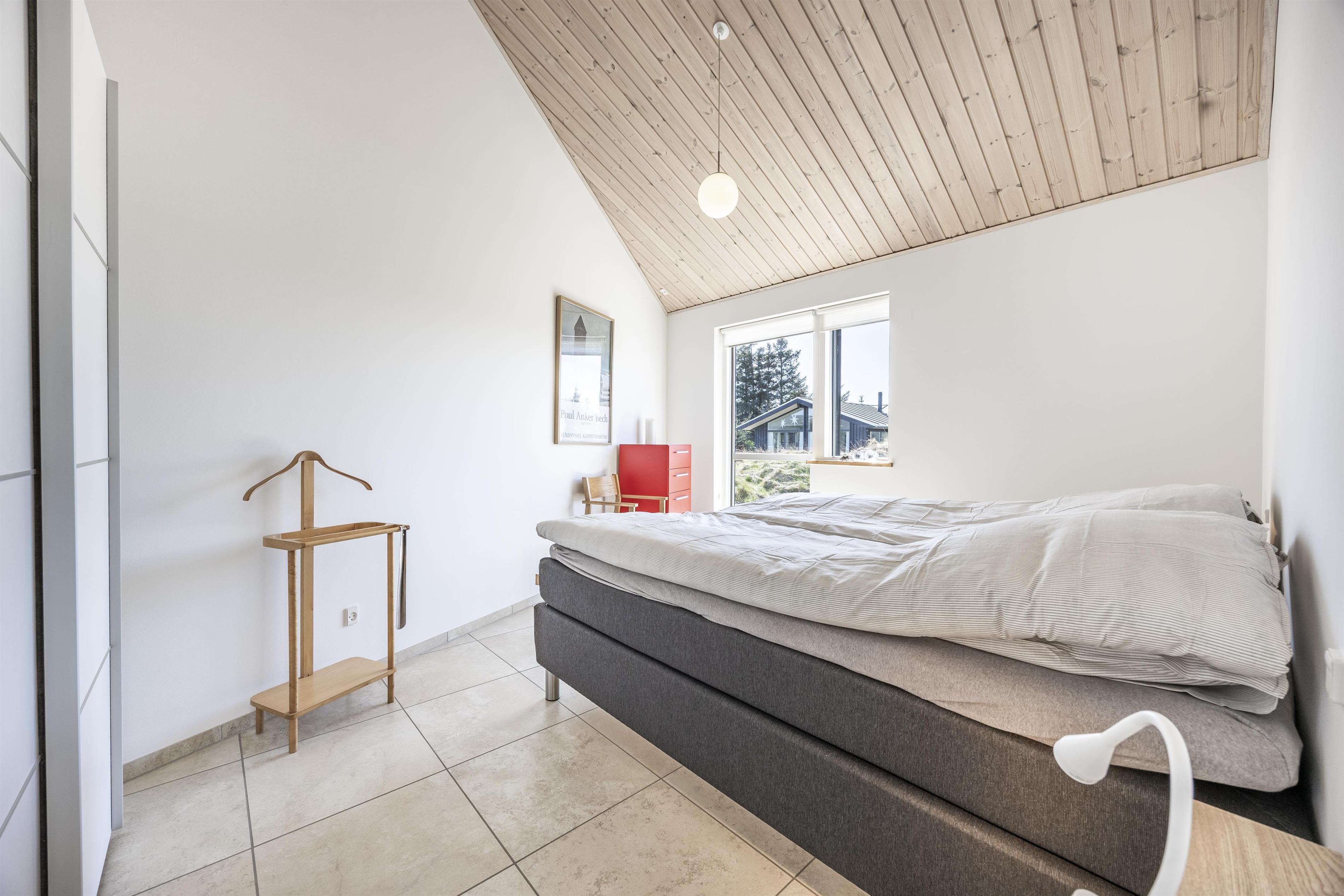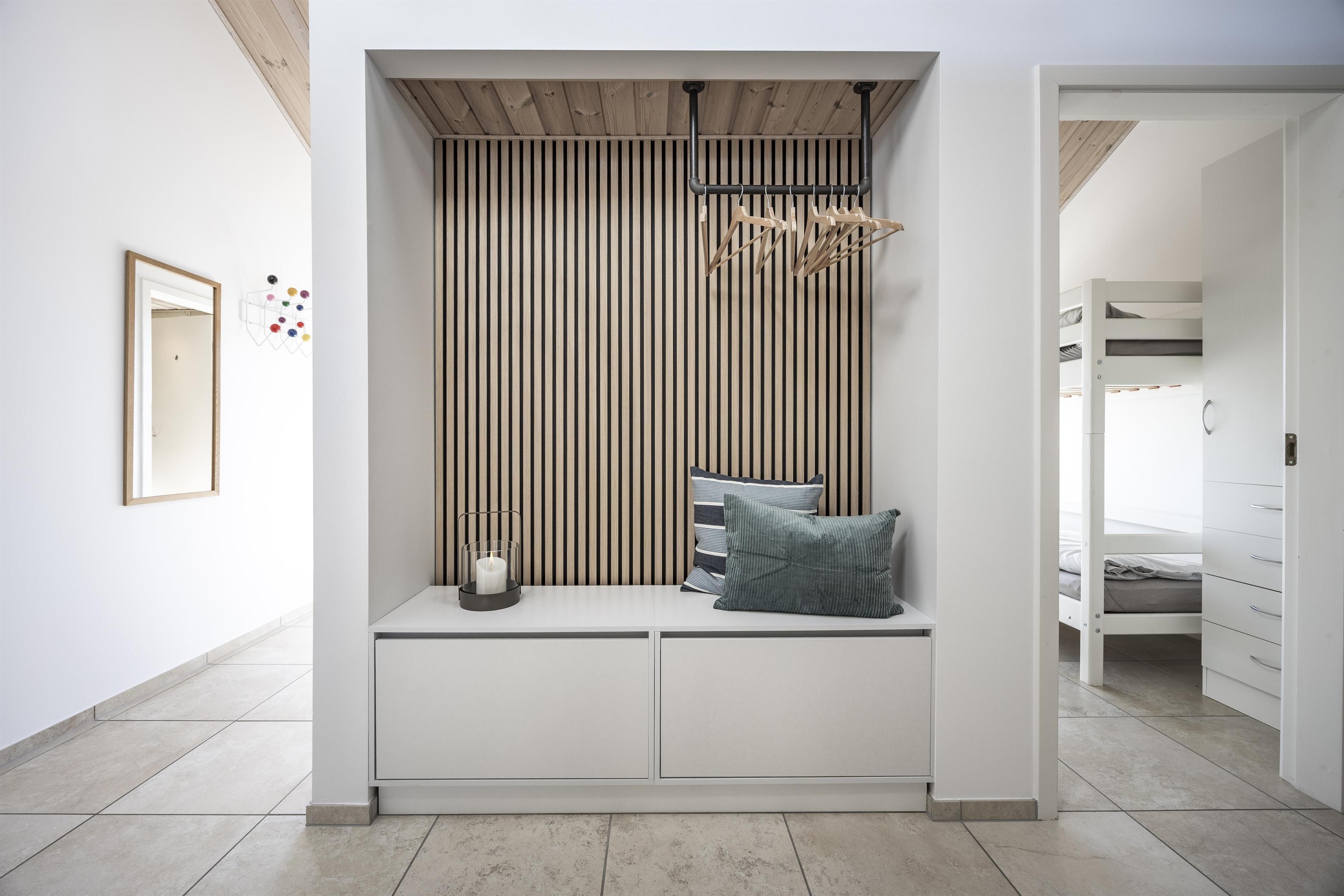 Das Ferienhaus ist von hoher Qualität und überzeugt mit einer spannenden und durchdachten Einrichtung. Sie werden von einem aufregenden und architektonisch anspruchsvollen Grundriss auf mehreren Ebenen empfangen. Das Haus verfügt über zwei Eingänge – einer davon führt direkt in den Hauswirtschaftsraum im Untergeschoss. Hier stehen Ihnen sowohl eine Waschmaschine als auch ein Trockner zur Verfügung, ebenso wie großzügiger Stauraum für Oberbekleidung. Durch den zweiten Eingang gelangen Sie in das Erdgeschoss des Hauses. Hier befinden sich zwei moderne Badezimmer sowie drei geschmackvoll eingerichtete Schlafzimmer. Im gesamten Haus herrscht eine großzügige Deckenhöhe, die allen Räumen ein offenes und luftiges Ambiente verleiht. Zwei der Schlafzimmer sind mit komfortablen Doppelbetten ausgestattet, während das dritte Zimmer ein Familienetagenbett sowie einen kleinen Hems (offene Schlafempore) bietet – ideal für Kinder. Zusätzlich besteht die Möglichkeit, zwei weitere Schlafplätze einzurichten.