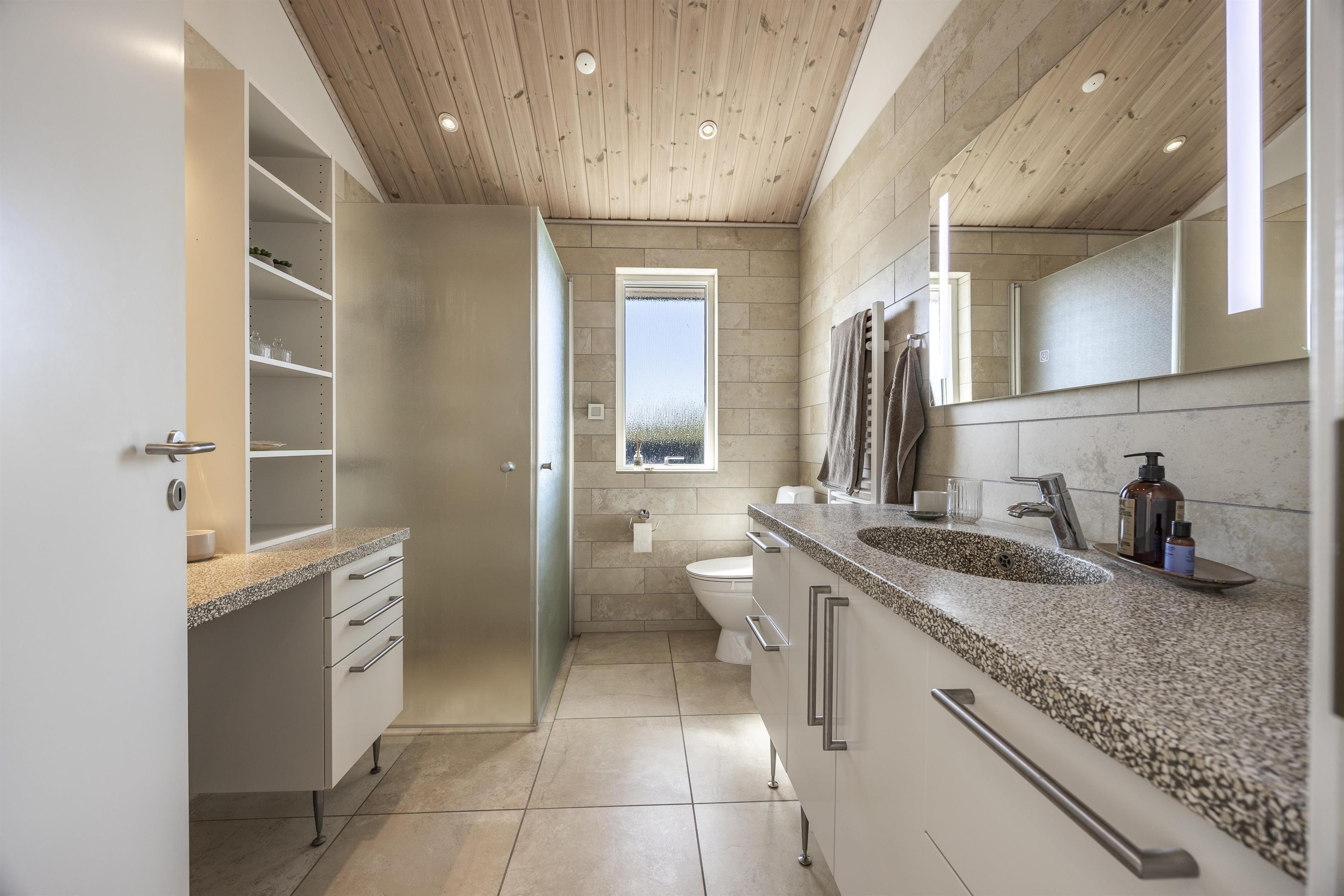 Das Haus bietet nicht nur hohe Qualität im Innenbereich – auch draußen gibt es mehrere schöne Terrassebereiche, die das Haus umgeben. Hier können Sie die Sonne den ganzen Tag über genießen, die frische Meeresluft einatmen oder Schutz vor dem oft kräftigen Westwind suchen. Auf der Vorderseite des Hauses finden Sie den perfekten Ort, um Ihren Morgenkaffee zu genießen, während Sie den fantastischen Meerblick genießen. Später am Tag können Sie sich auf der großen Terrasse auf der anderen Seite des Hauses entspannen, die genügend Platz für die ganze Familie bietet.
