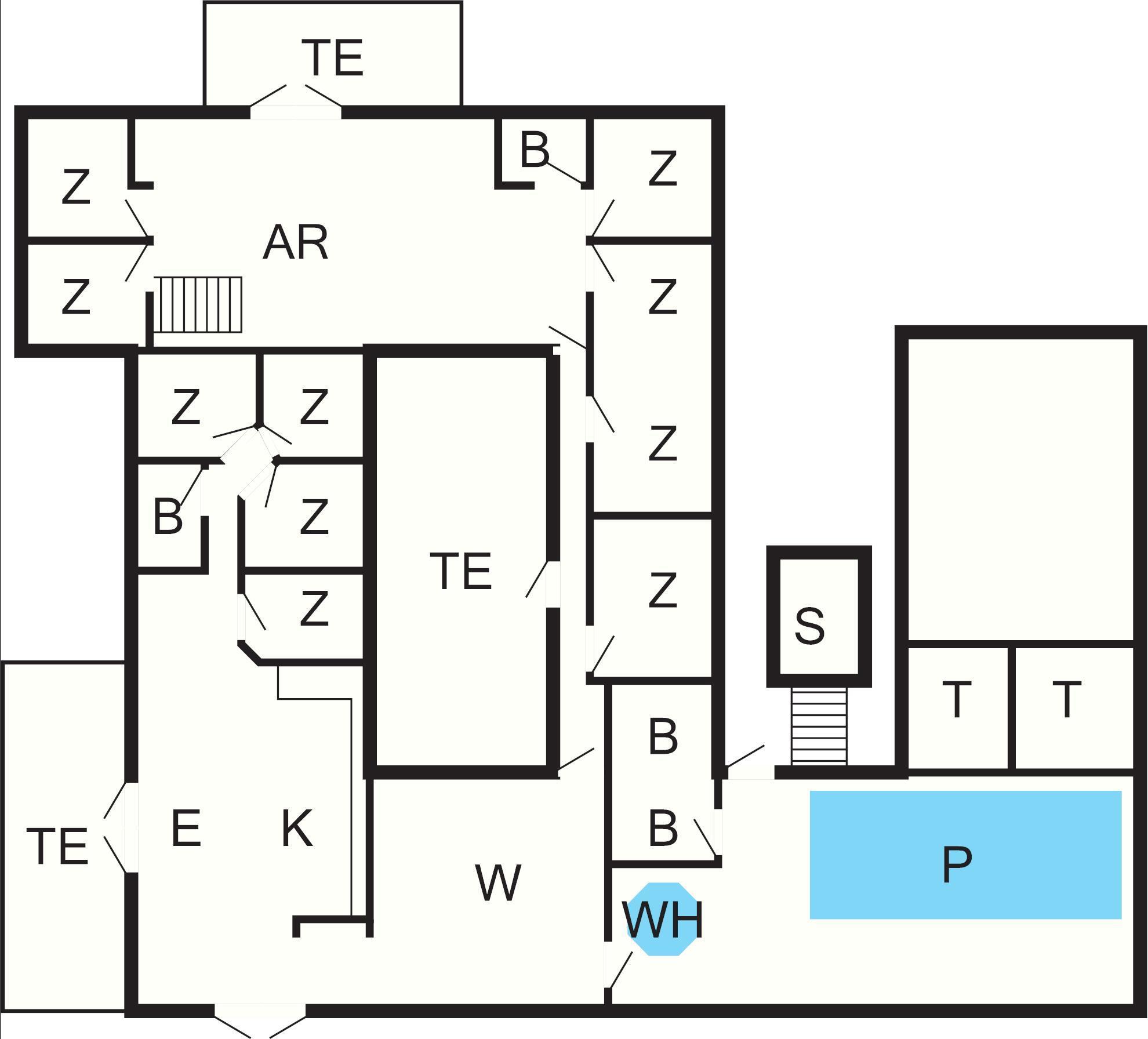 Es gibt zehn Schlafzimmer und einen Dachboden mit sieben Betten. Die Schlafzimmer sind in vier Schlafbereiche unterteilt, die Badezimmer befinden sich an beiden Enden des Hauses.