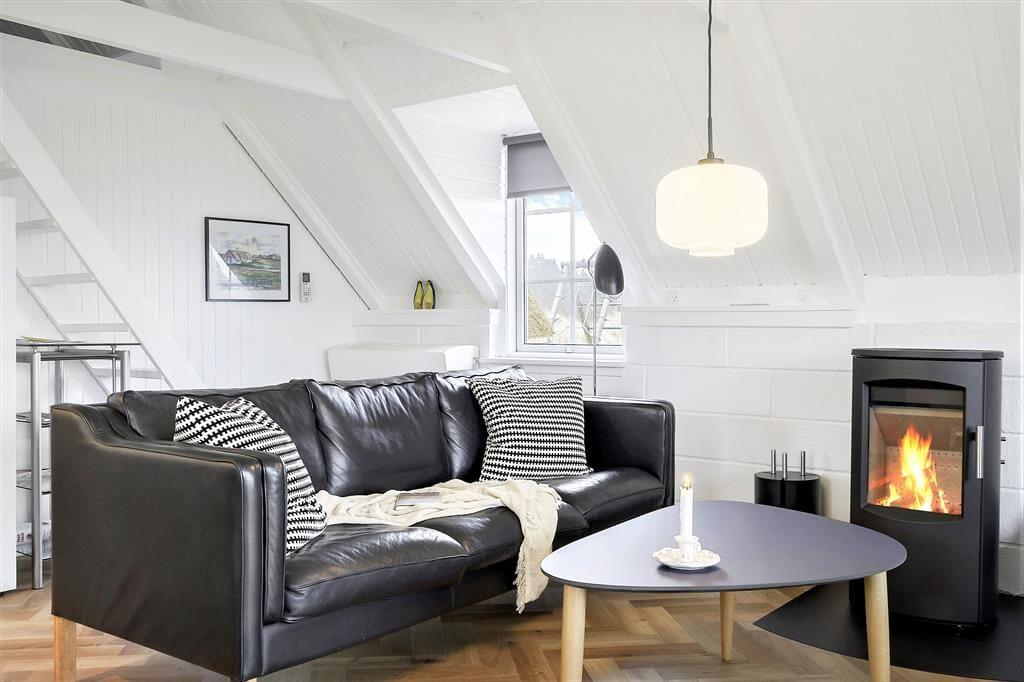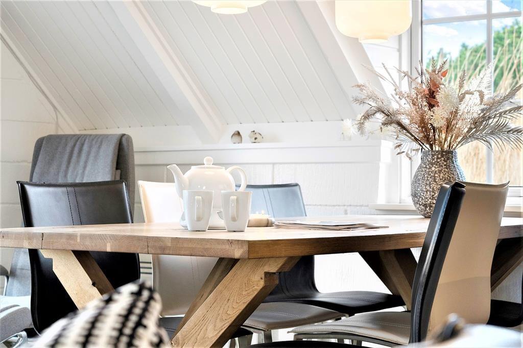 Mit seinem Reetdach und den Sprossenfenstern wirkt dieses Mietobjekt überaus idyllisch. Dieser schöne Eindruck setzt sich unvermindert im Hausinneren fort. Die schrägen Wände im Wohnraum, die hohen Decken und die offene Balkenlage schaffen eine gemütliche, stimmungsvolle Atmosphäre. Die Küche und der Wohnraum bilden eine offene Einheit. Neben einem Geschirrspüler bietet die Küche außerdem alle anderen notwendigen Geräte und Küchenutensilien. Die fertigen Mahlzeiten servieren Sie am Esstisch, von dem Sie durch große Fensterpartien hinaus in die Natur blicken. In der Polstersitzecke können Sie gemütliche Film- oder Leseabende verbringen. Für ein Maximum an Behaglichkeit und Wärme sorgt dabei an kühleren Tagen das Feuer im Kaminofen. Die sechs vorhandenen Schlafplätze verteilen sich auf zwei Schlafräume und auf einen Schlafboden. Das Badezimmer ist ausgestattet mit einer Duschnische, einer Waschmaschine und einer Sauna.