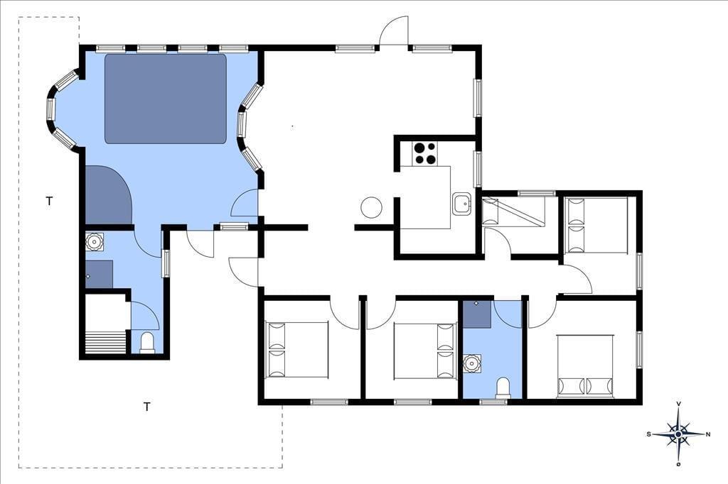 Das ältere Ferienhaus bietet insgesamt fünf Schlafzimmer, sodass ausreichend Platz für zwei Familien mit Kindern oder Freunde im gemeinsamen Urlaub vorhanden ist. Im Zimmerteil gibt es außerdem ein Badezimmer mit ebenerdiger Dusche und Fußbodenheizung. Im Wohnbereich sind Küche und Wohnzimmer in einem vereint und große Fenster ermöglichen einen herrlichen Blick auf die umliegenden Dünen und die wunderschöne Natur. In der Küche haben Sie viel Platz zum gemeinsamen Kochen und die Gerichte können bequem am großen Esstisch serviert werden. Den Abendkaffee können Sie auf der Sofagruppe neben dem Fernseher genießen und die Gemütlichkeit ist am schönsten, wenn das Feuer im Holzofen knistert. Schließlich bietet das Ferienhaus den Poolbereich, wo Sie den 24 m² großen Pool mit einem Schwimmtrainer genießen oder im Whirlpool entspannen können. Hier gibt es auch ein Badezimmer mit Dusche, Sauna und Waschsäule und im nach Süden ausgerichteten Glaserker können Sie eine kühle Erfrischung in der Sonne mit Blick in die Natur genießen.
