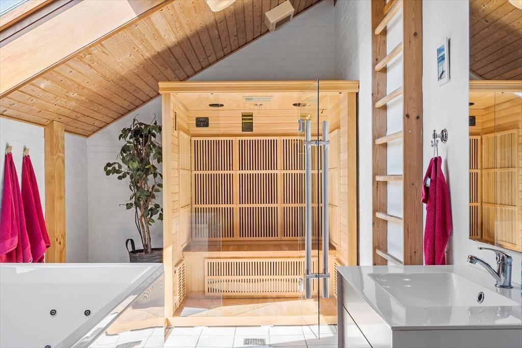 Das modern und stilvoll eingerichtete Urlaubsdomizil bietet eine gute Raumaufteilung für sechs Personen. Das Herzstück des Hauses bildet der große offene Aufenthaltsbereich, der die Küche sowie den Wohn- und Essbereich offen in sich vereint. Hohe Decken verleihen dem Raum eine luftige Atmosphäre. Die bodentiefen Fenster gewähren einen herrlichen Tageslichteinfall. Die Küche ist gut ausgestattet. Ihre Mahlzeiten servieren Sie am lichtumfluteten Esstisch. Die Polstermöbel laden zu gemütlichen Stunden mit einem spannenden Buch und zu entspannten Filmabenden im Familienkreis ein. Für ein Maximum an Gemütlichkeit sorgt der Kaminofen. Das Urlaubsdomizil verfügt über zwei separate Schlafbereiche. Der eine Schlafberiech verfügt über zwei Zimmer und ein Badezimmer mit einer Duschnische. Der zweite Schlafbereich umfasst ein großes Schlafzimmer und ein separates WC. Hinzu gesellt sich das große Wellnessbadezimmer, in dem Sie auf eine Waschmaschine, einen Wäschetrockner, eine Duschnische, einen Whirlpool und eine Infrarot-Sauna treffen.