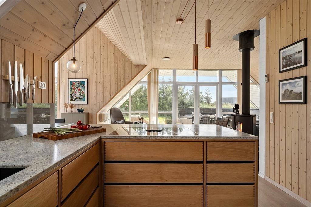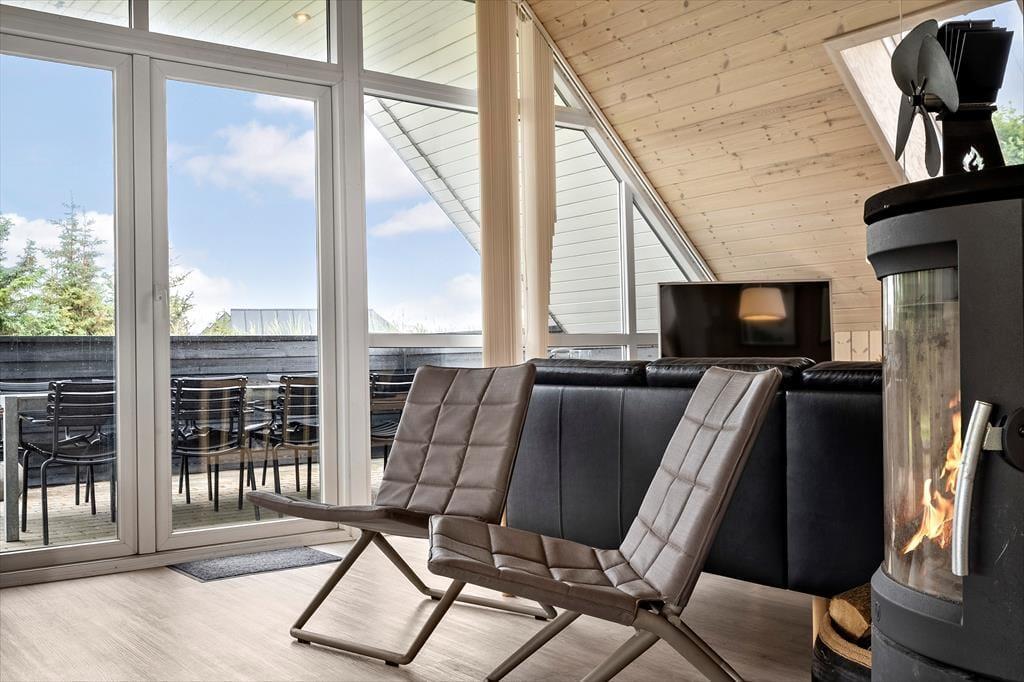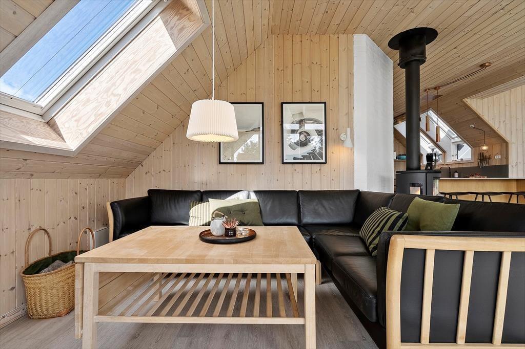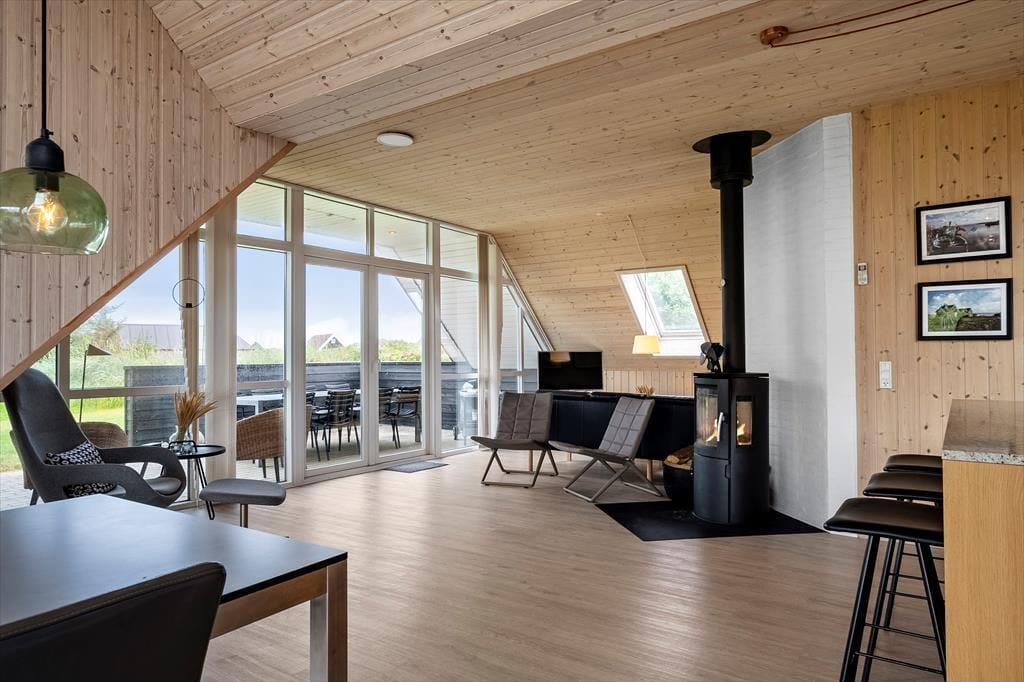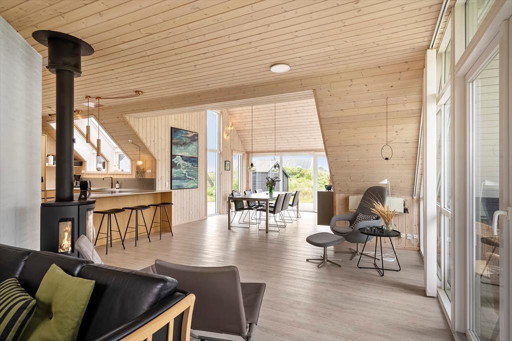 Schon beim Eintreten spürst du, wie Licht und Luft das Ferienhaus prägen: Hohe Decken und große Fenster – darunter auch Dachfenster – lassen Sonnenstrahlen tief ins Haus fallen und sorgen für ein angenehmes Gefühl von Platz und Räumlichkeit. Die Einrichtung ist freundlich und gemütlich gehalten, sodass du dich sofort zu Hause fühlst. In der offenen Wohnküche könnt ihr wunderbar gemeinsam kochen, essen und relaxen, und wenn es draußen mal etwas kühler ist, spendet der Kaminofen im Wohnzimmer wohlige Wärme. Das Knistern des Feuers, ein gutes Buch und ein warmes Getränk in der Tasse – das nennt man auf Dänisch „Hygge“. Die ruhige Lage und die gelungene Raumaufteilung machen das Haus auch ideal für entspannte Stunden mit der Familie oder guten Freunden.