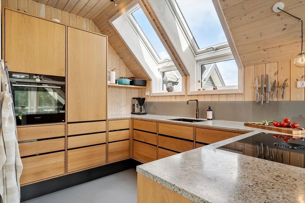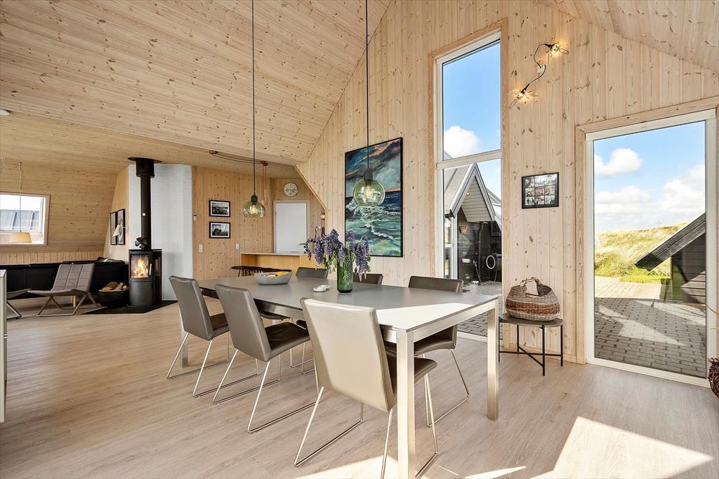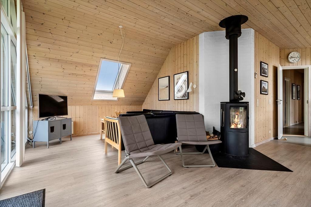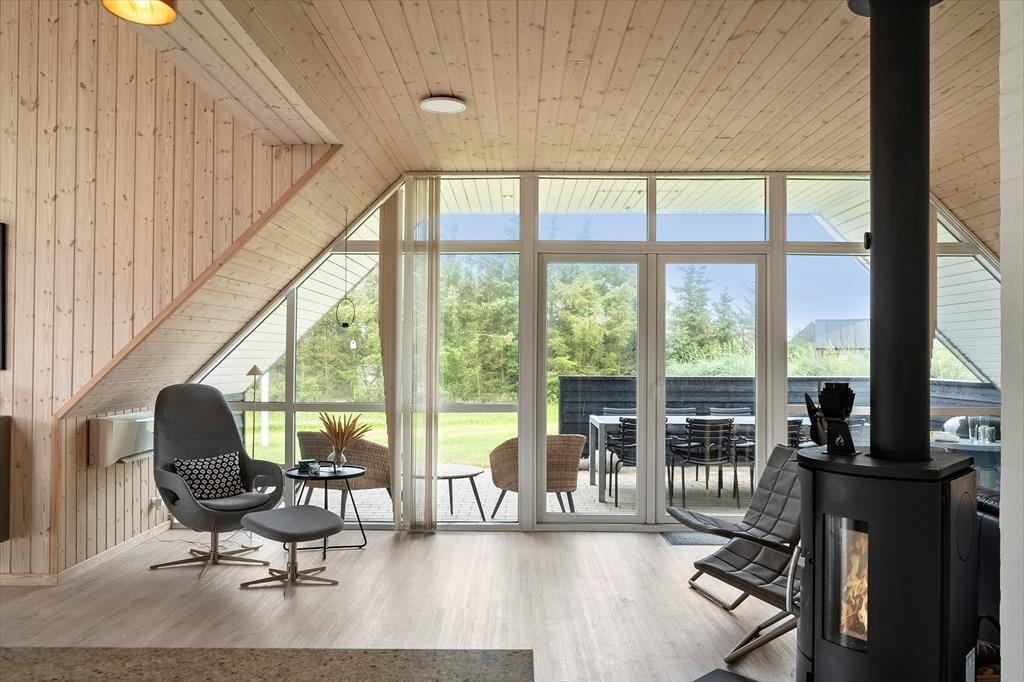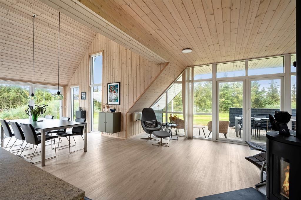 Schon beim Eintreten spürst du, wie Licht und Luft das Ferienhaus prägen: Hohe Decken und große Fenster – darunter auch Dachfenster – lassen Sonnenstrahlen tief ins Haus fallen und sorgen für ein angenehmes Gefühl von Platz und Räumlichkeit. Die Einrichtung ist freundlich und gemütlich gehalten, sodass du dich sofort zu Hause fühlst. In der offenen Wohnküche könnt ihr wunderbar gemeinsam kochen, essen und relaxen, und wenn es draußen mal etwas kühler ist, spendet der Kaminofen im Wohnzimmer wohlige Wärme. Das Knistern des Feuers, ein gutes Buch und ein warmes Getränk in der Tasse – das nennt man auf Dänisch „Hygge“. Die ruhige Lage und die gelungene Raumaufteilung machen das Haus auch ideal für entspannte Stunden mit der Familie oder guten Freunden.