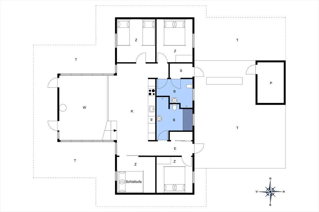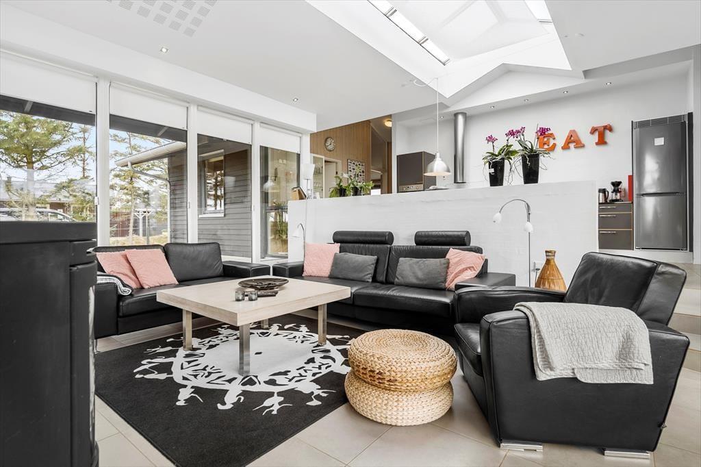 Dank der großen, bodentiefen Panoramafenster genießen Sie im Wohnraum einen freien Ausblick auf die attraktive Natur ringsum. Es ist ein wunderschönes Gefühl, so eng mit der Landschaft verbunden zu sein - und mit dem Fjord, der blau hinter den Uferwiesen schimmert. Der Wohnraum verwöhnt mit einem Kaminofen, weichen Polstersitzmöbeln und einem Flachbild-TV. Über ein paar Stufen gelangen Sie vom Wohnraum hinab in den offenen Küchenbereich. Somit nehmen Sie selbst während der Zubereitung der Mahlzeiten am Familienleben im Wohnraum teil. Momente purer Entspannung genießen Sie in der Sauna des einen Badezimmers. Die im zweiten Badezimmer untergebrachte Badewanne verspricht ebenfalls erholsame Momente. Die sehr gute Raumaufteilung wird durch vier gute Schlafräume abgerundet, die insgesamt Platz für acht Personen bieten.