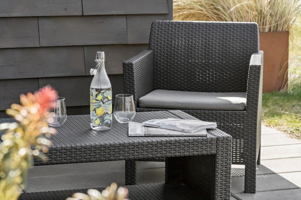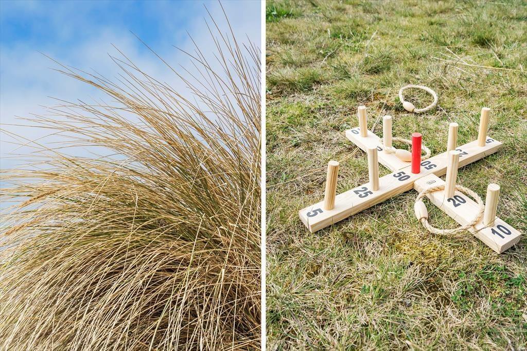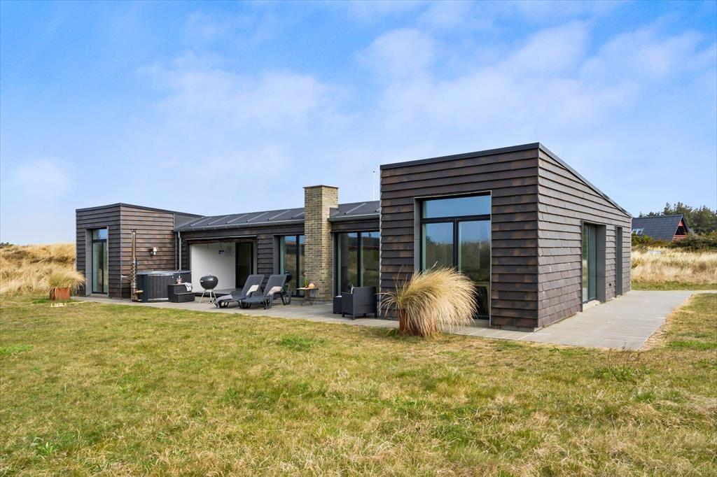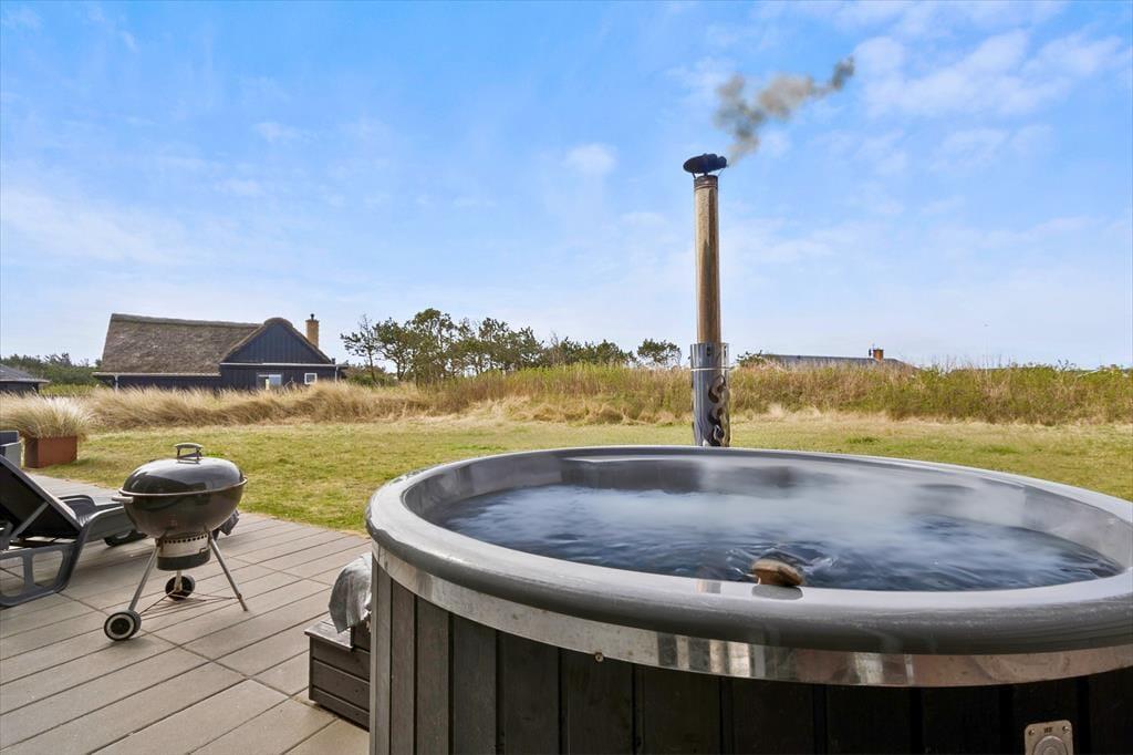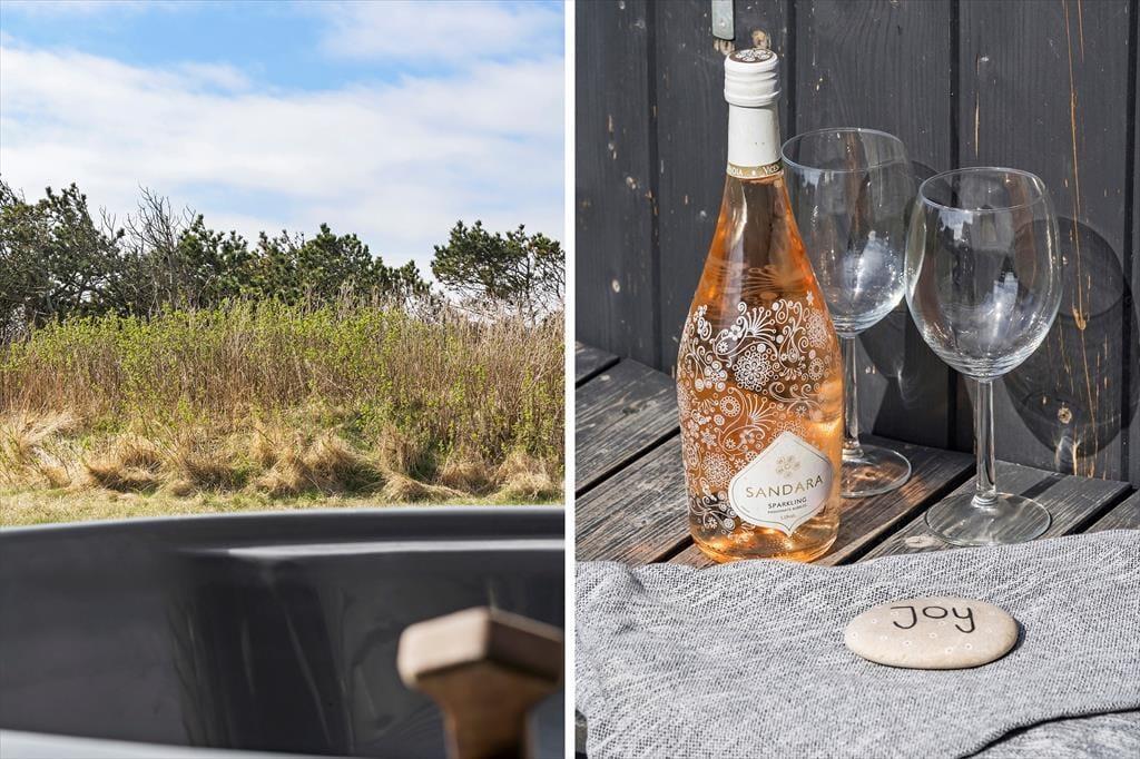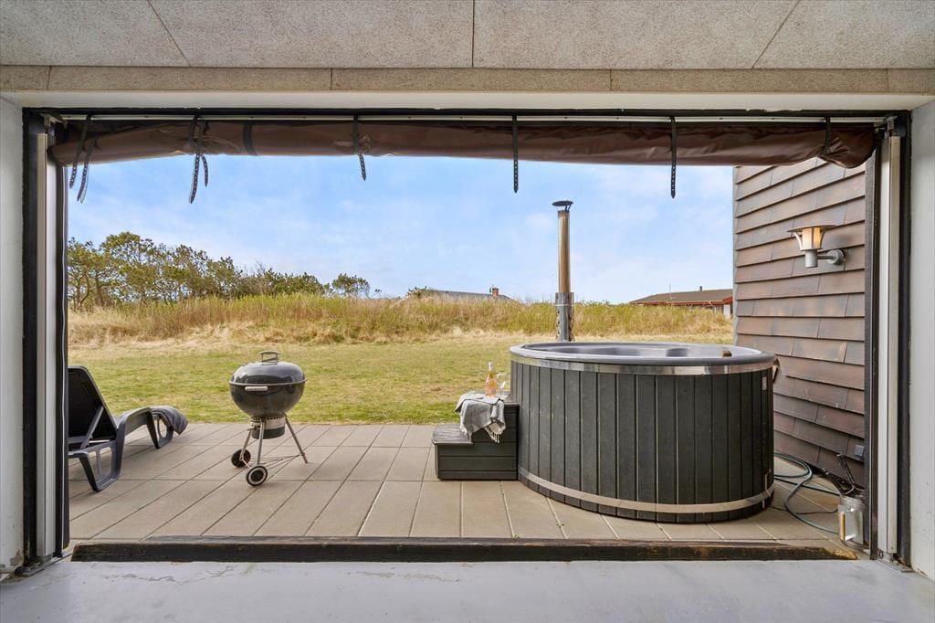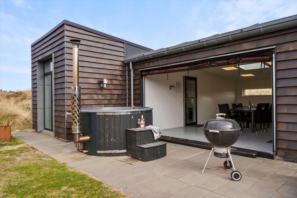 Auf der großen, überdachten Terrasse, die eine natürliche Verbindung zwischen den beiden Abteilungen bildet, könnt ihr das Leben im Freien in vollen Zügen genießen. Hier draußen könnt ihr euch um den großen Terrassentisch versammeln und leckere Grillabende verbringen, mit dem Duft von saftigen Steaks und fangfrischem Fisch in der Luft. Die bequemen Loungemöbel laden unübertroffen dazu ein, sich mit einem Glas kühlem Weißwein zurück zu lehnen und die Sonne langsam hinter den Dünen verschwinden zu sehen. An kühleren Tagen ist das warme Wildnisbad der absolute Hit – hier könnt ihr richtig runterschalten, während der Dampf zu Himmel steigt und der Wind das Rauschen des Meeres bis zu euch aufs Grundstück trägt. Die ruhige Lage bietet euch optimale Bedingungen. Die Kinder dürfen Sandburgen im Sandkasten bauen und in den warmen Sonnenstrahlen spielen - alle können hier friedlich und entspannte Tage verbringen.