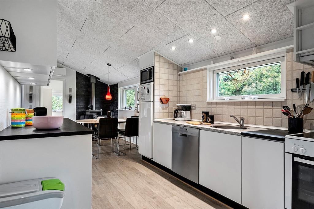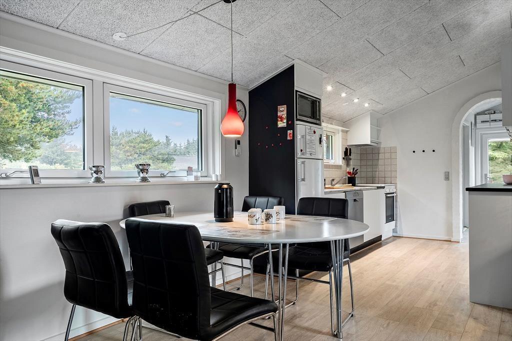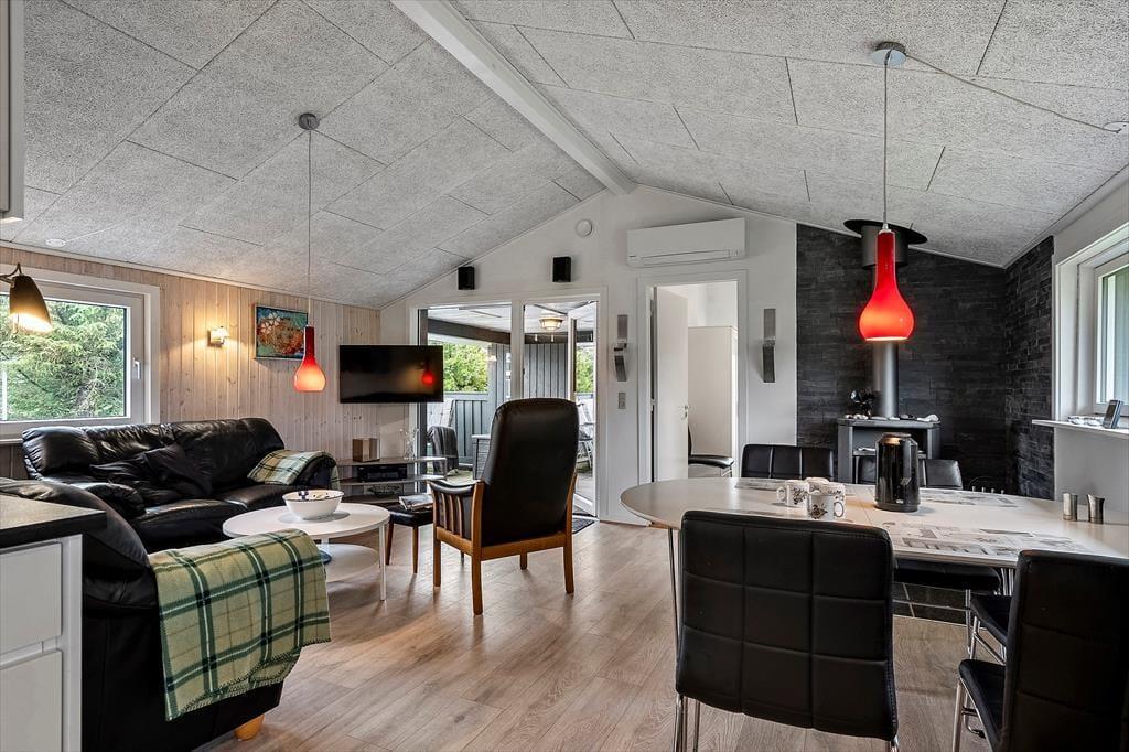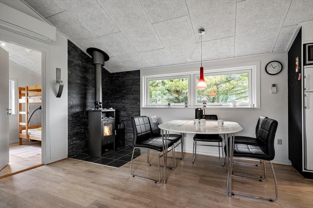Wenn du das Ferienhaus am Lyngvejen 59 betrittst, empfängt dich eine warme und einladende Atmosphäre. Der offene Wohnraum bildet das Herz des Hauses, mit seinem natürlichen Lichteinfall und dem stimmungsvollen Kamin, der zu jeder Jahreszeit zu Gemütlichkeit einlädt. Hier ist es ideal, sich mit einem guten Buch auf das Sofa zu kuscheln, während die Flammen im Holzofen knistern, oder sich die Familie zu Brettspielen und langen, geselligen Abendessen am Esstisch versammelt. Die schlichte und funktionale Einrichtung bietet Platz, um in eigenem Tempo zu relaxen – sei es beim Frühstück im Nachtpölter oder zu ruhigen Abenden mit Kartenspielen und Kerzenlicht. Das ist Ferienleben pur und genau das macht diesen Ort so besonders.