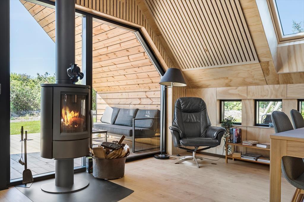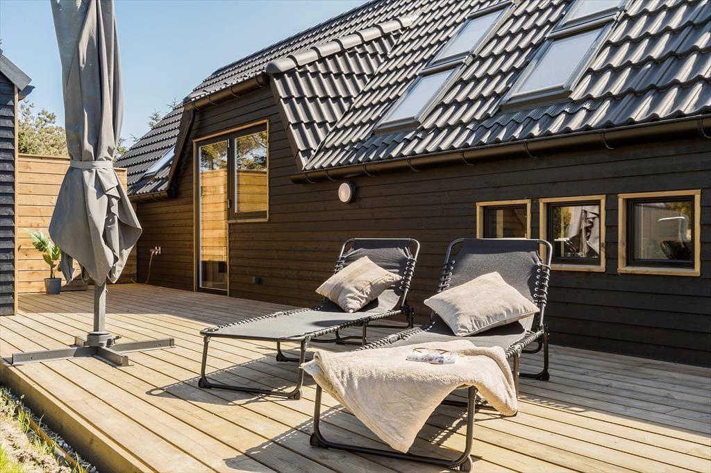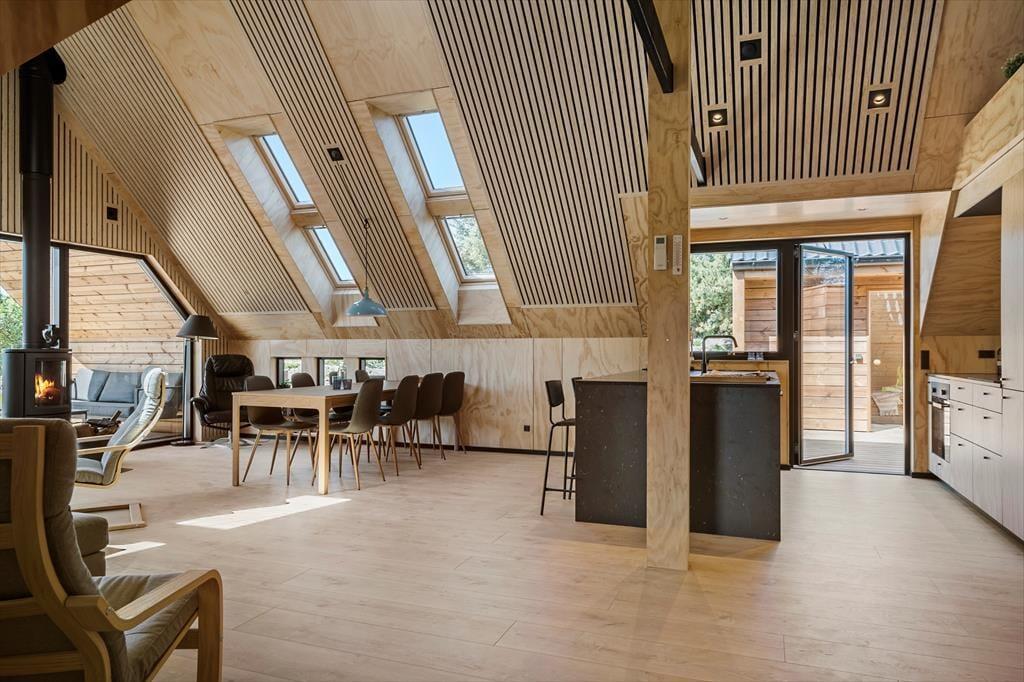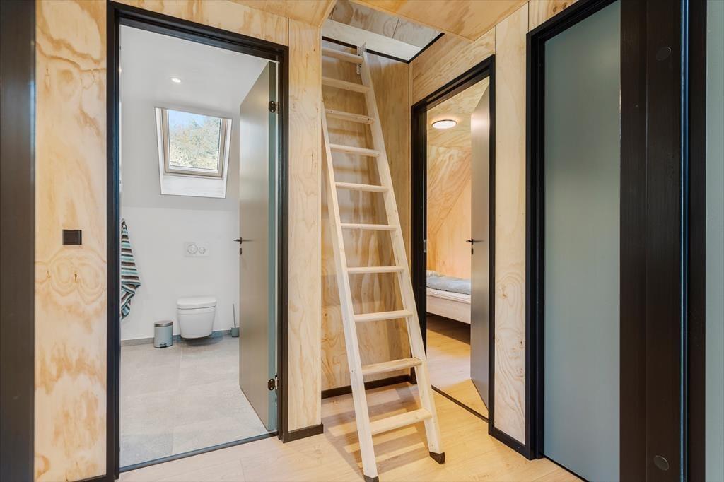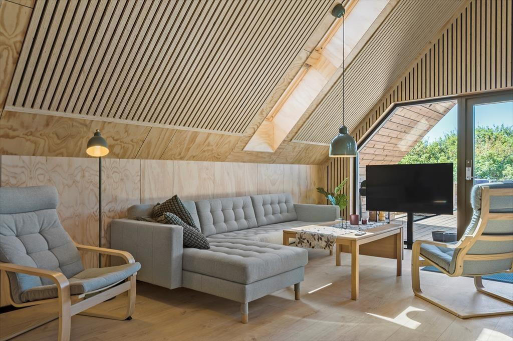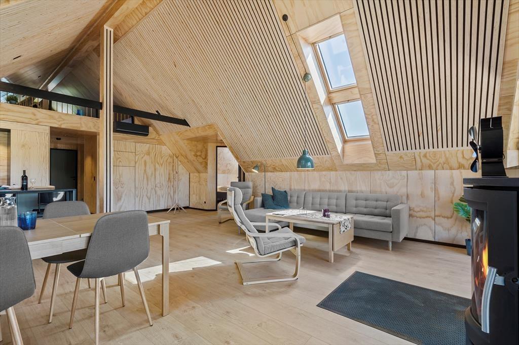 Tatsächlich gab es am Opstrupsvej 44 einst ein Sommerhaus, das gerade wieder aufgebaut wird. In diesem Zusammenhang wird auch die Quadratmeterzahl erweitert, so dass Sie 120 m² zur Verfügung haben, um Ihr Urlaubsleben entfalten zu können. Dank der Planlösung mit vier Schlafräumen und zwei Badezimmern können Sie problemlos sieben weitere einladen. Insgesamt soll das Haus für acht Personen gedacht sein. Alle Räume wirken hell, frisch und freundlich, und das gilt natürlich auch für den Wohnbereich, in dem Küche und Wohnzimmer vereint sind. Der Raum hat offene Galerie und die schrägen Oberlichtfenster lassen sowohl die Sonne als auch die Sterne des Abendhimmels hinein – auch die Esstischanrichtung, die Sofaecke und der „Hems“ laden zum Entspannen und gemütlich geselligem Beisammensein ein.