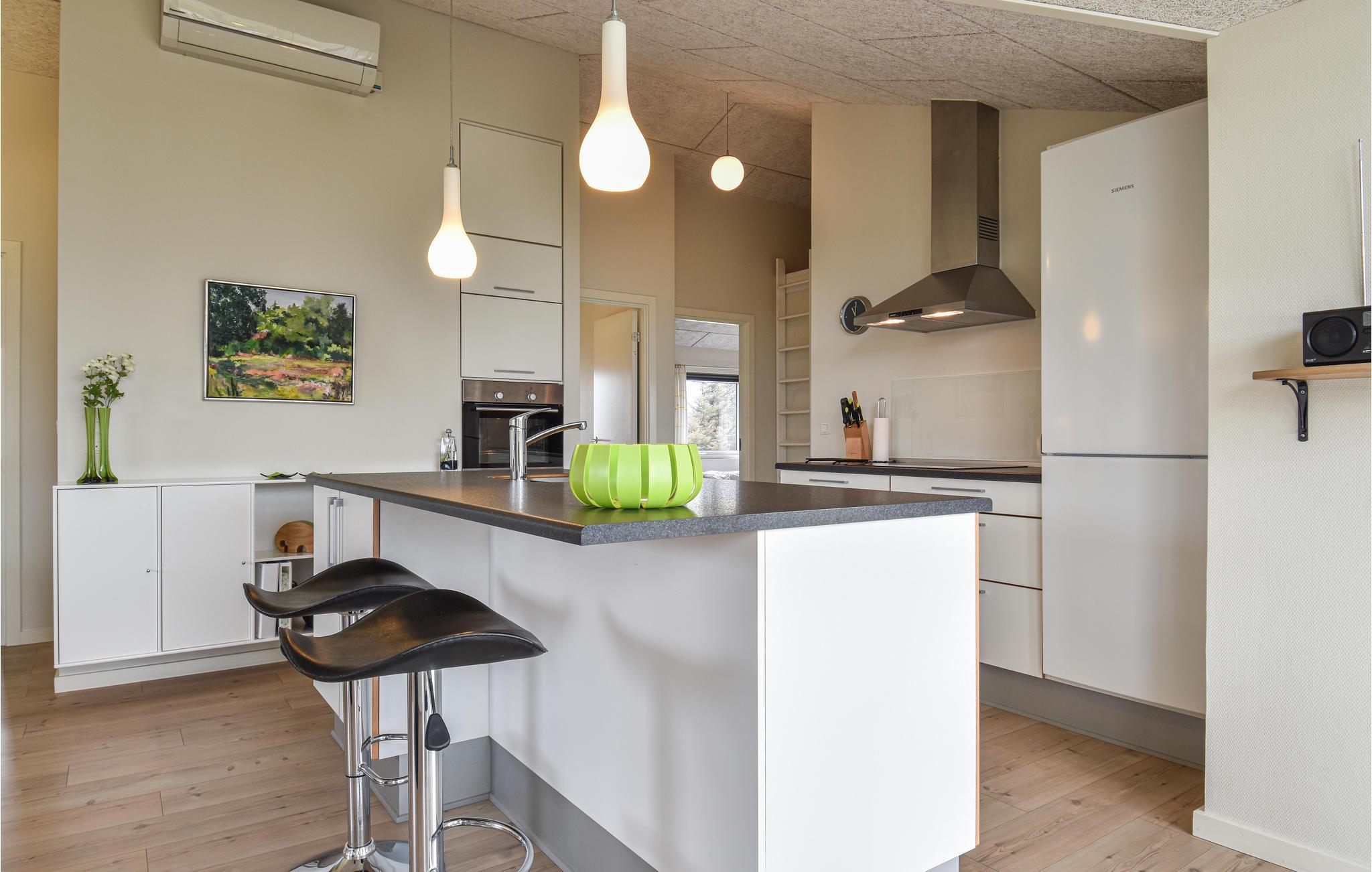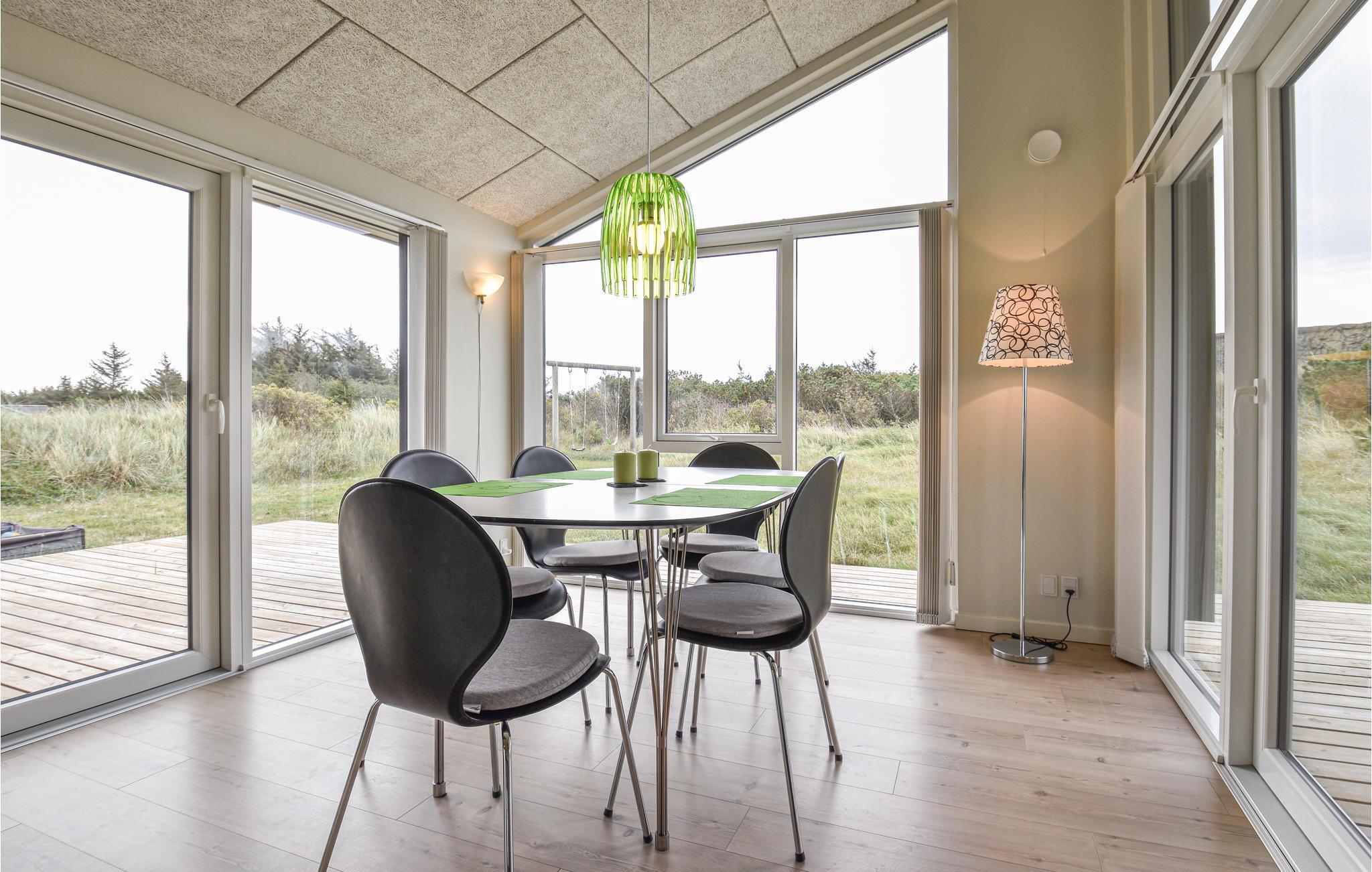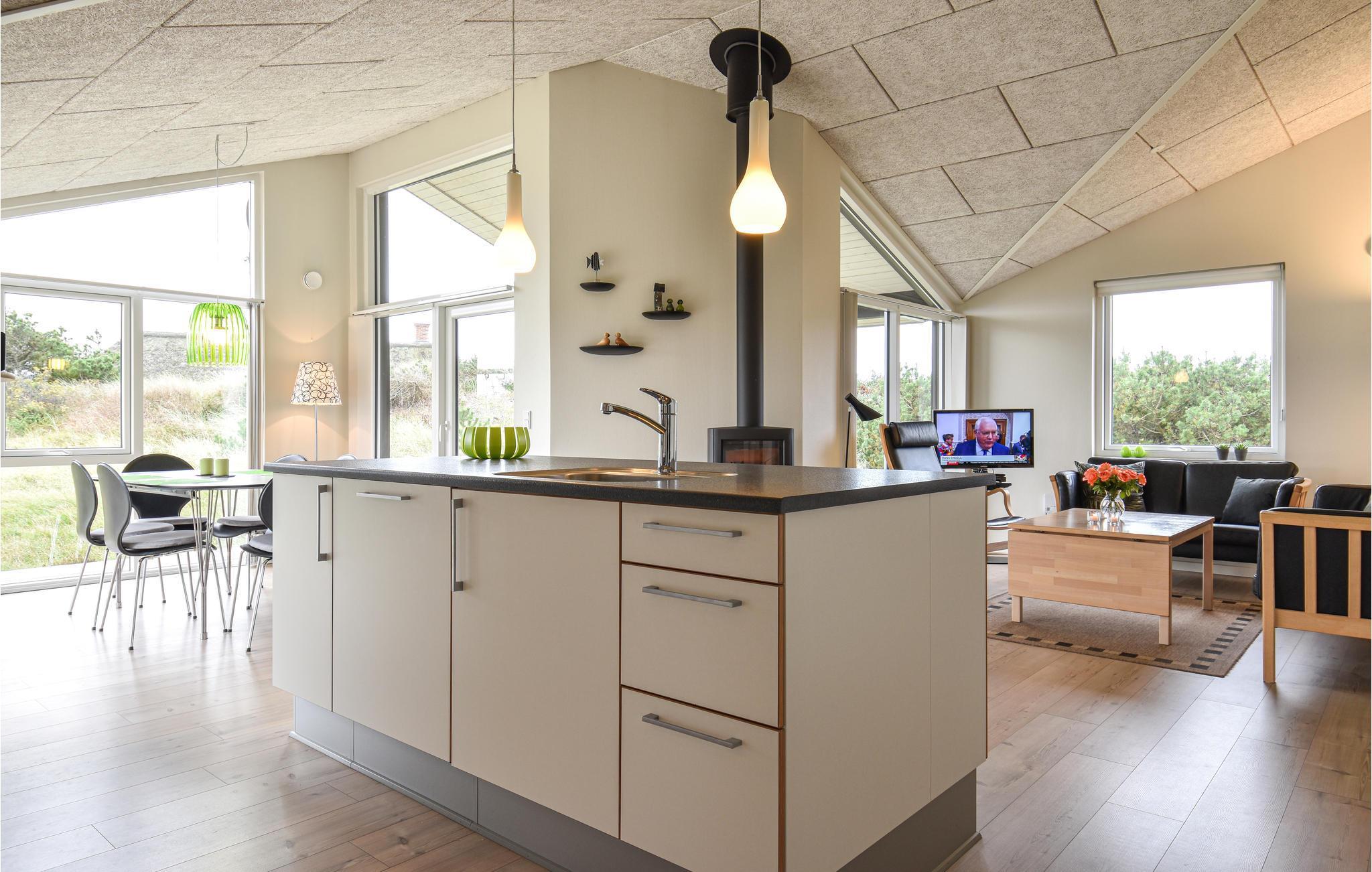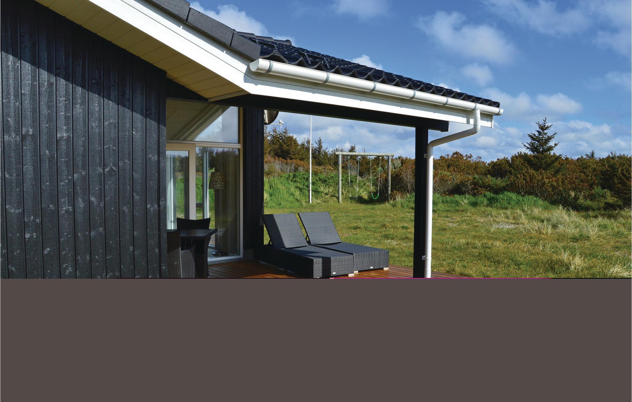 In den Dünen nahe beim Meer in Klegod haben Sie dieses schön eingerichtete Ferienhaus.Große Fenster und eine Decke, die bis unter den First offen ist, lassen viel Licht in den Raum. Durch die gute Qualität der Materialien herrscht hier auch eine gute Akustik. Vor dem Wohnzimmer liegt die Terrasse. Insgesamt gibt es drei Terrassen, zwei sind überdacht. Entspannen Sie in den behaglichen Gartenmöbeln. Im Bad gibt es einen Whirlpool und die Sauna. Das Ferienhaus ist gut isoliert und mit einer energiesparenden Wärmepumpe ausgestattet. Sie verfügen auch über drahtloses Internet und eine PlayStation 3. Die Umgebung von Klegod ist schönes Ferienland, es liegt zwischen dem Meer und dem Fjord. Sie sollten Ihre Fahrräder mitnehmen, es gibt hier nämlich viele Radwege.