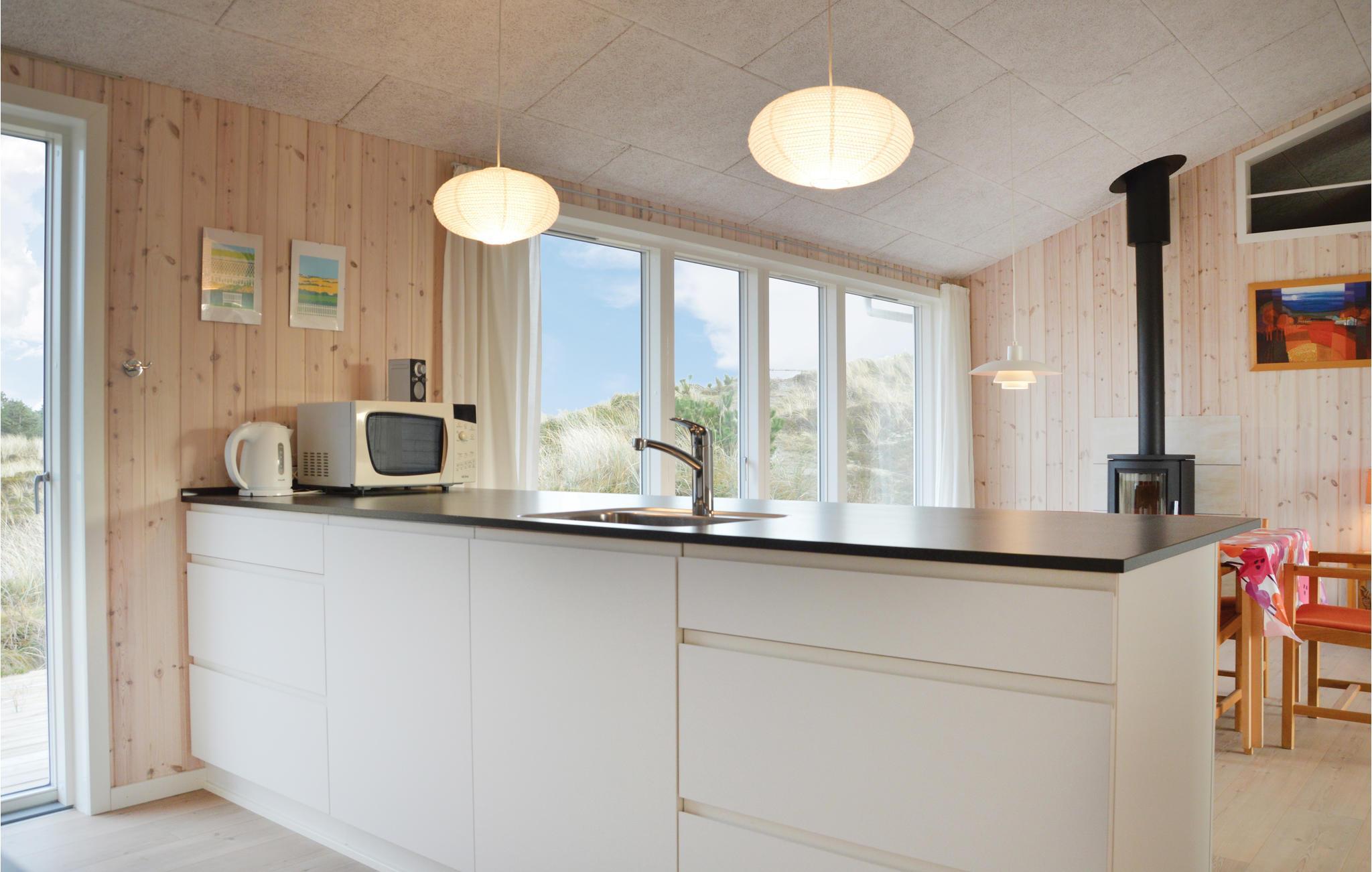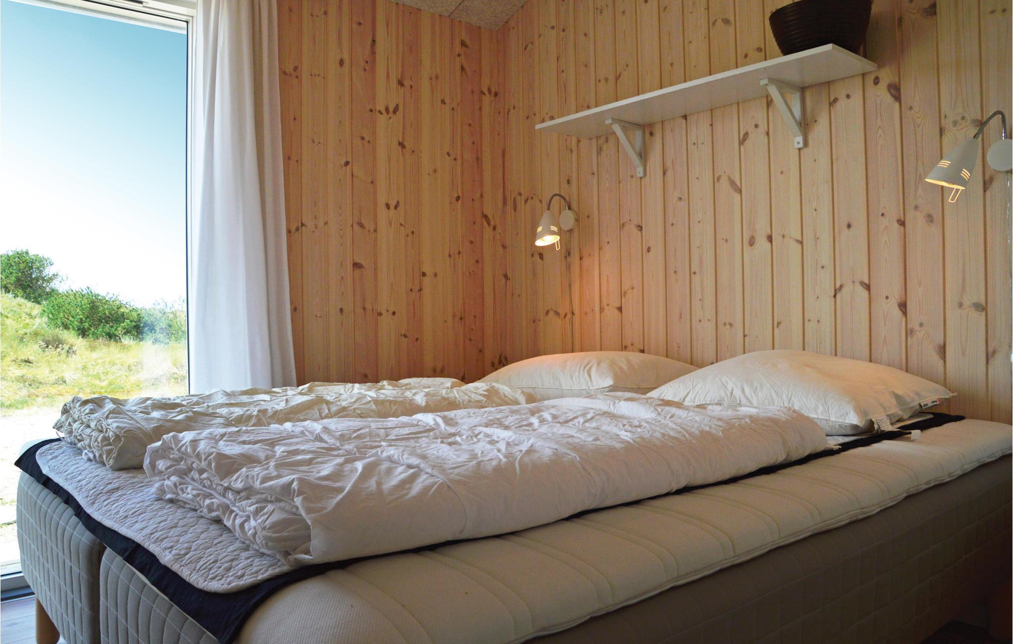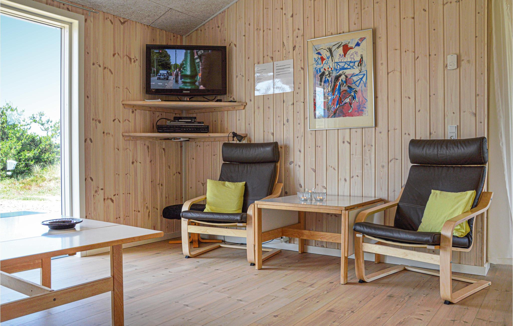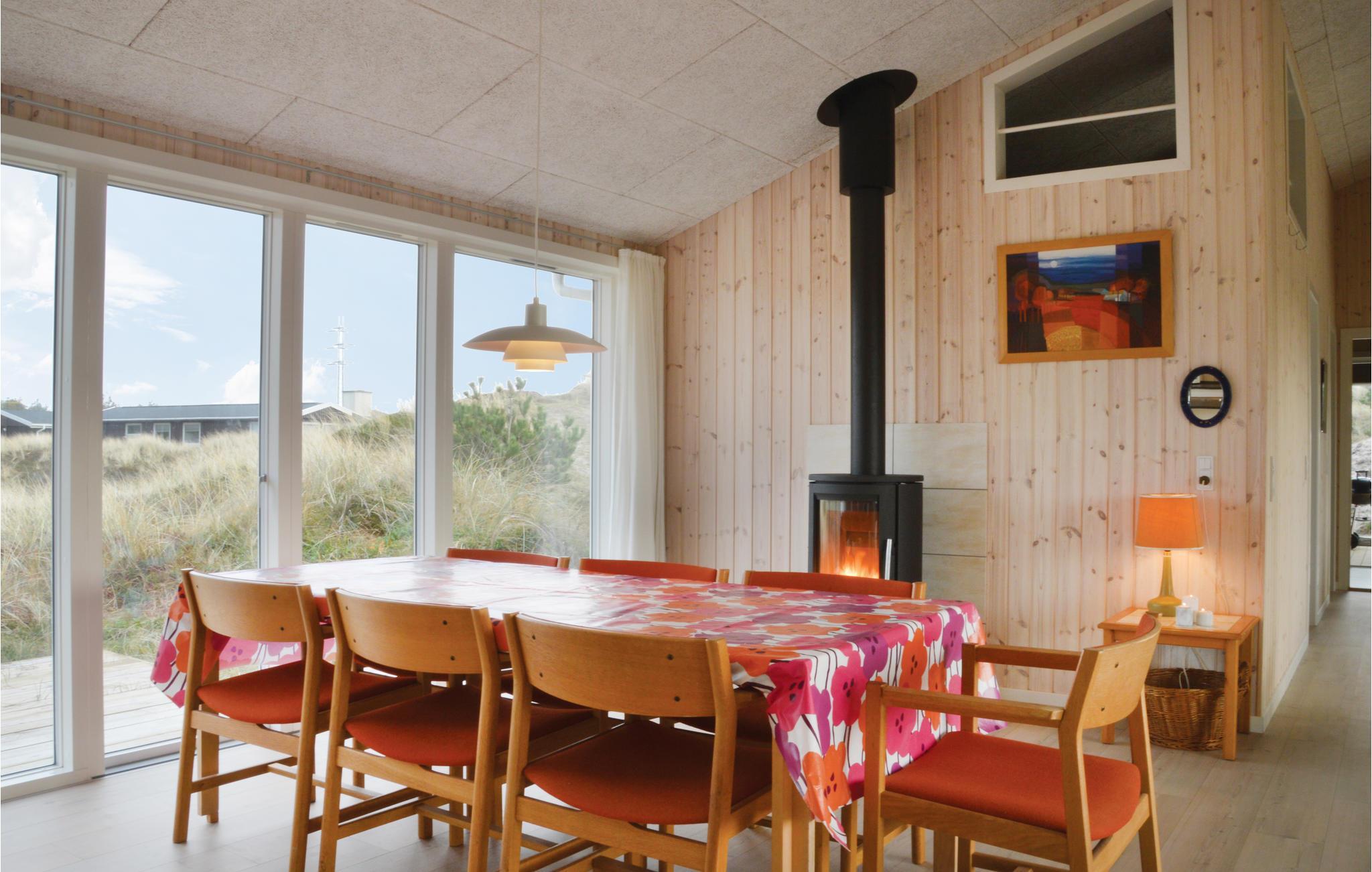 Schönes Ferienhaus auf einem großen Naturgrundstück in Klegod. Die Einrichtung ist behaglich, es gibt eine Küche, ein offenes Wohnzimmer mit Kaminofen, zwei Badezimmer mit Dusche und drei Schlafzimmer. Von einem Badezimmer kommen Sie in die Sauna. Die Stilrichtung der gepflegten Möbel ist charmantes Retro. Draußen vor der Tür können Sie auf einer das Haus umschließende Terrasse relaxen, auch hier sind die Möbel gepflegt. Da ein Teil der Terrasse unter Dach liegt, können Sie auch bei einem Regenschauer im Freien sitzen. Die Umgebung ist wunderschön, der Fjord liegt fußlänglich vom Haus. Durch die Nähe zu Angelseen können Sie bestimmt etwas für das Abendessen selbst angeln. Der Ferienort Søndervig bietet viele sommerliche Aktivitäten für Groß und Klein. Bowlingcenter, Spielplätze, Fachgeschäfte, Lebensmittelgeschäft, Fahrradverleih, dies alles und mehr finden Sie. Hvide Sande ist einer der modernsten Fischereihäfen an der dänischen Nordseeküste, aber auch hier können Sie angeln, mit der Rute von der Mole. Wenn dies nicht gelingt, gibt es ein Fischgeschäft, das frischen und geräucherten Fisch verkauft, auch leckerer Schellfisch wird angeboten. Der Ringkøbing ist ein Windsurfereldorado, Surfer können das Auto gut am Baggersvej zwischen Ringkøbing und Søndervig parken. Sie treffen hier viele Nationalitäten. Wenn Sie eine schöne, alte Stadt erleben wollen, dann sollten Sie nach Ringkøbing. Erleben Sie die großartige Natur an der Nordsee und den weiten Horizont an der Küste.