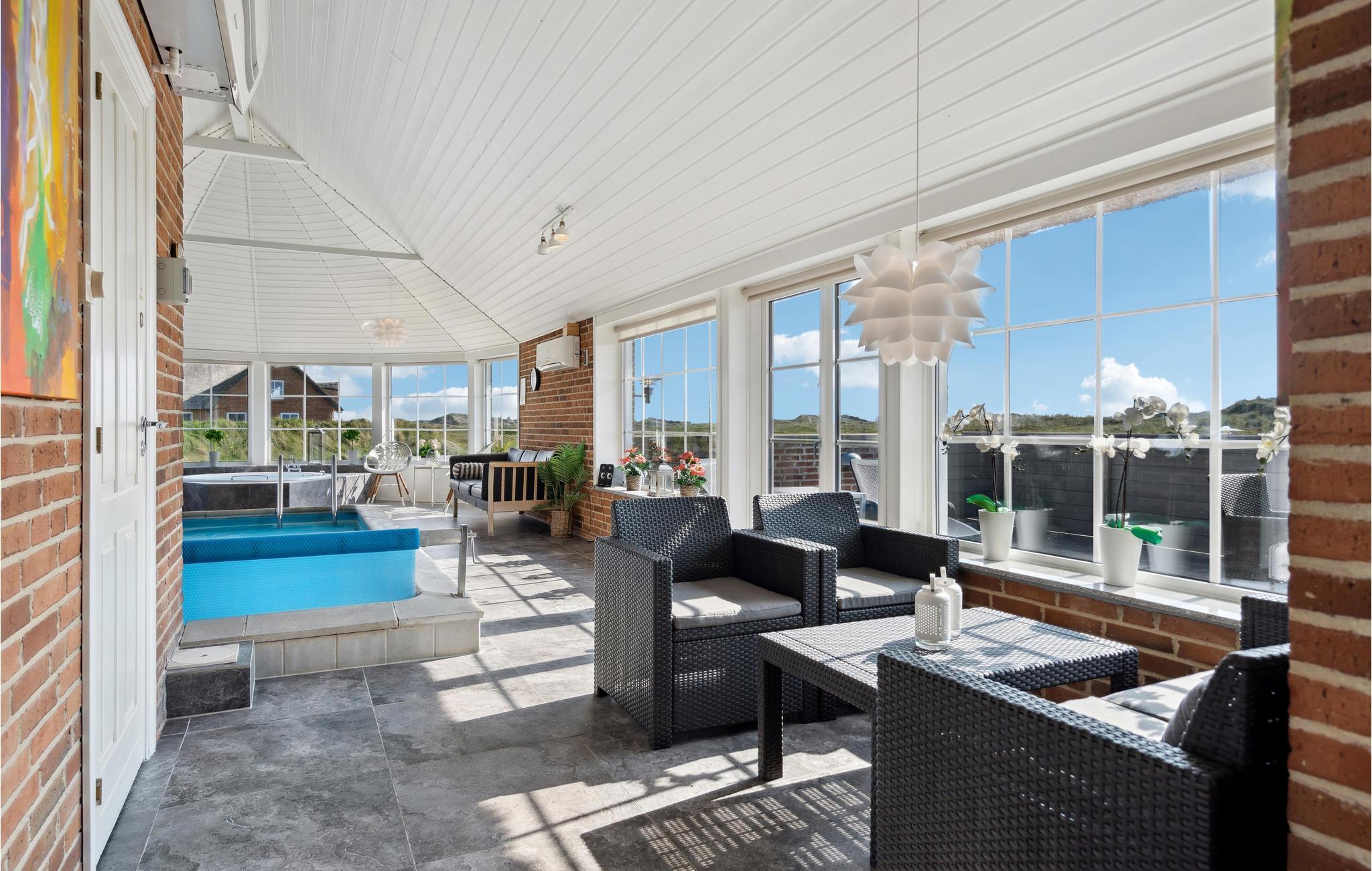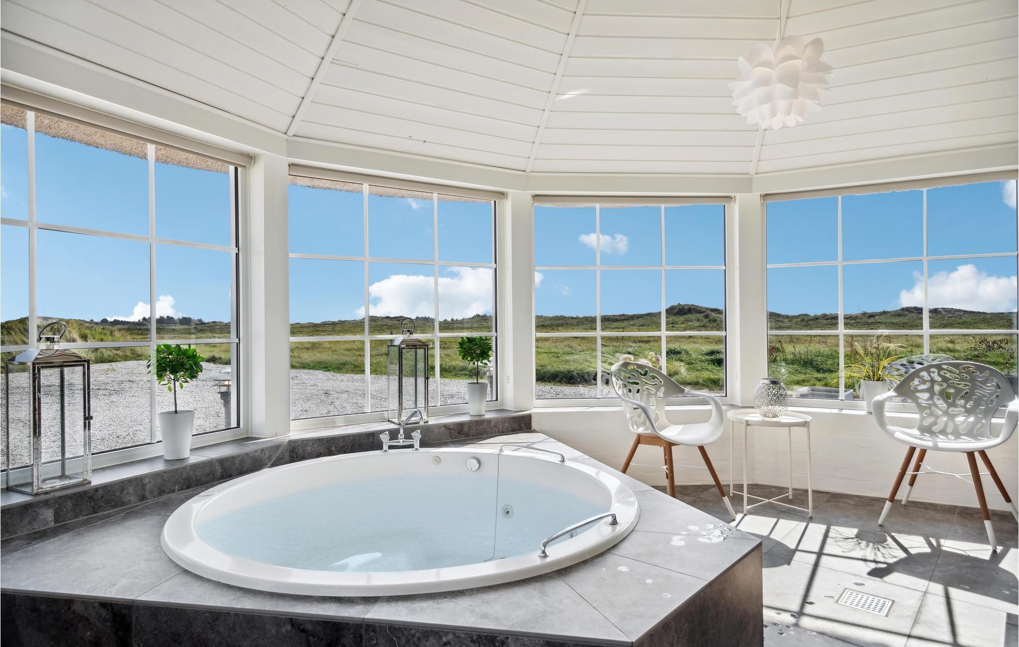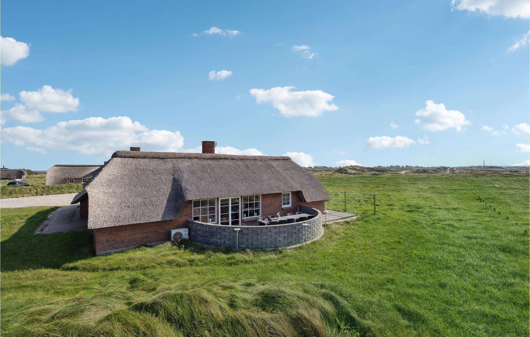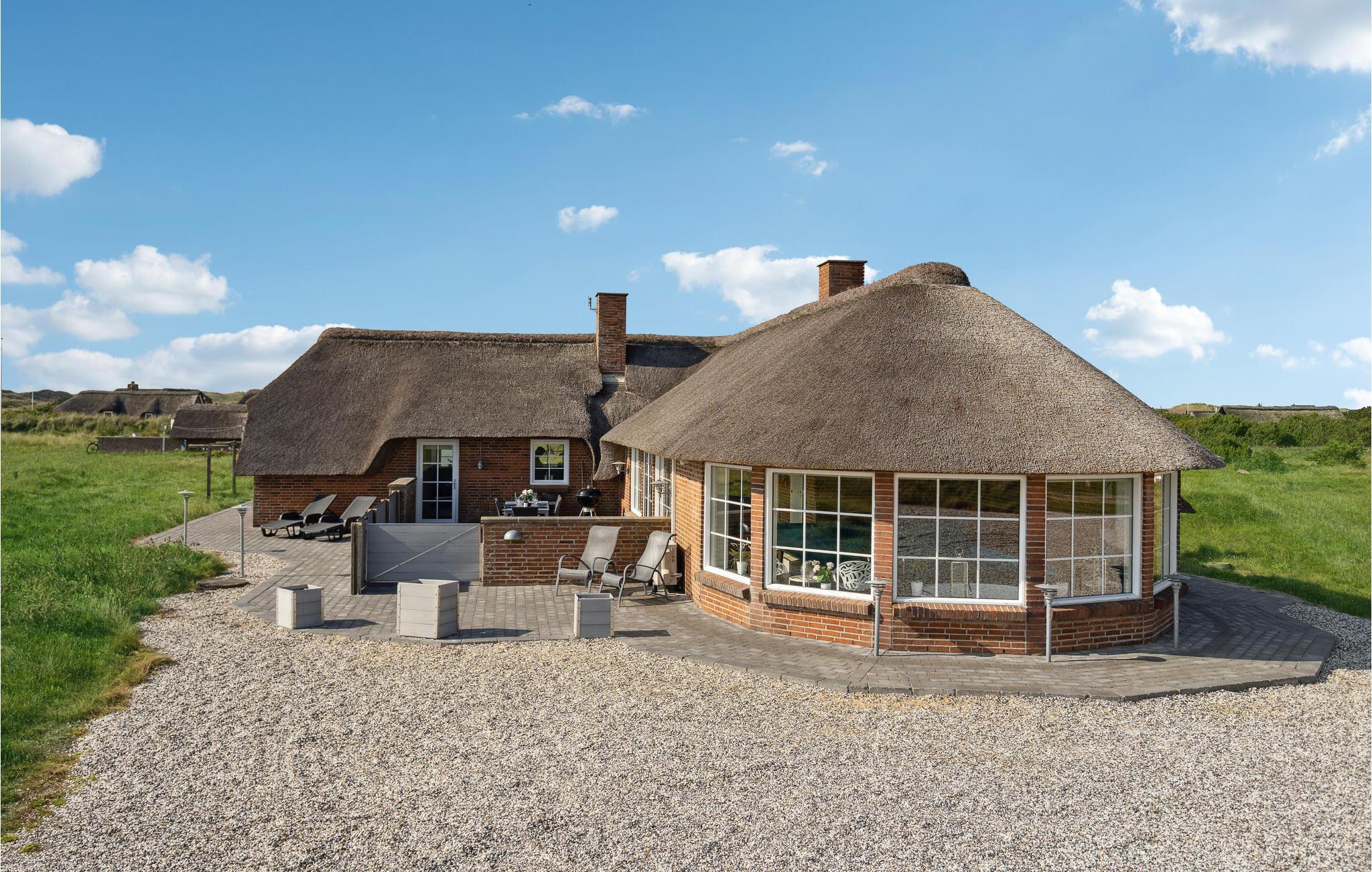 Attraktives Ferienhaus mit Reetdach, Innenpool, Sauna und herrlichem Blick auf die Dünen, nur wenige Schritte vom Strand entfernt.
