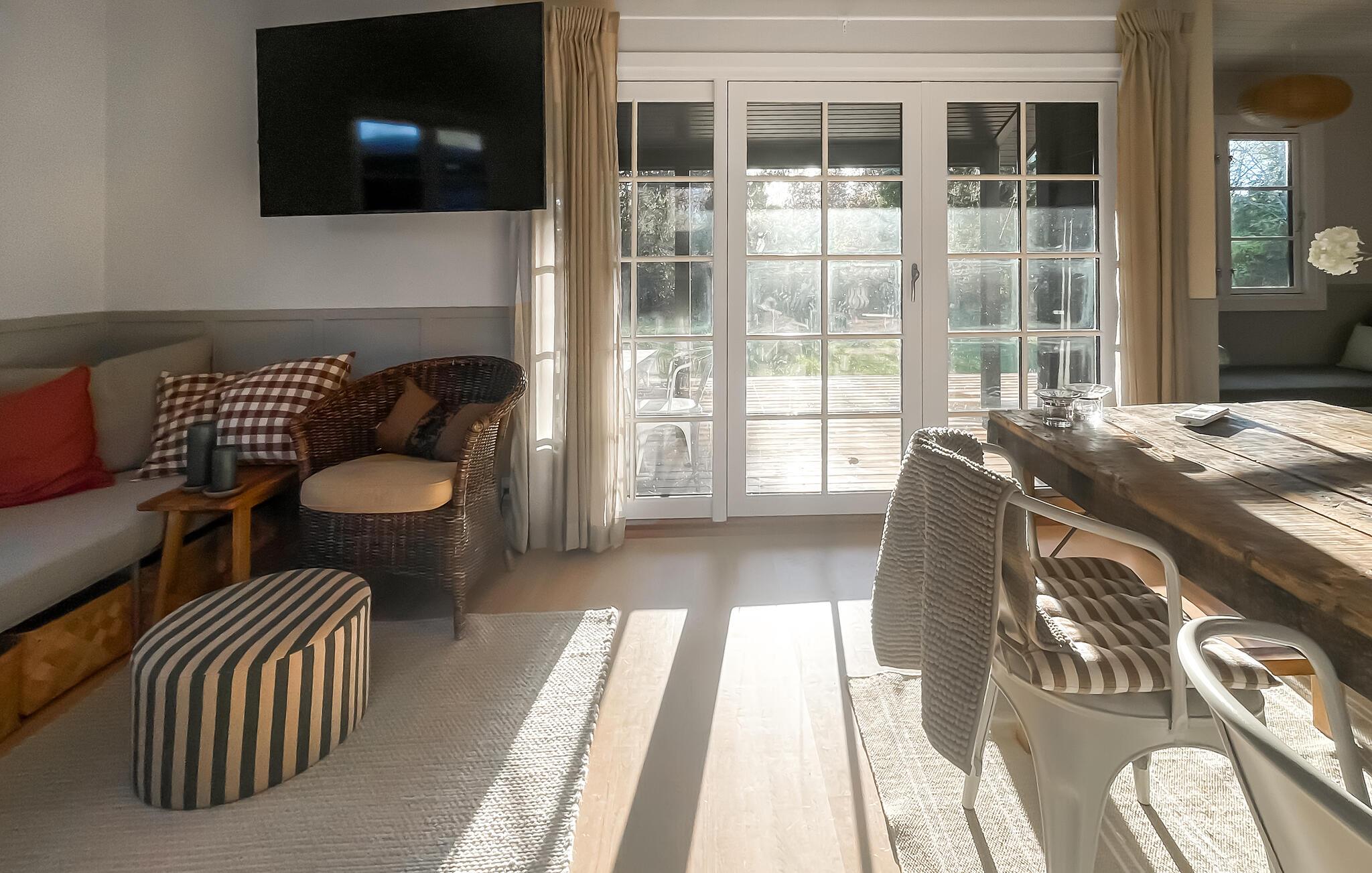 Lassen Sie sich in den hellen Wohnräumen von der freundlichen Atmosphäre empfangen. Der Innenbereich Ihres Ferienhauses ist gemütlich gestaltet. Nutzen Sie den offenen Wohn- und Essbereich, der mit gemütlichen Sitznischen, warmen Holzdetails und großen Fensterfronten einladend wirkt. Entspannen Sie auf der Sofalandschaft oder setzen Sie sich an den Holztisch, der Platz für gemeinsame Mahlzeiten oder Spieleabende schafft. Die Küche ist kompakt und bietet Ihnen funktionale Arbeitsflächen zum Zubereiten der gemeinsamen Mahlzeiten.