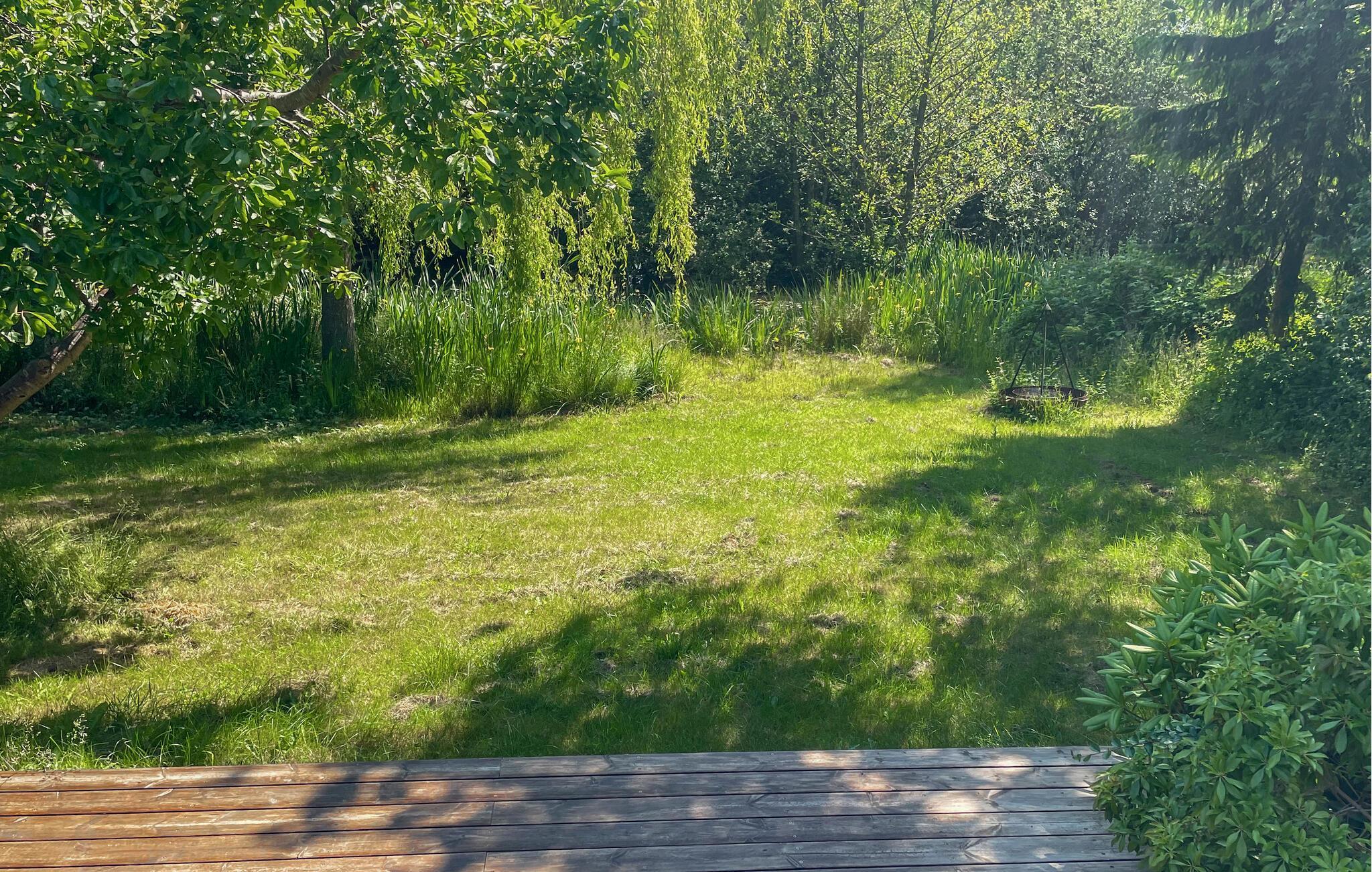 Nutzen Sie die großzügigen Holzterrassen auf Vorder- und Rückseite für sonnige Mahlzeiten im Freien oder entspannte Nachmittage im Schatten. Ruhen Sie sich auf den Gartenmöbeln aus oder entfachen Sie abends ein Lagerfeuer an der Feuerstelle, ein idealer Ort, um den Tag ausklingen zu lassen. Der bewachsene Naturgarten sorgt für Ruhe und Privatsphäre.