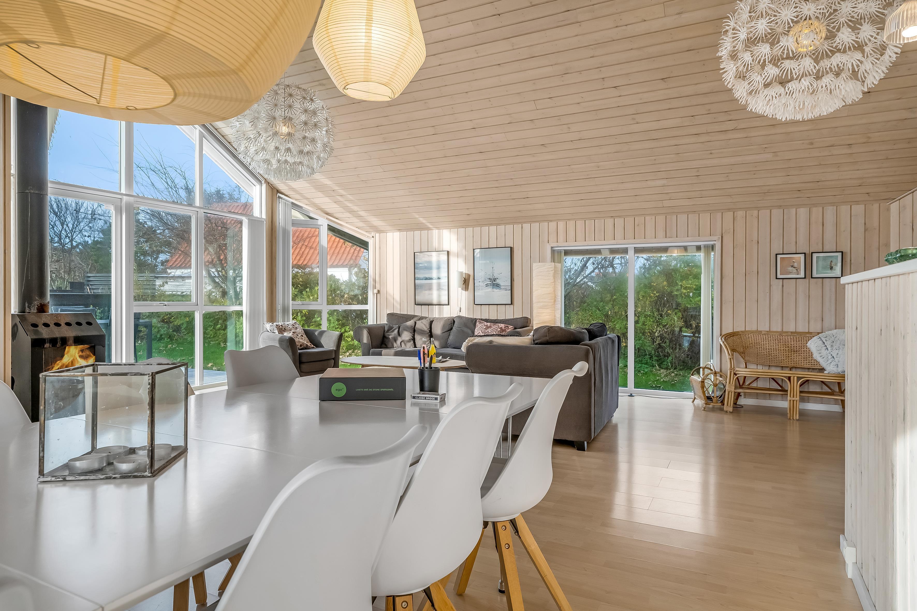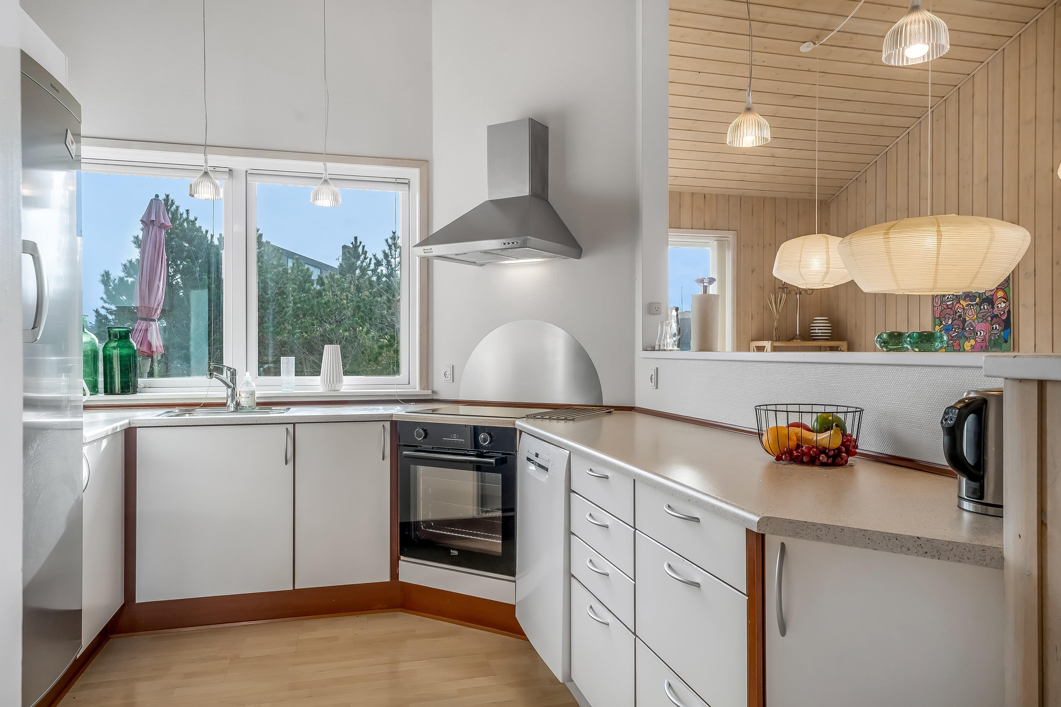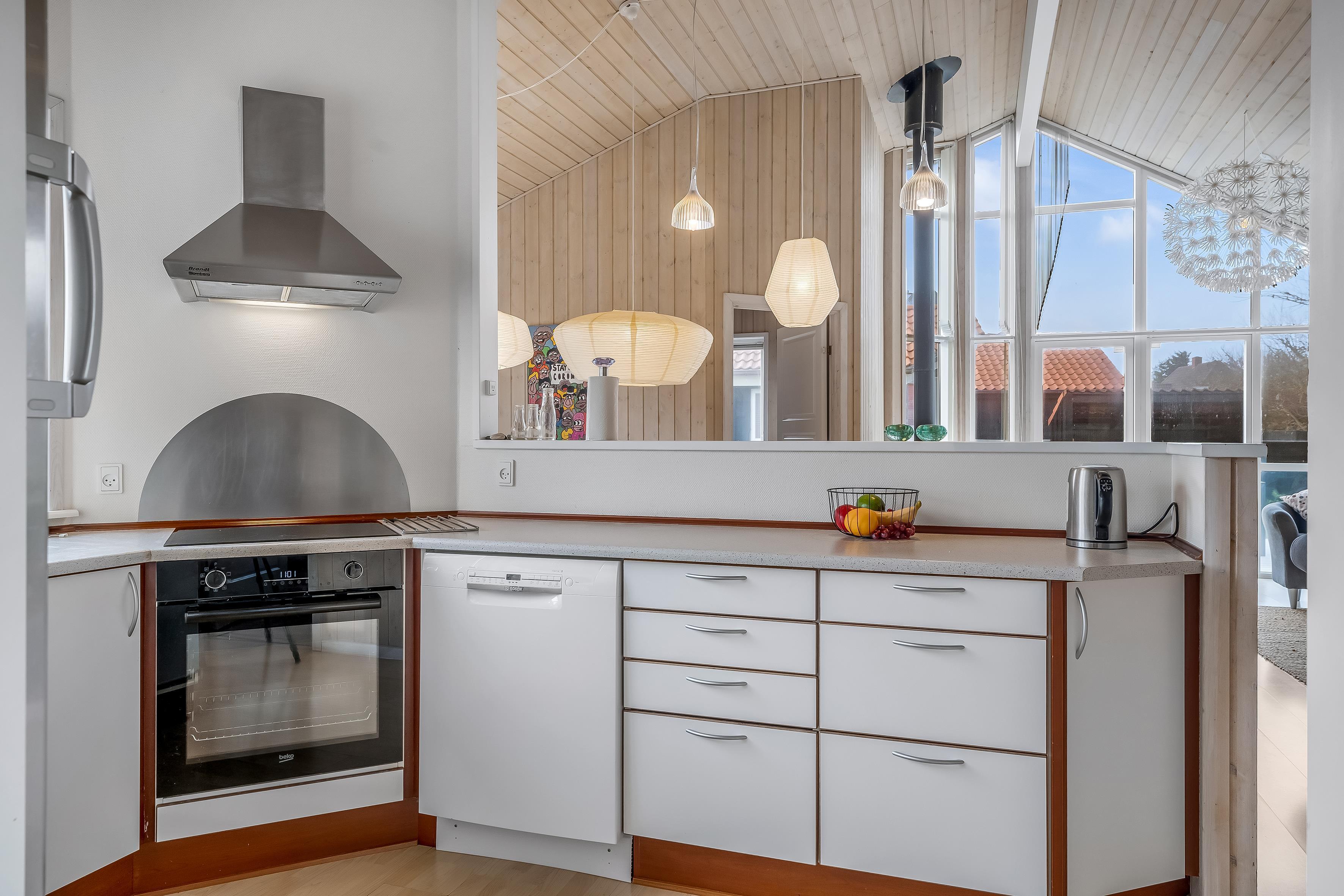 Das Wohnzimmer des Hauses ist der ideale Ort zum Zusammensein. Genießen Sie das warme Feuer im Holzofen oder schauen Sie einen Film auf dem großen Fernseher mit dänischem und deutschem Fernsehen. Mit Chromecast und WLAN können Sie ganz einfach Ihre Lieblingssendungen streamen oder mit der Außenwelt in Kontakt bleiben. Für alle, die köstliche Mahlzeiten zubereiten möchten, ist die moderne Küche mit allen notwendigen Geräten ausgestattet, darunter Induktionsherd, Backofen, Mikrowelle, Geschirrspüler, Kühlschrank und Kaffeemaschine.