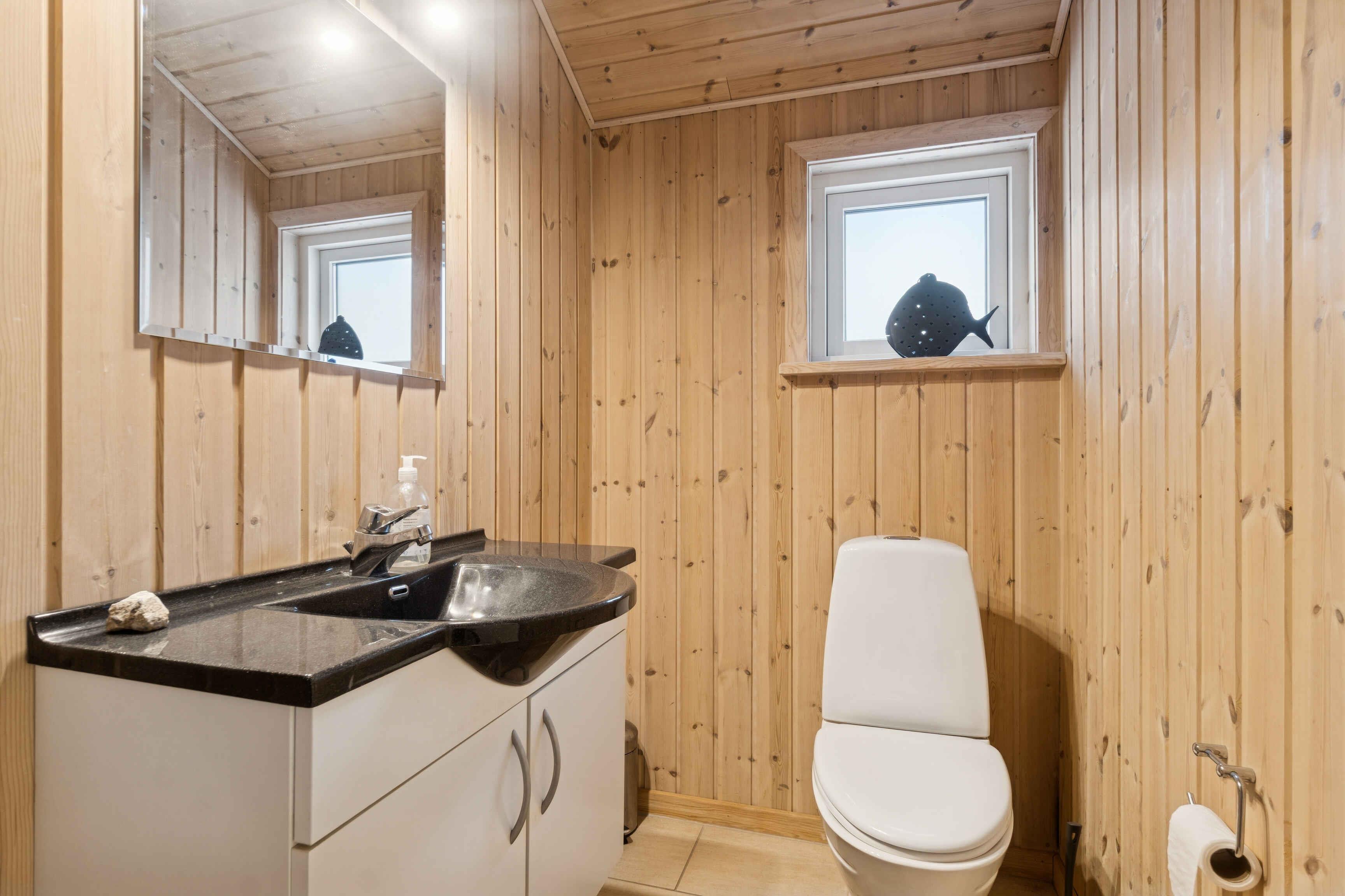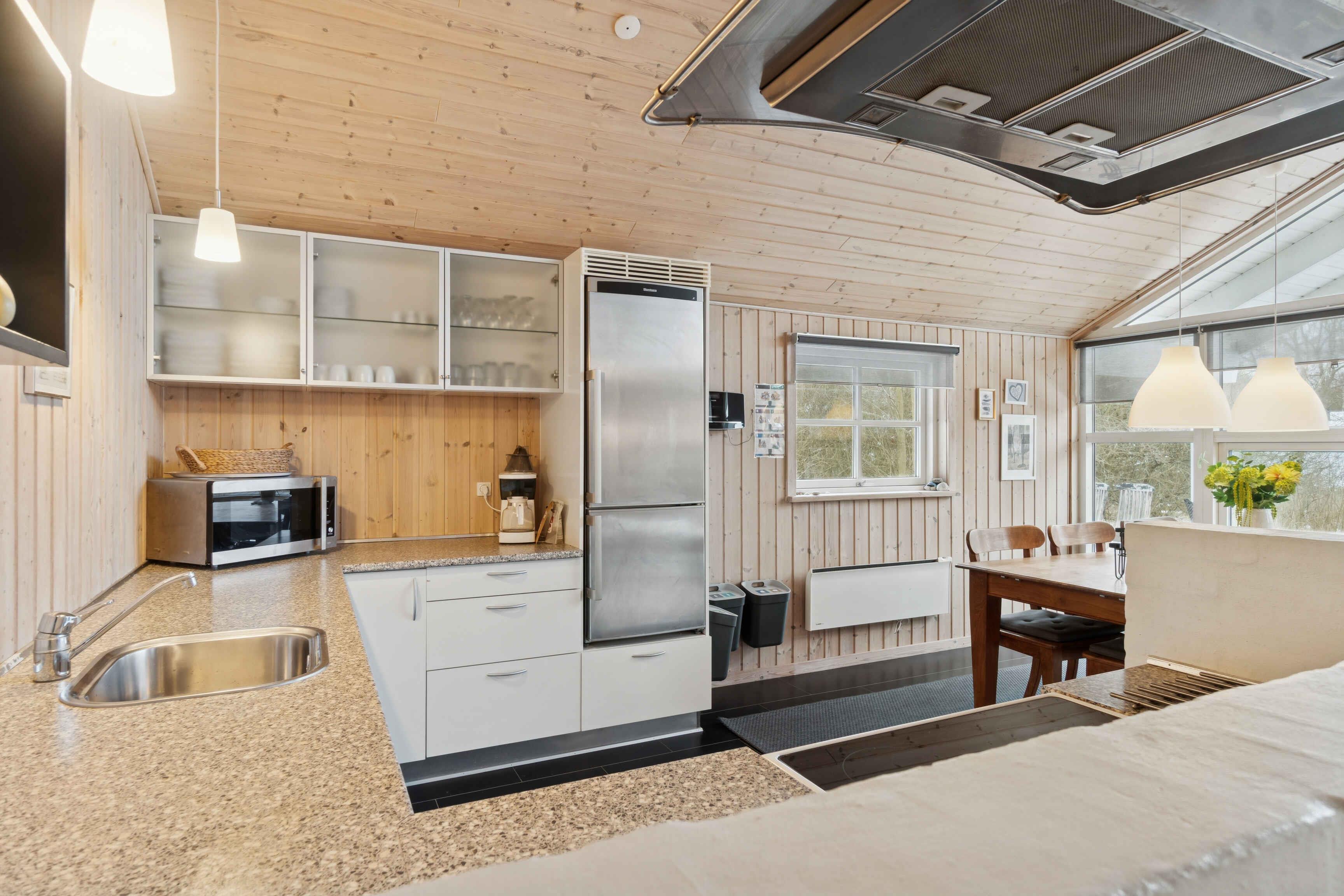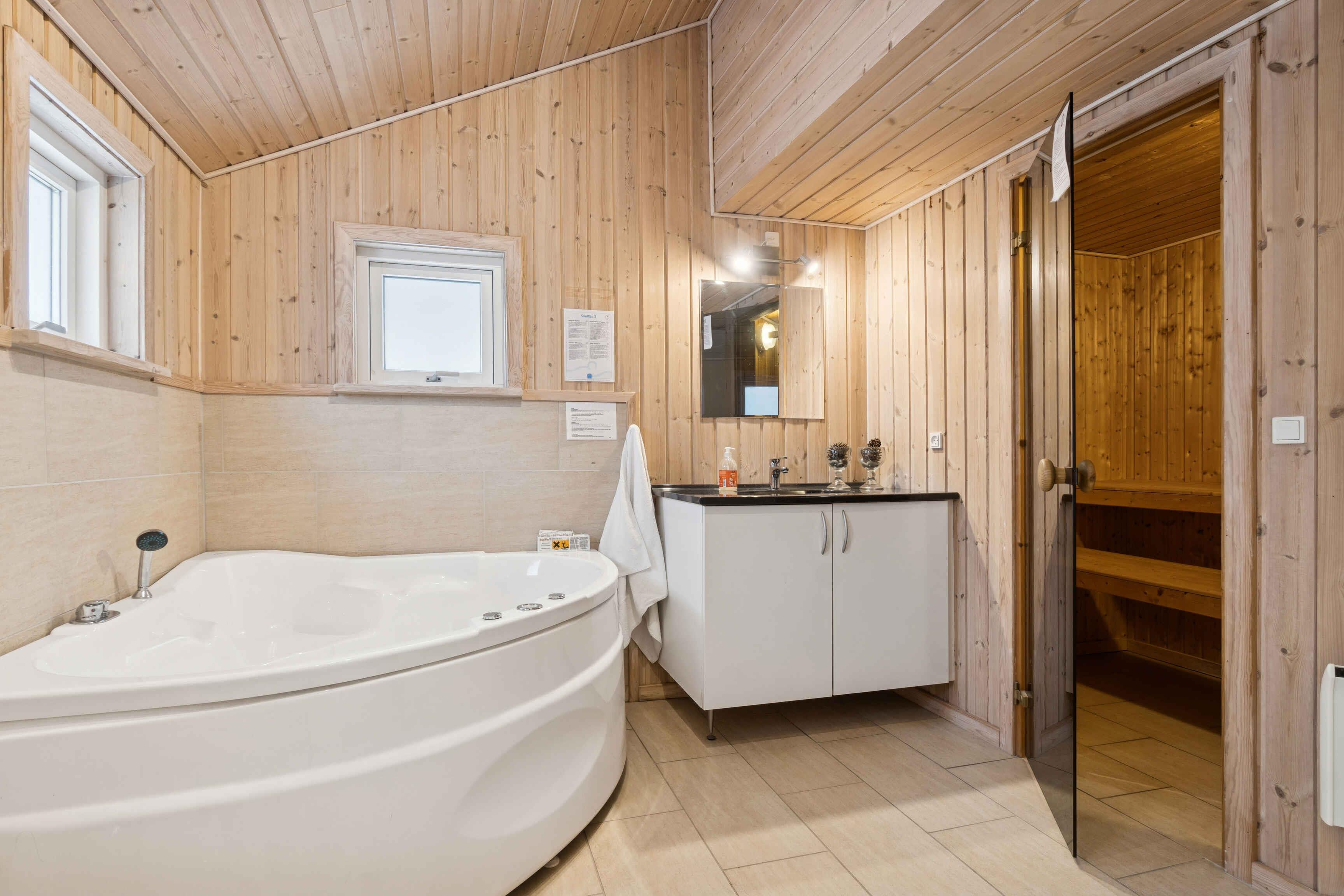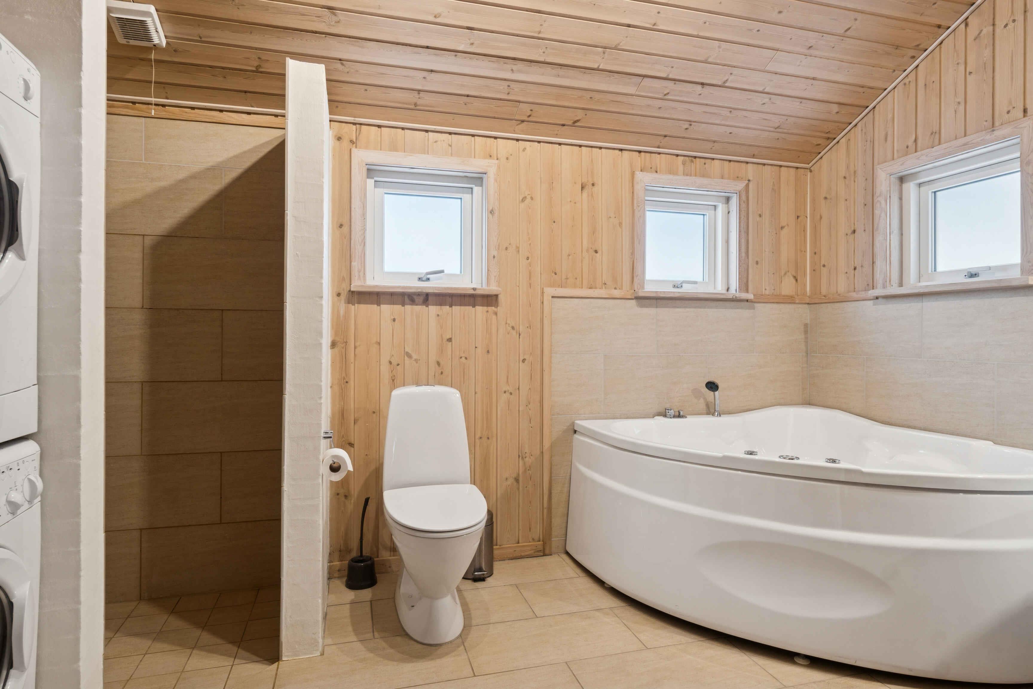 Dieses moderne Ferienhaus mit einer Fläche von 100 m² bietet einen stimmungsvollen Rahmen für Ihren Urlaub. Das Haus ist auf versetzten Ebenen gebaut, was ein gutes Raumgefühl und eine natürliche Basis für Aufenthalt und Erholung schafft. Die Einrichtung ist hell und funktional mit einer offenen Küche und einem Essbereich, der direkt mit dem Wohnzimmer verbunden ist. Von hier aus gelangt man auf eine überdachte Terrasse, auf der man vor Wind und Wetter geschützt sitzen kann. Das Haus verfügt über drei schöne Schlafzimmer sowie einen geräumigen Dachboden, wodurch es sich für zwei Familien oder mehrere Generationen eignet. Das Badezimmer ist schön eingerichtet und verfügt sowohl über einen Whirlpool als auch eine Sauna, in denen man sich nach den Erlebnissen des Tages entspannen kann. Das Ferienhaus liegt an einem sehr kleinen See, und die Natur kann direkt von der Terrasse aus erlebt werden. Hier herrscht Ruhe, es gibt viele Vögel und eine besondere Nähe zur Umgebung, die zum Entspannen und zum Leben im Freien einlädt. Die Region Helgenæs ist ein wunderschönes Naturgebiet mit hügeligem Gelände, kurvenreichen Straßen und Blick auf das Wasser von vielen Orten aus. Die reiche Tierwelt und die abwechslungsreiche Natur machen die Gegend ideal zum Wandern und Radfahren. Das Wasser ist etwa 450 Meter entfernt, und die Küste bietet gute Möglichkeiten zum Baden und Spazierengehen am Strand. Ein Ausflug zum Leuchtturm Sletterhage Fyr ist ebenfalls empfehlenswert und bietet einen schönen Blick auf das Meer. Die Gegend ist friedlich und frei von Alltagsstress, was auch bedeutet, dass die Mobilfunkabdeckung in ihrer Qualität schwanken kann. Dafür erhalten Sie einen Urlaub mit Fokus auf Natur, Zusammensein und Ruhe in einer wunderschönen Umgebung.