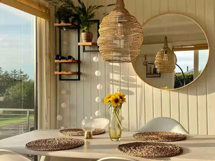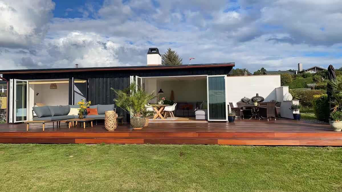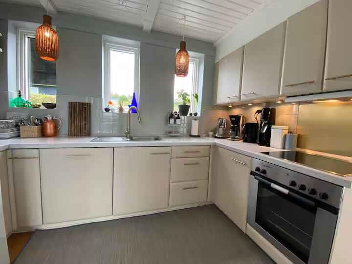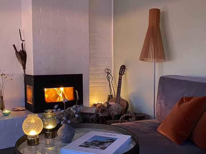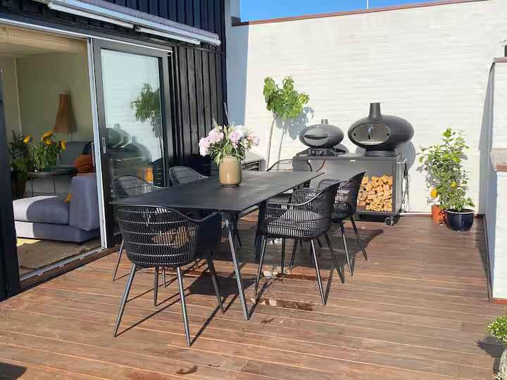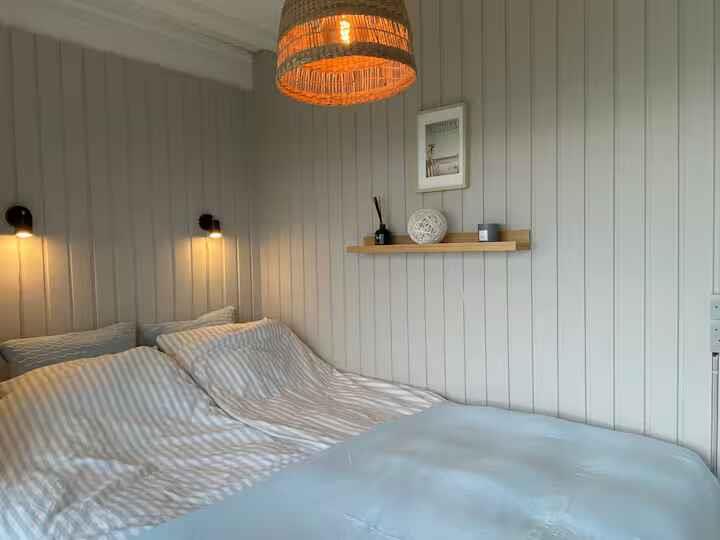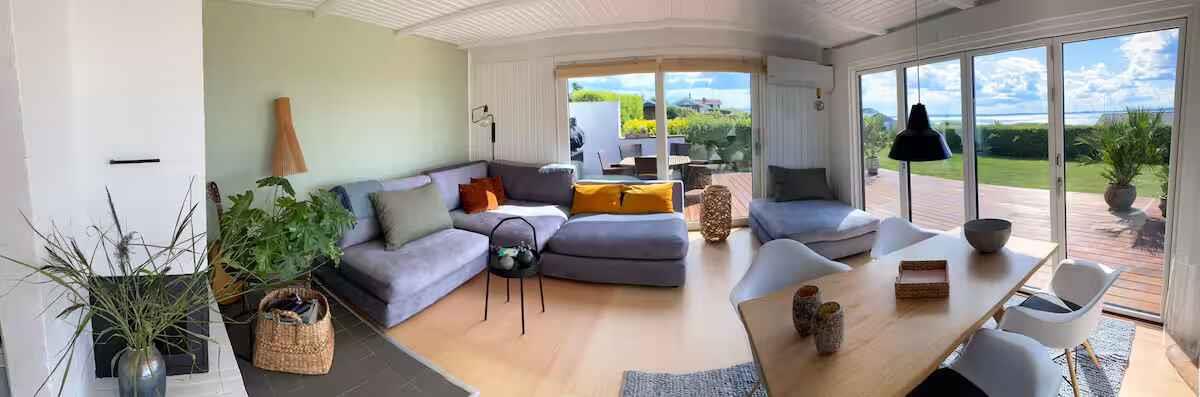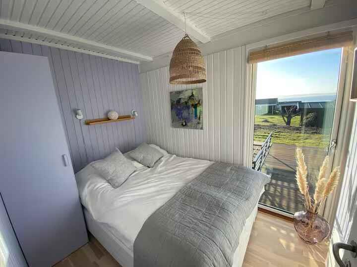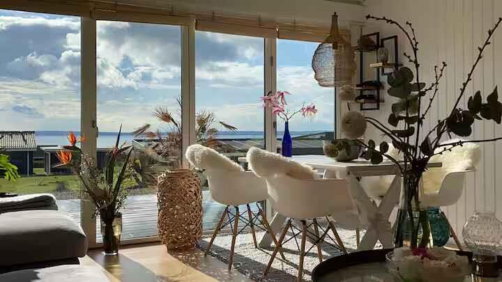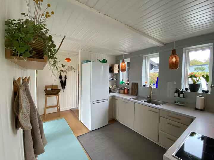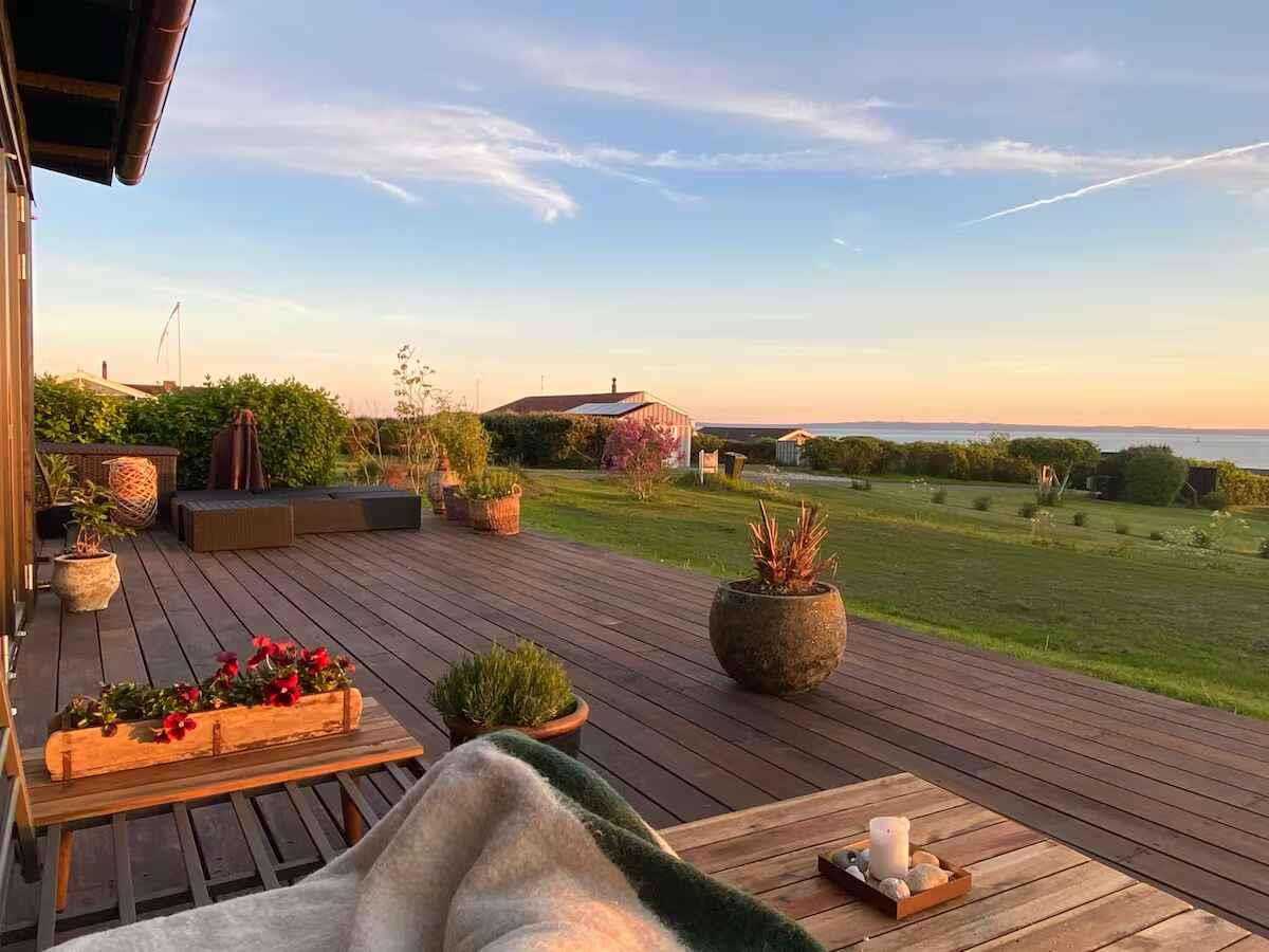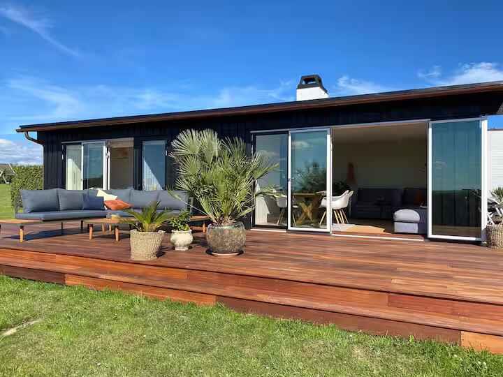 180° Meerblick, 2 Schlafzimmer, Kaminofen, Terrasse, Pizzaofen und Elektrogrill, großer Garten und Außendusche. 350 m zum Badestrand, saisonales Restaurant, Eis und Bäckerei. Nähe Mols Bjerge, 20 km nach Ebeltoft, 50 km nach Aarhus. Einkauf und Tankstelle 4 km. Unterkunft Willkommen in Casa Mols, einem frisch renovierten Ferienhaus am Skødshoved Strand mit 180° Meerblick, nur 350 m vom Strand, Hafen und saisonalen Restaurants entfernt. Große, möblierte Terrasse (80 m²) mit Morgen- und Abendsonne. Helles, freundliches Interieur. Wohnzimmer mit großer Lounge-Couch und Falttüren mit Panoramablick auf die Aarhus-Bucht. Offene Küche, Kaminofen und energieeffiziente Wärmepumpe. Auf der Terrasse stehen ein Morsø-Pizzaofen und Elektrogrill. Zwei Schlafzimmer mit neuen Matratzen (140 cm und 120 cm). Ein Zimmer mit vollständig zu öffnender Falttür, das andere mit Glastür und Meerblick. Zugang Privates Ferienhaus (55 m²), Terrasse (80 m²), Garten (1.400 m²), Bad mit Dusche, Außendusche, gute Parkmöglichkeiten. Hinweise Renovierung 2020. Warmwasserboiler 20 l. Zwei Außengrills (Gas & Pizzaofen). Fantastischer Garten mit Meerblick.