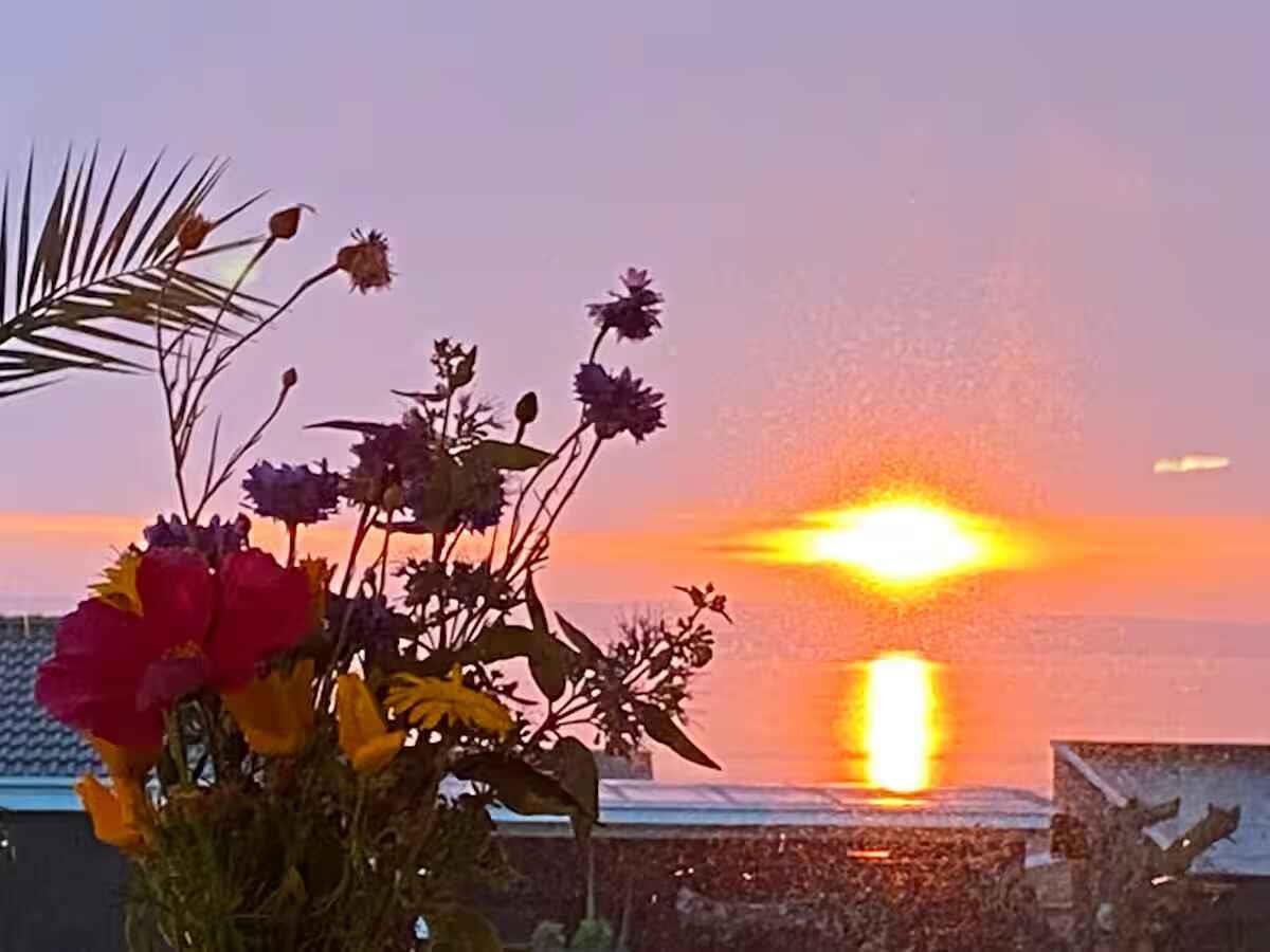 Neu renoviertes Ferienhaus mit 180° Meerblick, 2 Schlafzimmern, Kaminofen und Wärmepumpe. Große Terrasse mit Pizzaofen und Elektrogrill, großer Garten und Außendusche. Nur 350 m zu Strand, Hafen, saisonalem Restaurant, Eis und Bäckerei.