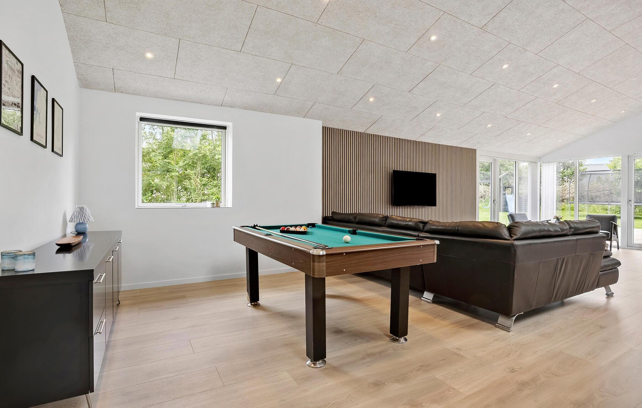 Dieses hochwertig ausgestattete Ferienhaus bietet ideale Voraussetzungen für eine gelungene Auszeit mit der Familie oder Freunden in naturnaher Umgebung. Der großzügige Wohnraum mit offener Küche, großem Esstisch und gemütlicher Sofaecke lädt zu geselligen Stunden ein. Kochen Sie gemeinsam an der modernen Kücheninsel, entspannen Sie sich am Kaminofen oder verbringen Sie den Abend mit einem guten Film. Für Unterhaltung sorgt auch ein Billardtisch, der das Haus zu einem Ort voller Möglichkeiten macht.