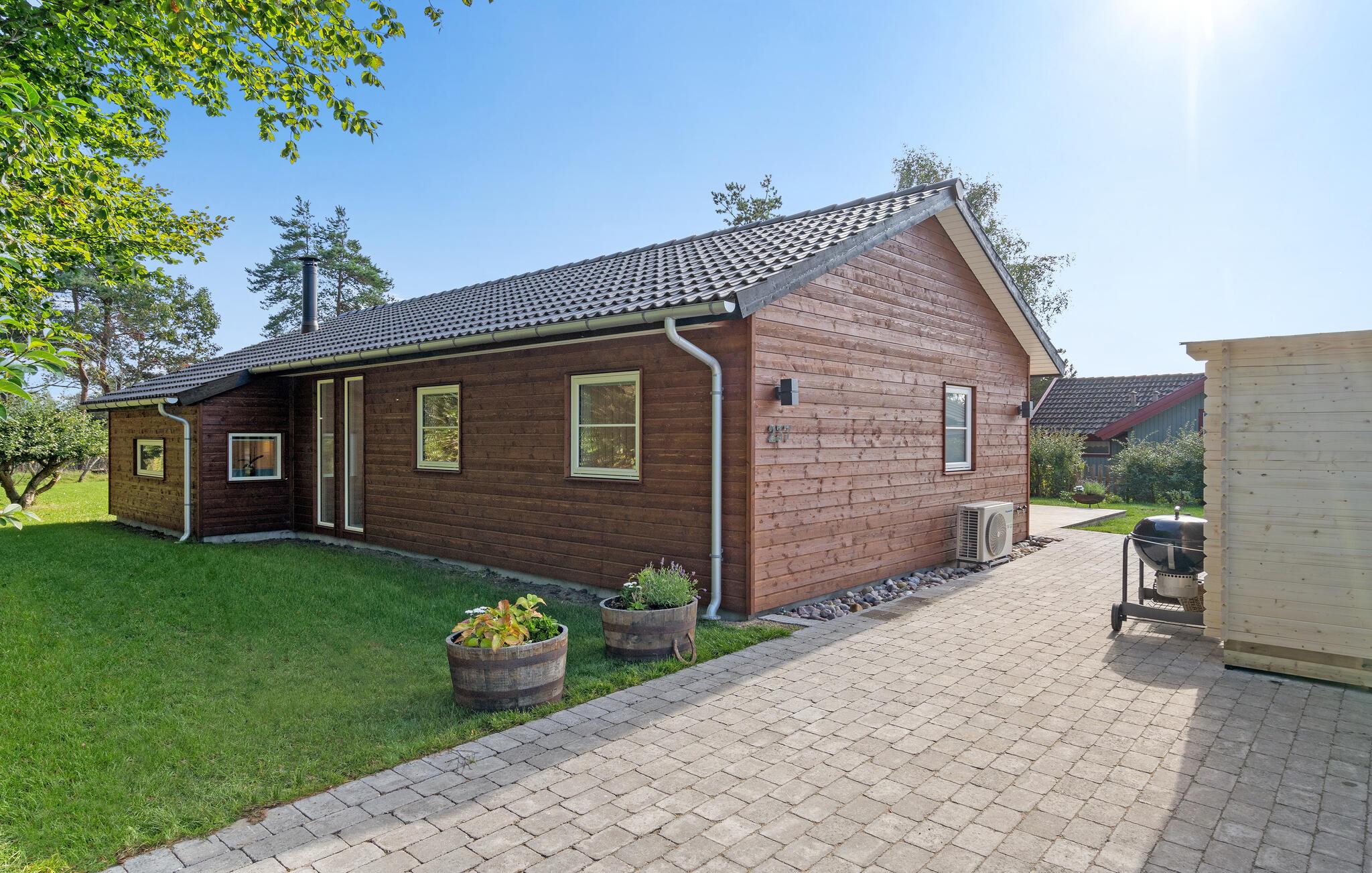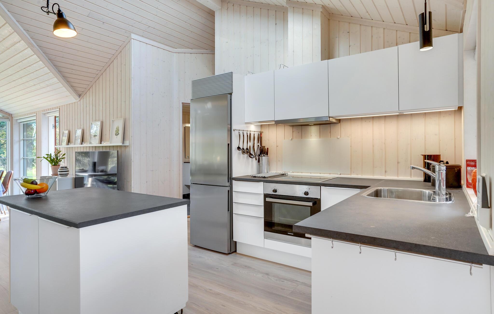 Dieses schöne Holzhaus befindet sich nur circa 500 m vom Sandstrand und ist ideal für einen fantastischen Urlaub mit der Familie oder Freunden. Das Herz des Hauses ist das offen gestaltete Wohnzimmer mit Essbereich und offener Küche. An kühlen Tagen spendet der Kamin angenehme Wärme und verbreitet eine gemütliche Stimmung. Dank der großen Fenster fällt viel Tageslicht herein und vom Esstisch haben Sie einen schönen Blick in den Garten.