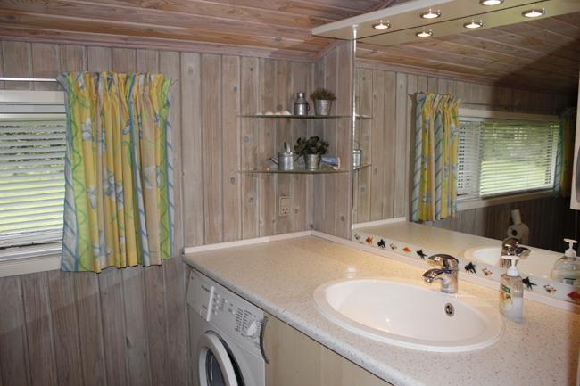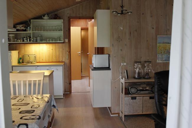 The house has one bathroom and three bedrooms, whereas one has two single beds and the other two each have a double bed. These rooms are designed with calm colours and furniture, so the whole body can relax at night. The whole house is decorated with lovely pictures, arts and crafts to create the cosy atmosphere. Furthermore, the inside of the house is covered with lightwood, which provides a fantastic lightness and the correct holiday cottage atmosphere.