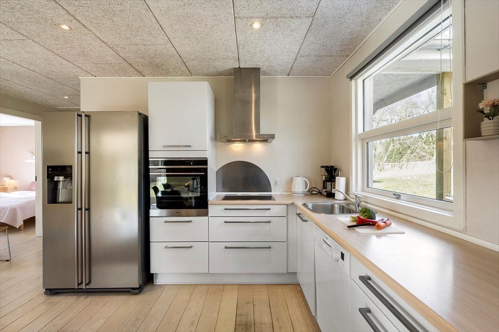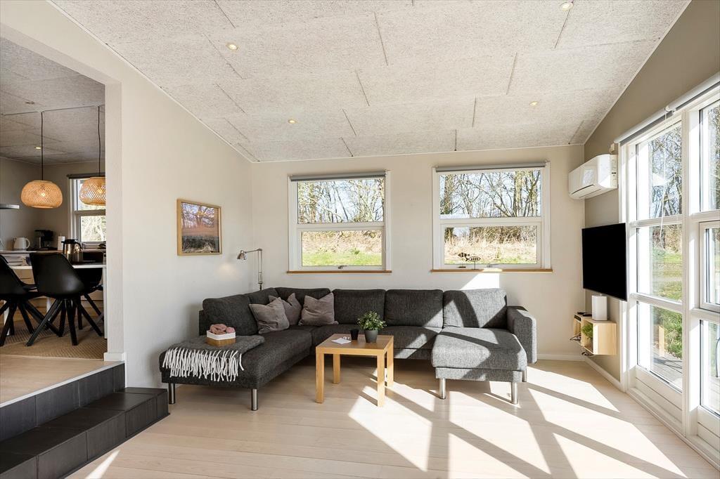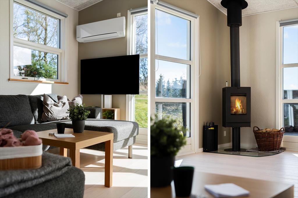 Das Ferienhaus ist geschmackvoll und hell eingerichtet mit modernen Möbeln in guter Qualität. Mit drei Schlafzimmern bietet das Haus Platz für bis zu sechs Personen. Das große und schöne Badezimmer ist direkt mit dem Spa-Bereich verbunden. Die Küche bietet viel Platz und ist mit hochwertigen Haushaltsgeräten ausgestattet, darunter ein amerikanischer Kühlschrank. Zudem stehen in der Diele eine Waschmaschine und ein Trockner zur Verfügung. Das Wohnzimmer liegt eine Ebene tiefer als der Rest des Hauses und wird von großen Fenstern dominiert, die für ein schönes Licht sorgen. Hier gibt es auch ein großes Sofa, einen Kamin und einen Fernseher – ein idealer Ort für gemütliche Stunden mit der Familie. Dank der Erdwärmeheizung sind die Verbrauchskosten niedriger als bei herkömmlich beheizten Häusern.