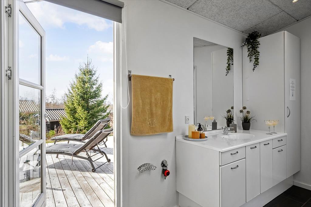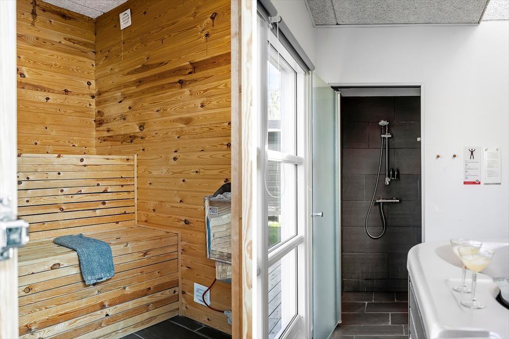 Im hinteren Teil des Ferienhauses befindet sich der wunderbare Spa-Bereich mit einem großen Whirlpool für fünf Personen. Da sich das Becken im Inneren befindet, kann es das ganze Jahr über genutzt werden. Stell dir vor, wie du nach einem langen Tag am Strand oder im Wald im warmen Wasser sitzt und den Blick auf die schöne Natur vor der Tür genießt. Duschen und Sauna sind ebenfalls Teil des Raumes, und von hier aus hat man Zugang zu diesem Teil der Terrasse.