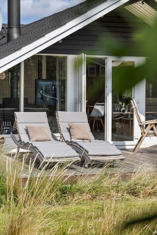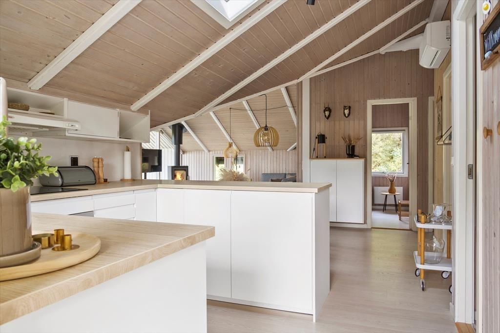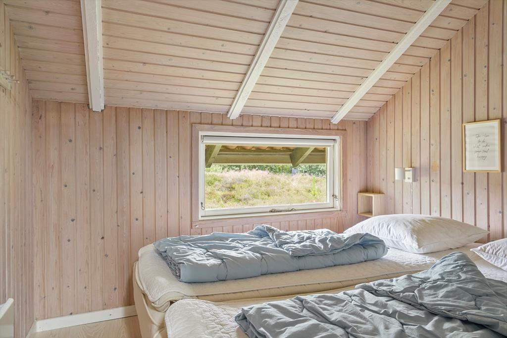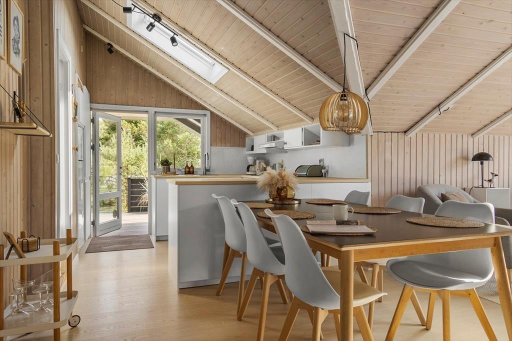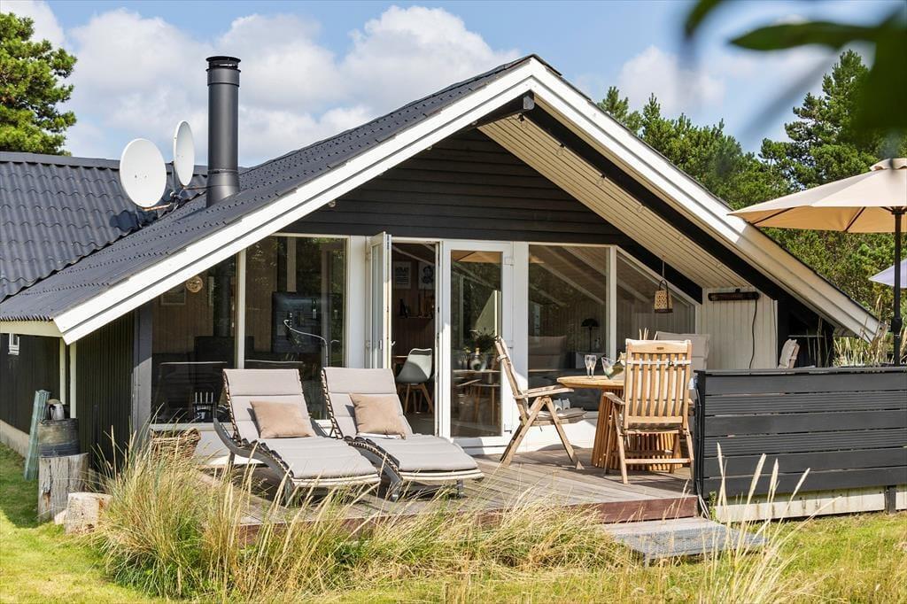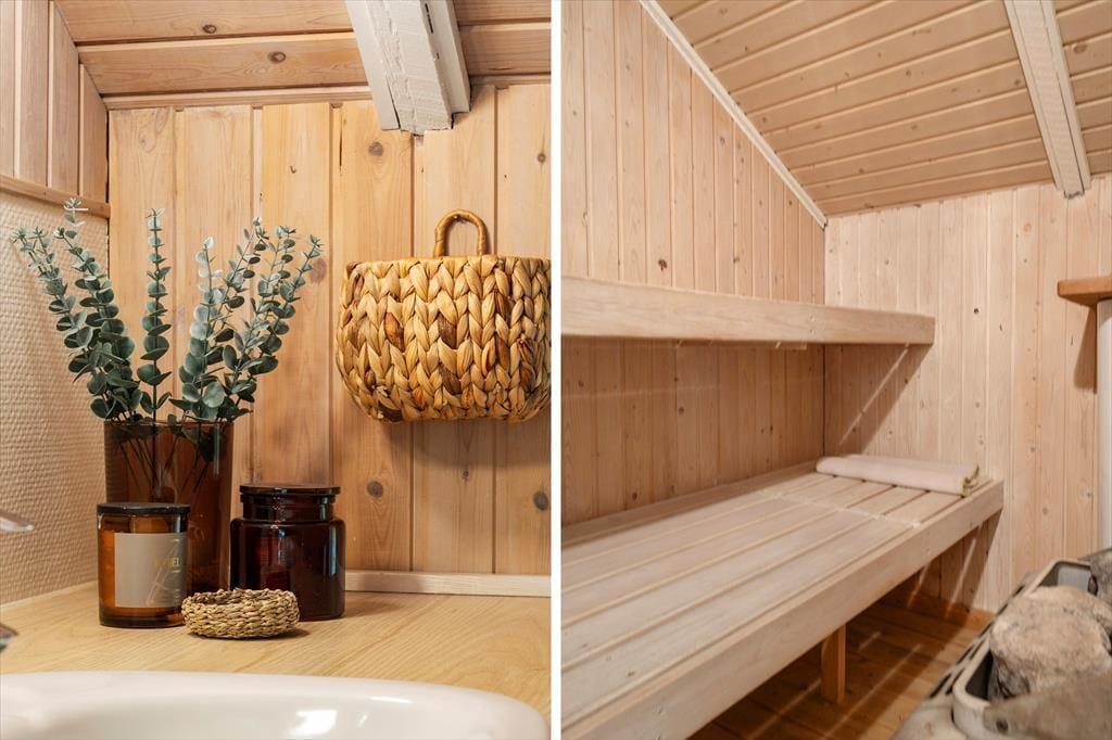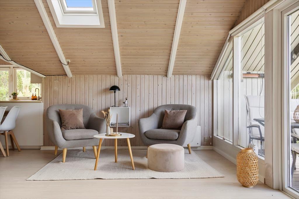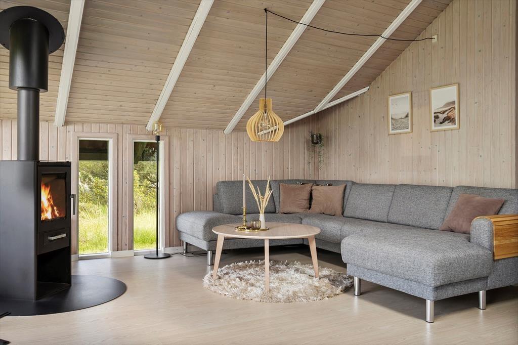 Wenn das Wetter mal nicht so richtig mitspielt, ist das auch kein Problem, denn dieses Ferienhaus ist sowohl gepflegt als auch gut ausgestattet. Im Aufenthaltsbereich werden Sie bestimmt viel Zeit verbringen: Helle Holzleisten an den Wänden und eine schräge, hohe Decke wirken einladend und in einer Ecke steht ein Brennofen für die kalten Tage bereit. Der Raum ist groß, sodass neben bequemen Sitzmöbeln und einem Esstisch viel Platz für eine gut ausgestattete Küchenabteilung vorhanden ist, in der Sie es sich mit Kochprojekten gemütlich machen können – sowohl mit gesunden als auch mit den etwas sündhafteren. Die Raumaufteilung beinhaltet außerdem drei gute Schlafzimmer und ein Badezimmer mit Sauna. Letzteres ist nach einem Spaziergang bei windigem Wetter absolut perfekt, wenn Sie sich wieder so richtig durchwärmen möchten.