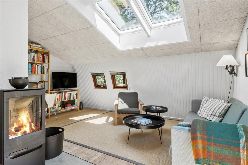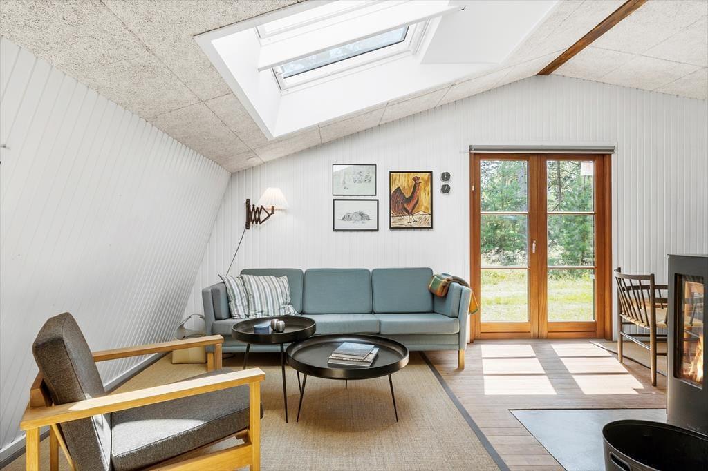 Das schwarz gestrichene Holzhaus steht seit 1961 mitten in der Natur und wurde 2017 erfolgreich modernisiert, sodass es innen hell und einladend ist, während die Räume eine klassische Sommerhausgemütlichkeit ausstrahlen. Selbst wenn du drinnen entspannst, hast du guten Kontakt zur Natur, denn durch die Fenster kannst du auf die hohen Bäume des Grundstücks blicken – und vielleicht siehst du sogar ein Reh oder anderes Wild, das vorsichtig vorbeitrippelt, während du deinen Morgenkaffee am Esstisch genießt. Im Wohnzimmer sorgen Dachfenster dafür, dass viel Sonne hereinkommt, und der Kaminofen trägt zu einer warmen und gemütlichen Atmosphäre bei, während die offene Küche dir einen funktionalen Rahmen für die Essenszubereitung bietet. Ein Duschbad und zwei schöne Schlafzimmer befinden sich ebenfalls im Ferienhaus, und wenn du und deine Lieben mehr Platz benötigen, gibt es ein zusätzliches Schlafzimmer mit Einzelbett und eine Gästetoilette im Nebengebäude.