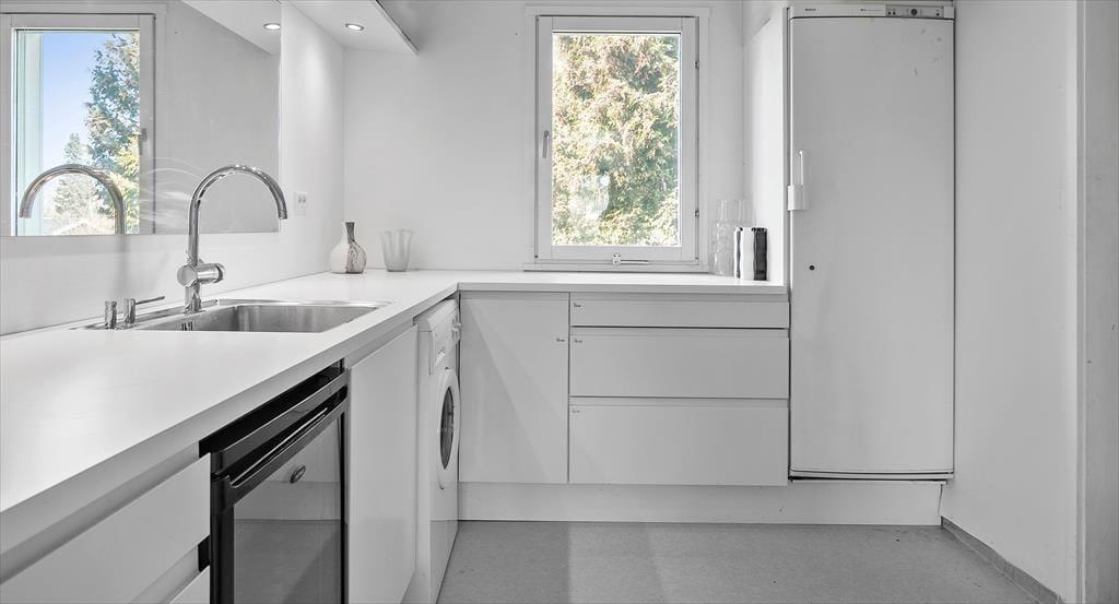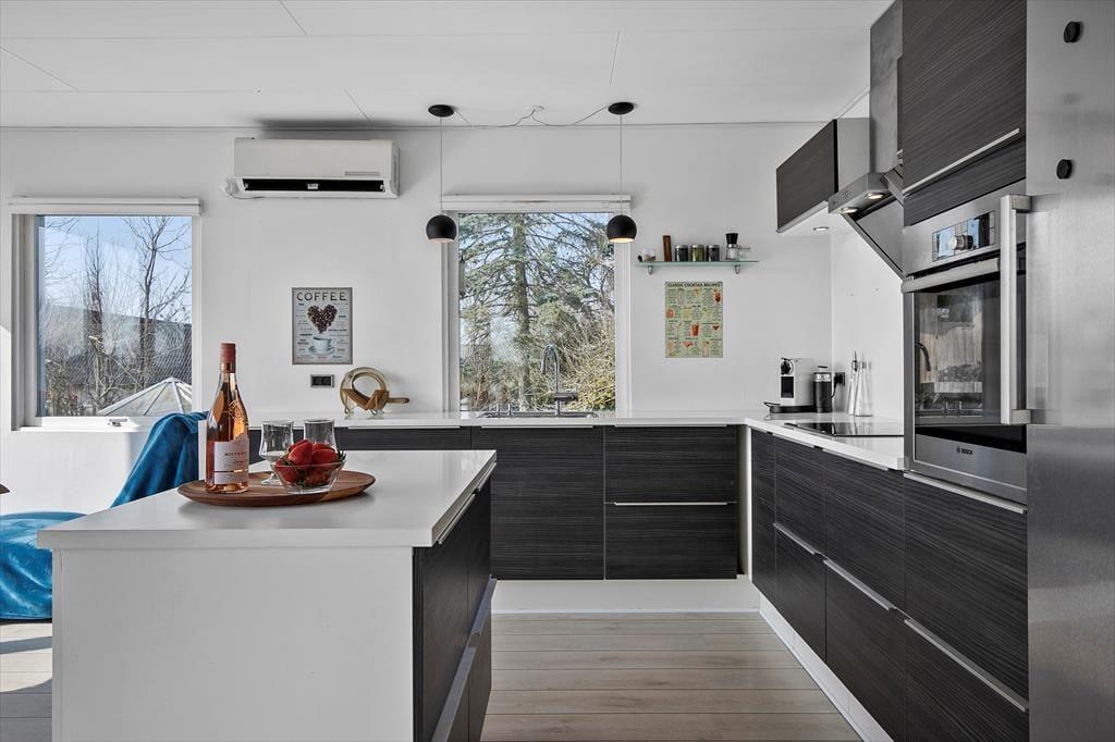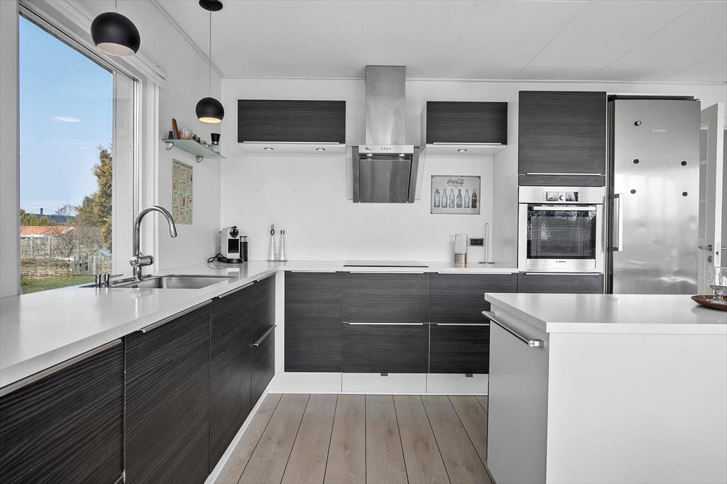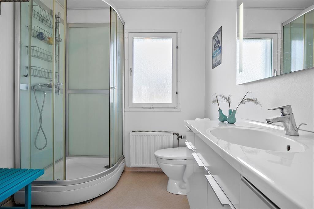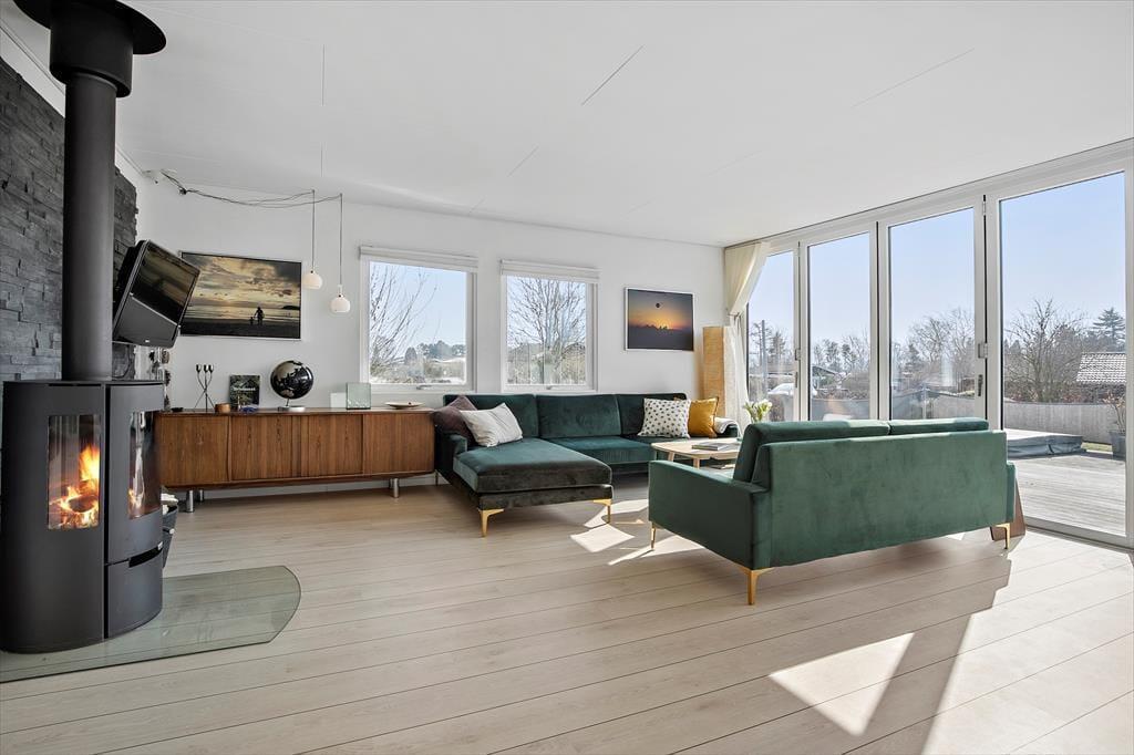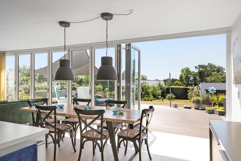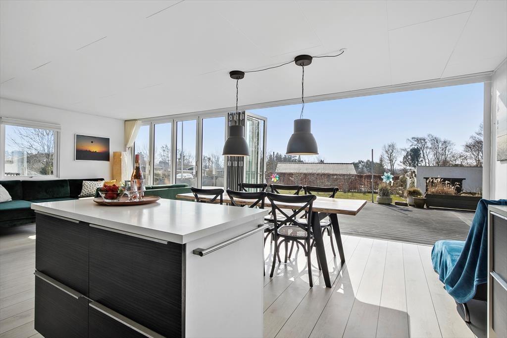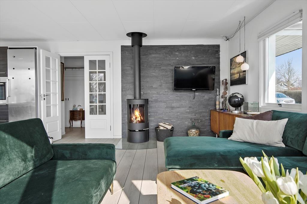 Das Ferienhaus empfängt Sie mit einem offen kombinierten Küchen-, Wohn- und Essbereich, der mit einer großen, gen Süden ausgerichteten Glasfront zu begeistern weiß, die im Übrigen komplett geöffnet werden kann. Von hier aus genießen Sie direkten Zugang zur großen Terrasse. Im Wohn- und Essbereich laden ein guter Essplatz, Sofas, ein Fernseher mit Chromecast) und ein romantisch knisternder Kaminofen zu traumhaft erholsamem Momenten im Kreise Ihrer Lieben ein. In der Küche erleichtern Ihnen diverse Küchengroßgeräte die Zubereitung Ihrer Mahlzeiten. Das Badezimmer verwöhnt mit einer Duschnische und einer Fußbodenheizung. Praktischerweise steht Ihnen auch ein guter Hauswirtschaftsbereich mit einer Waschmaschine und einer Gefriermöglichkeit zur Verfügung. Die Schlafplätze verteilen sich auf insgesamt drei Schlafzimmer, von denen zwei mit je einem Doppelbett ausgestattet sind, das sich auf zwei zusammengeschobenen Einzelbetten zusammensetzt. Im dritten Schlafraum steht Ihnen ein großes Etagenbett (90 x 200 Zentimeter) zur Verfügung. Insgesamt bietet das Ferienhaus angenehm viel Platz und Bewegungsfreiheit. Es überzeugt mit seiner guten Möblierung, den guten Betten und den zahlreichen gemütlichen Aufenthaltsplätzen, die zum Entspannen, Spielen und Lesen einladen. Für die kleinsten Urlauber steht außerdem ein Hochstuhl im Ferienhaus bereit. Das Urlaubsdomizil wird mittels einer Wärmepumpe und des Kaminofens beheizt.