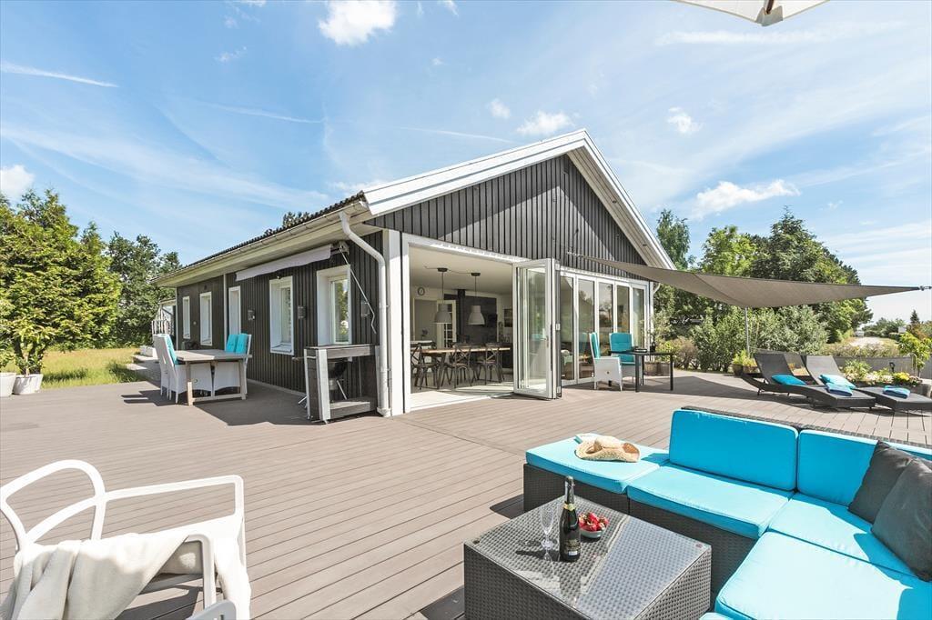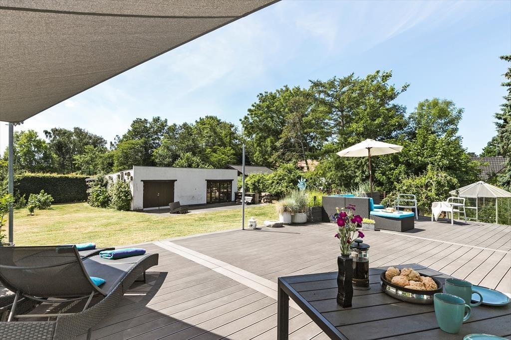Rund um das Haus erstrecken sich schöne Außenanlagen. Der große Garten begeistert mit mehreren Terrassen. Ihre Kinder dürfen sich neben einer Sandkiste und einem Baumhaus auch auf ein Gartentrampolin freuen. Auf dem Grundstück laden mehrere gemütliche Eckchen zum Erholen und zum Genießen ausgedehnter Sonnenbäder ein. Gartenmöbel, Liegestühle, Sonnenschirme, Trampoline und ein Grill stehen selbstverständlich zu Ihrer Verfügung.