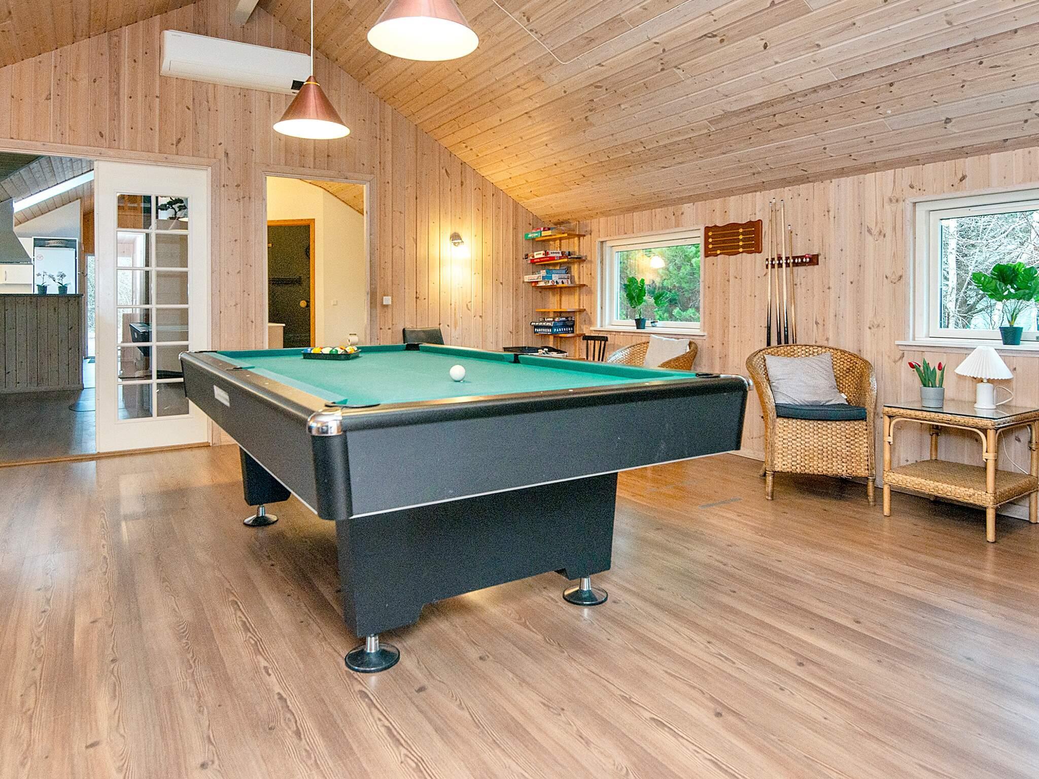 Auf der anderen Seite des zentral gelegenen Ess- und Wohnbereiches betreten Sie den großen Aktivitätsraum, in dem Sie Darst, Tischtennis, Airhockey, Tischfußball oder Billard spielen können. Das Wohnzimmer ist geschmackvoll mit hochwertigem Mobiliar und einem gemütlichen Holzofen eingerichtet. Zudem steht zur Erwärmung eine klimafreundlicze Wärmepumpe zur Verf+gung.