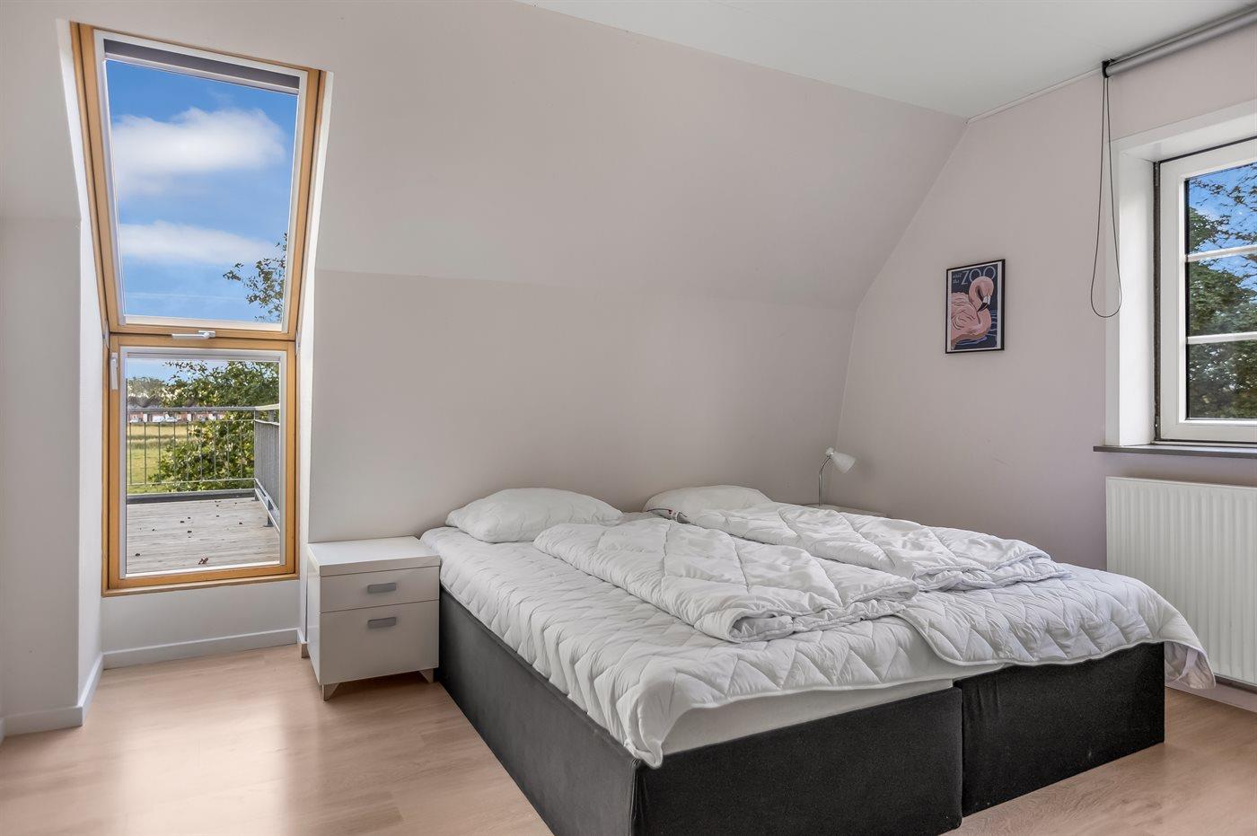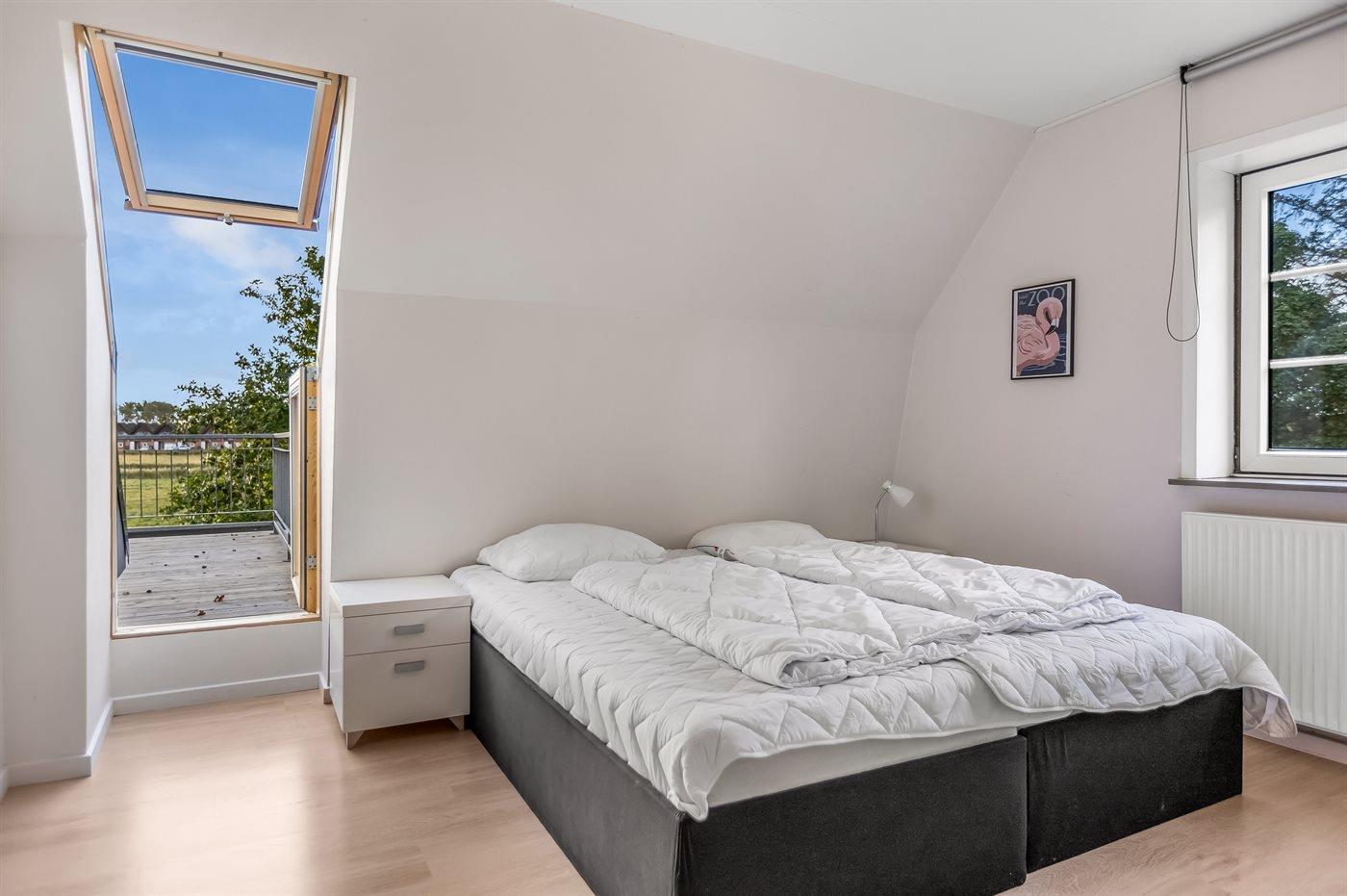 Im Obergeschoss befinden sich drei Schlafzimmer sowie ein weiteres Badezimmer mit Badewanne und Duschnische. Von einem der Schlafzimmer aus hast du Zugang zu einer großen Dachterrasse. Zudem gibt es ein geräumiges offenes Obergeschoss mit eigenem Fernseher. Der Großteil der Räume bietet einen wunderschönen Blick auf das Wattenmeer.