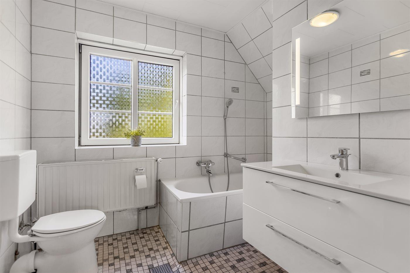 Es gibt 1 Badezimmer mit Fußbodenheizung, Duschnische und Toilette sowie 1 Badezimmer mit Badewanne und Toilette.