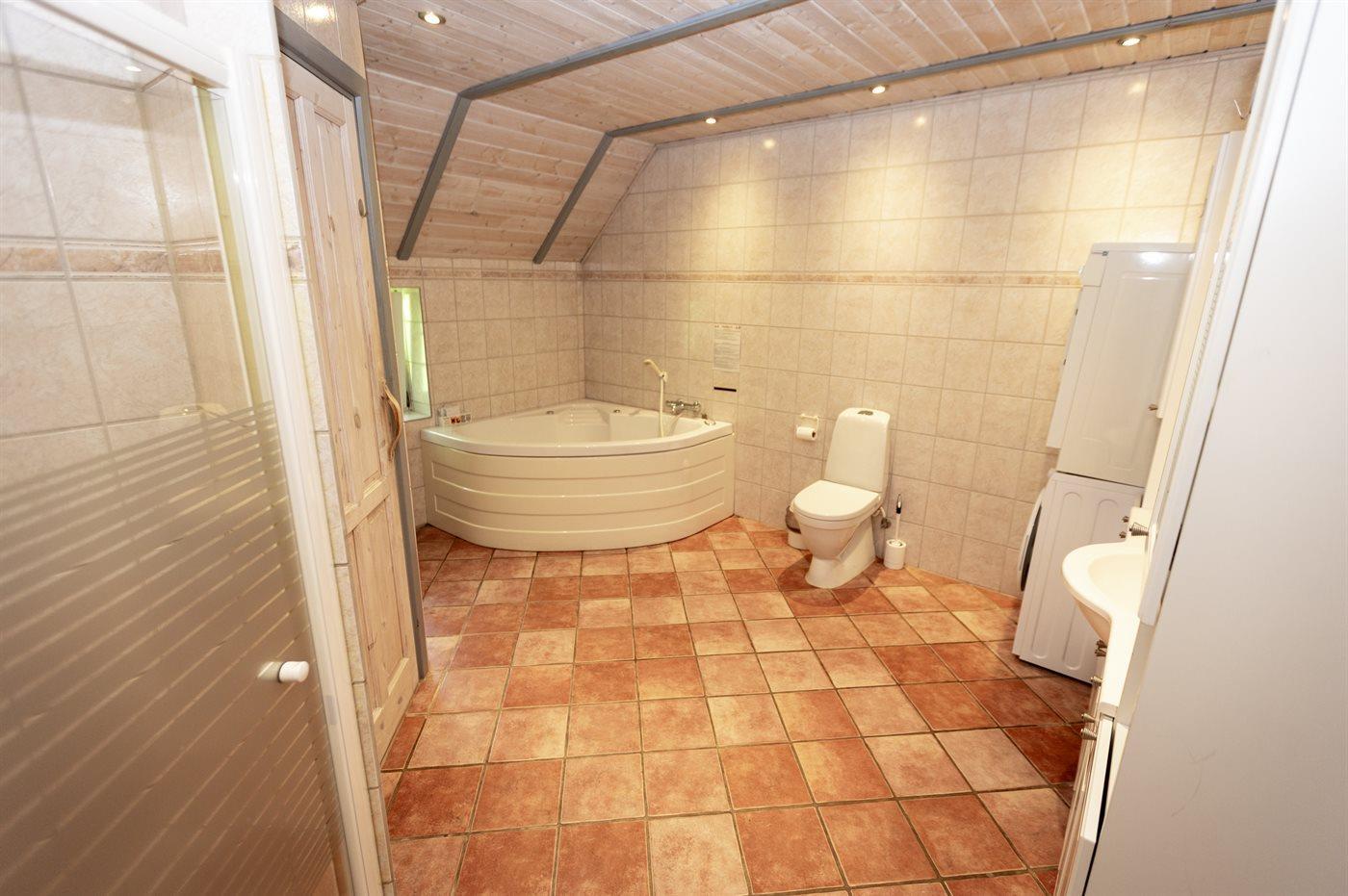 Es gibt 2 Badezimmer mit Dusche und insgesamt 2 Toiletten. Beide Badezimmer verfügen über Fußbodenheizung. Im großen Badezimmer befinden sich eine Sauna und ein Whirlpool für zwei Personen.