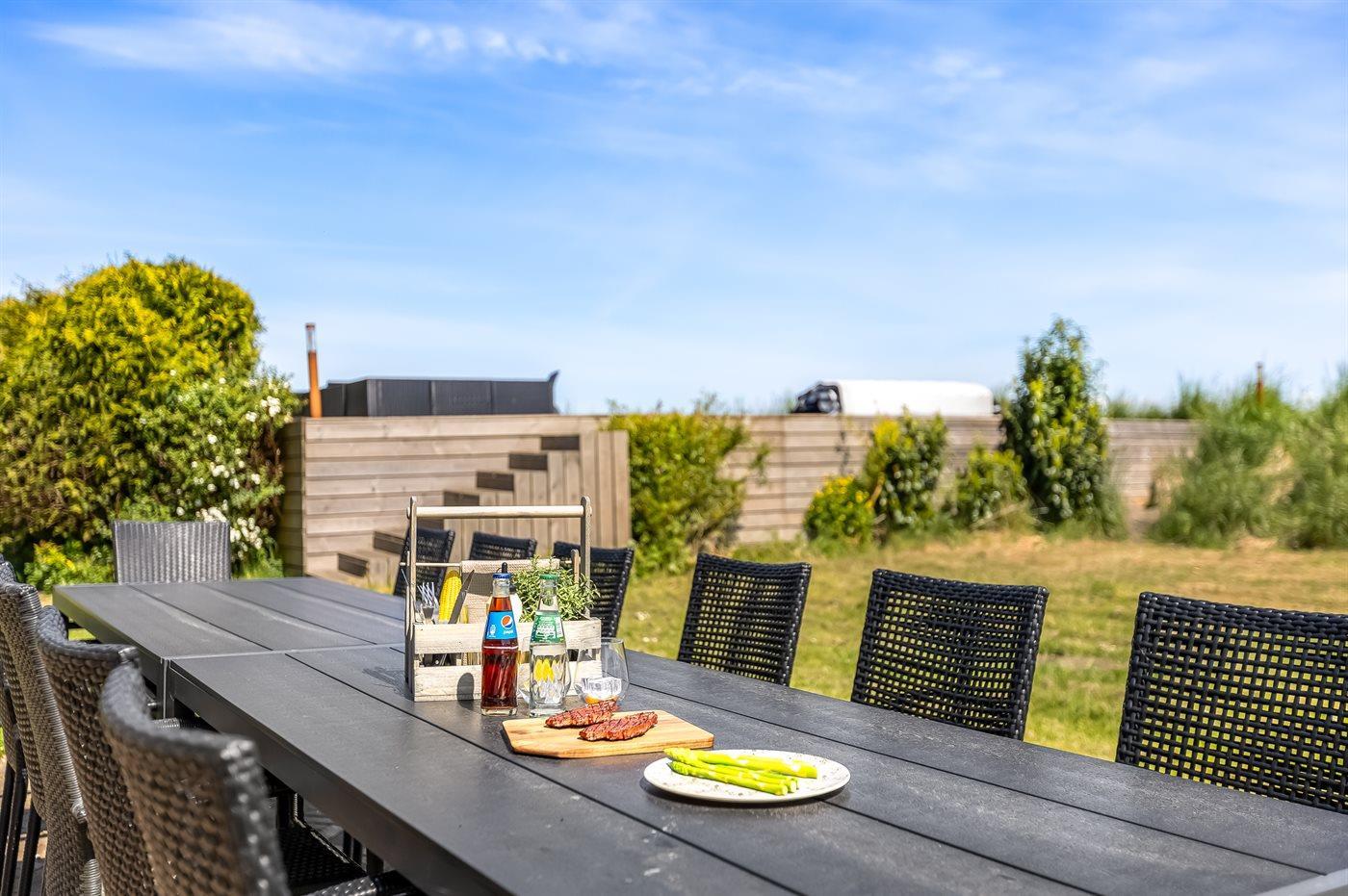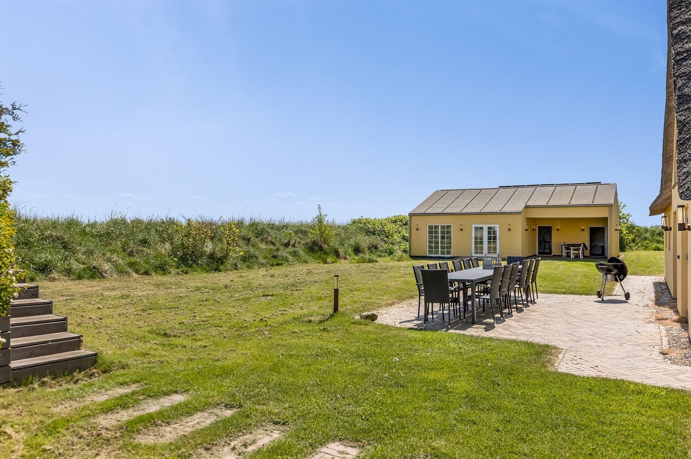 Die Ferienunterkunft liegt auf einem 8400 m² großen, ungestörten Naturgrundstück. Bis zum Meer sind es 4500 m und bis zum Wattenmeer 100 m. Das nächste Geschäft ist 1200 m weit entfernt. Zur Ferienunterkunft gehört ein 50 m² großer, offener Terrassenbereich mit Grill. Darüber hinaus gibt es ein Trampolin und Schaukeln für Kinder. Es ist ein Ladestecker für Elektroautos installiert. Parkmöglichkeiten an der Ferienunterkunft.
