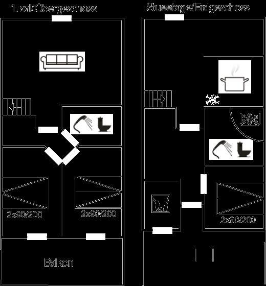 Die Schlafplätze verteilen sich auf 3 Schlafräume. 6 Schlafplätze in Doppelbetten. 2 Schlafplätze in Einzelbetten. 2 von diesen Schlafplätzen befinden sich im offenen Obergeschoss.