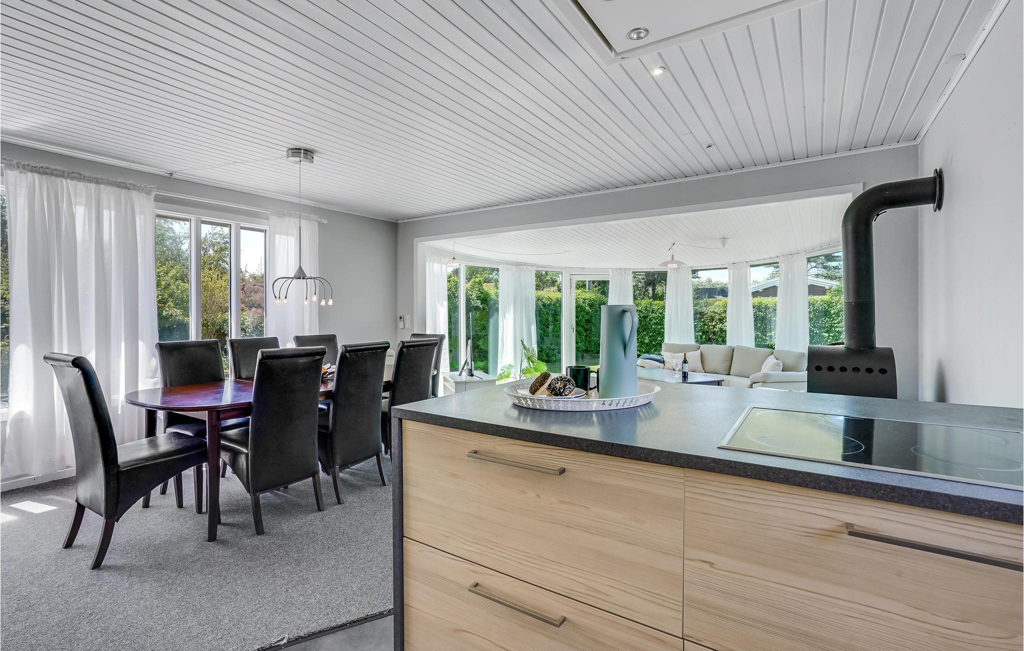 Das Herz des Hauses ist der schöne Wohnbereich mit offener Küche, Ess- und Sofaecke, wo Sie mit Familie oder Freunden zusammen essen, kochen und gemütliche Abende vorm Kamin verbringen können. Die große Fensterfront lässt viel Tageslicht hinein und bietet einen schönen Blick in den Garten.