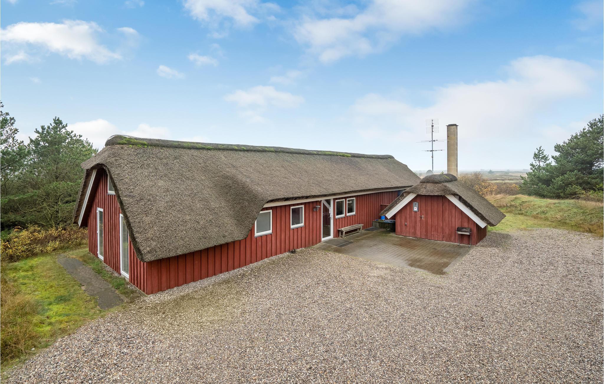 Dieses attraktive, reetgedeckte Ferienhaus in Kongsmark liegt auf einem schönen, heidebewachsenen Grundstück in absolut ruhiger Traum-Lage. Das gepflegte Holzhaus bietet eine fantastische Aussicht auf die Dünenlandschaft des Naturschutzgebietes.