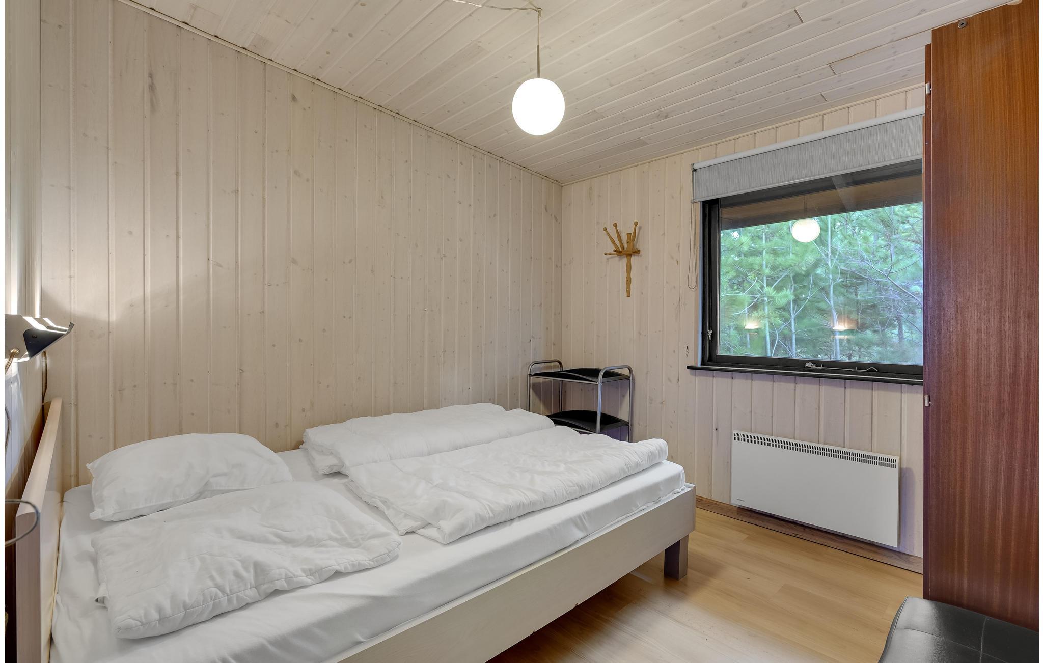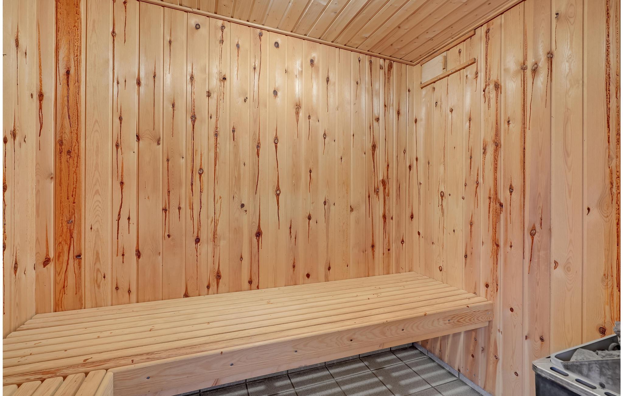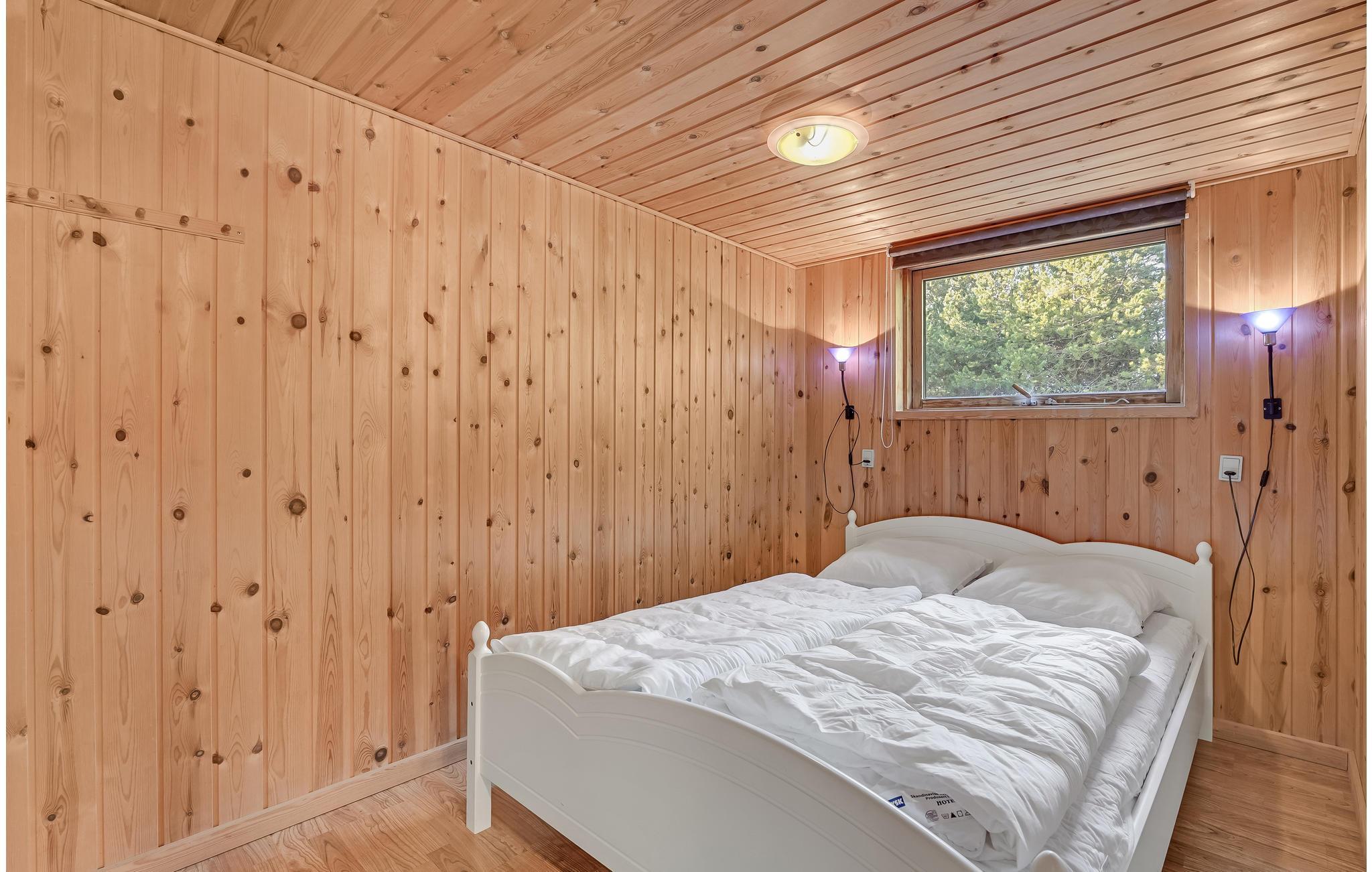 Ihr Ferienhaus in Kongsmark bietet eine einfache, aber gemütliche Ausstattung und eignet sich hervorragend für einen erholsamen Urlaub in der Natur. Das Wohnzimmer ist mit Holzwänden gestaltet und bietet eine angenehme Atmosphäre. Hier können Sie sich auf den bequemen Sofas und Sesseln entspannen oder die Aussicht durch die großen Fenster genießen. Der Essbereich ist direkt integriert und mit einem Kaminofen ausgestattet. Im Anbau befindet sich unter anderem eine Sauna, ideal für erholsame Stunden.