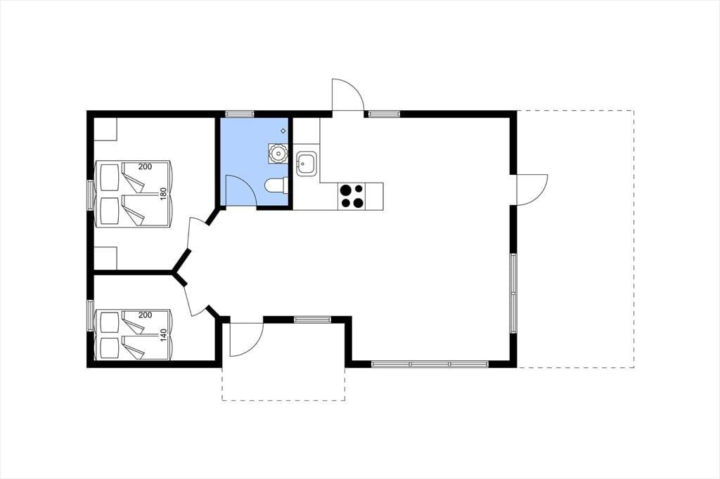 Willkommen in deinem Ferienhaus: Im Inneren erwartet dich eine offene Küche in Kombination mit einem großzügigen, hellen Wohnzimmer mit Essbereich. Hier ist Platz für geselliges Beisammensein mit der Familie, und das Wohnzimmer bietet direkten Zugang zum schönen Garten und zur Terrasse. Das Ferienhaus verfügt außerdem über zwei gute Schlafzimmer und ein funktionelles Badezimmer.