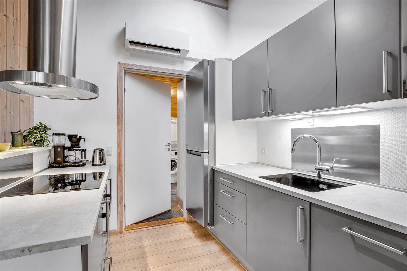 Die Küche ist mit Kühlschrank ausgestattet. Außerdem gibt es 4 Induktions-Kochzonen, Umluftofen, Mikrowelle, Airfryer sowie Geschirrspüler.